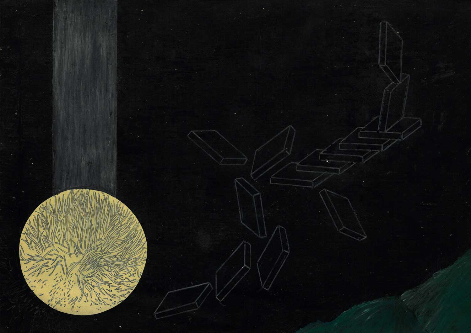 Os buracos martelados com uma marreta, no telhado pintado de branco, comprometendo-o; construído sem saber que ia sofrer e sujo com um lodo ‘desagradável’. Só conseguimos ver luz e os iluminados por causa destes buracos; com o Pedro, iluminamos este telhado através do espaço negativo, de dentro para fora — Destruir até acessar um miolo luminoso.