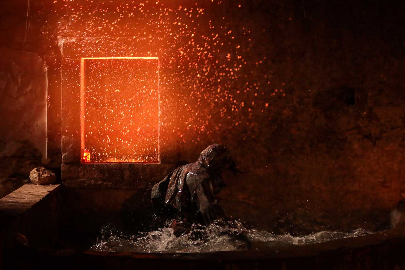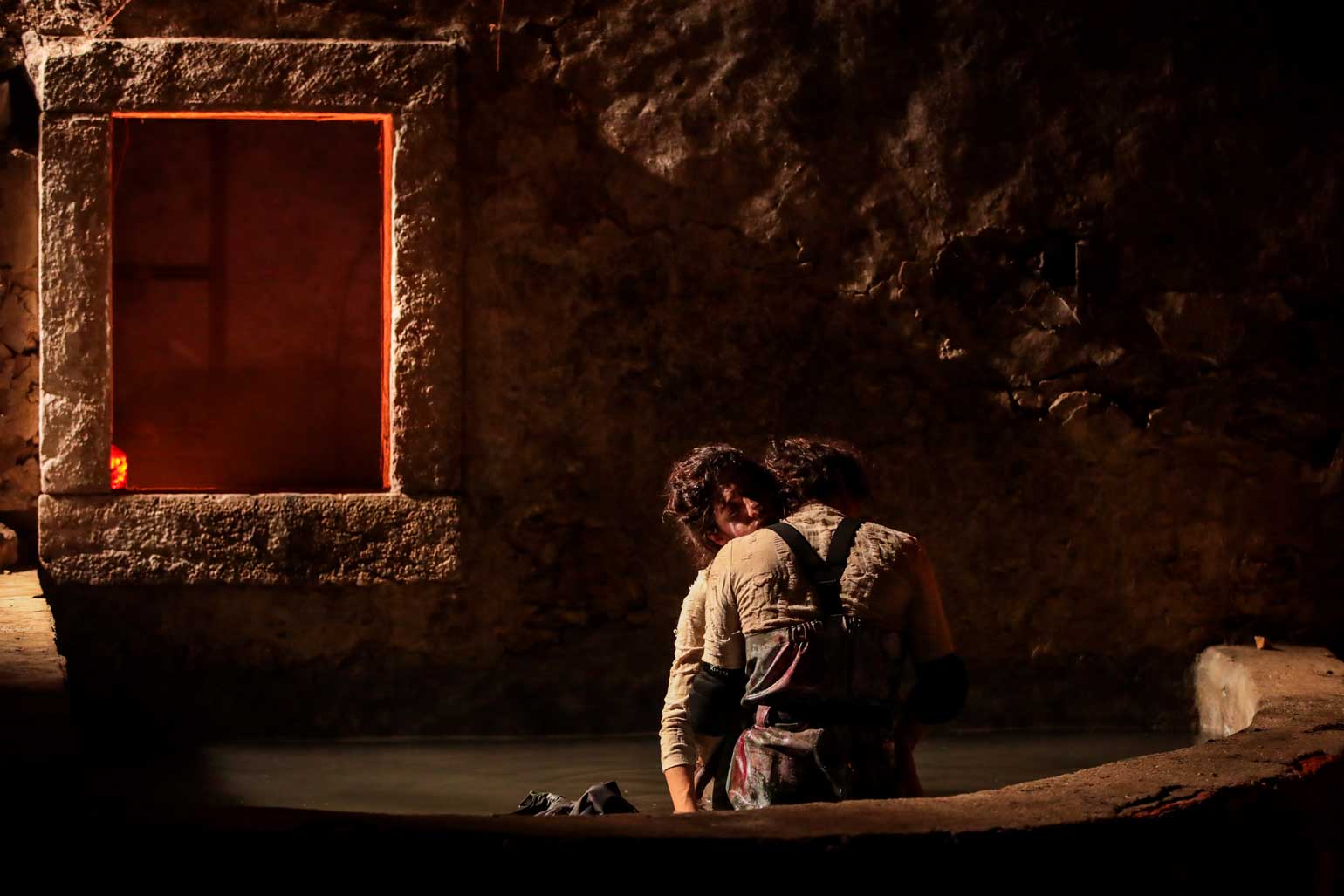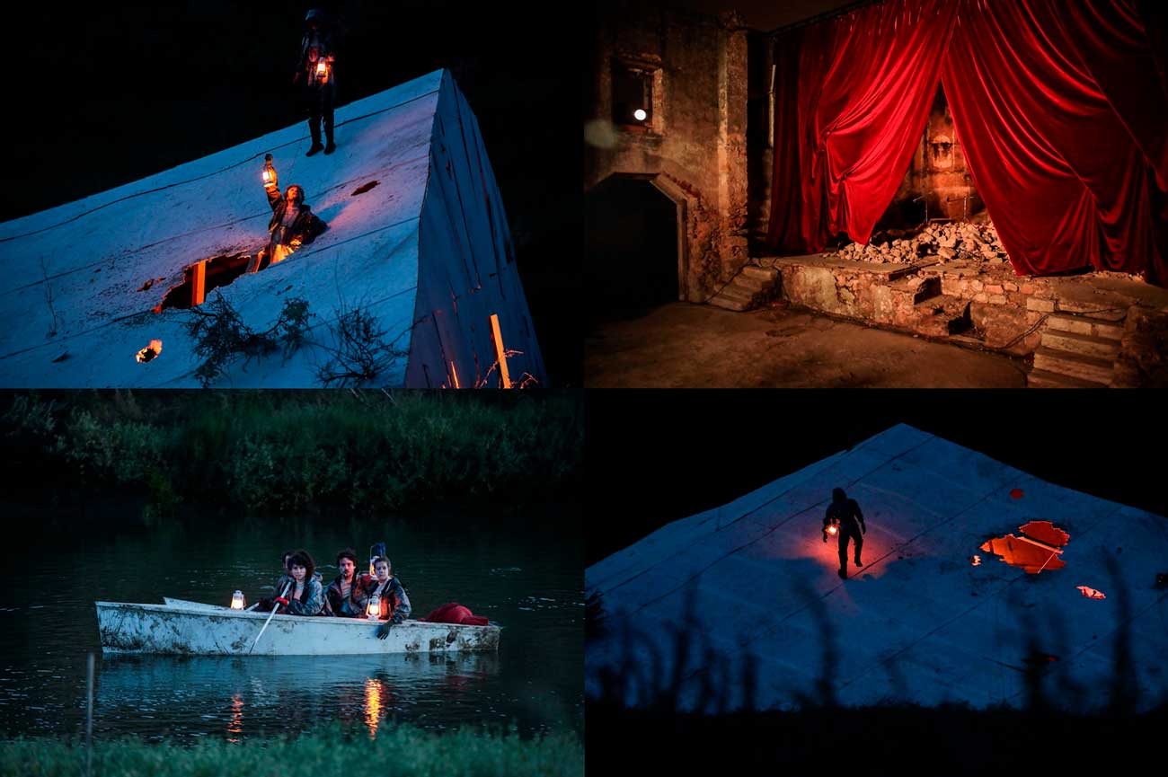 Quis muito que os elementos fossem incisivos, certeiros. Aqui, jogar com a escala parecia-me quase impossível de não fazer; não quis ganhar ao espaço e não quisemos enfrentá-lo; preferimos abri-lo, ver através dos buracos entre as pedras, ver o reflexo que o rio criava — Observar que o correr da água do rio e o esvoaçar das cortinas de veludo não estão nada distantes. Eu e o Sílvio passámos muito tempo juntos, conversávamos, e as imagens começaram a aparecer-nos; tempo importante para perceber como é que nos relacionávamos com estas pistas que surgiam e quais as resistentes. Quis que os elementos partissem dos meus desejos e afetos, que ajudassem o espetáculo mas que todos fossem portais; espelhos com o fogo, a cortina de veludo, o telhado esburacado, pintado com lodo, construído pelo Tiago. Bem…muitas coisas…Sim, sempre!