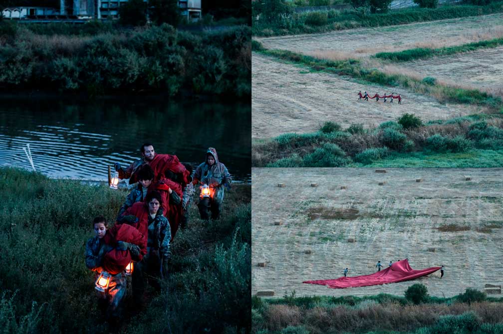 Isto sente-se. O espetáculo torna-nos peregrinos; seguimo-los (interpretes e elementos cénicos), movendo-nos no Vale, não como quem segue influencers, mas como quem depende da escala própria da Paisagem; ou do seu continuado desdobramento em diferentes escalas, no sentido de nos colocar verdadeira e infinitamente em relação — Vinculando-nos à Terra e elevando o olhar à vastidão do céu, entretanto, noturno, e ao seu imenso Aberto; i.e., num gesto, elevar o Horizonte do nosso Possível a Zénite, sem com isso abandonar o mundo. A pesar…uma “muralha de sangue”…
