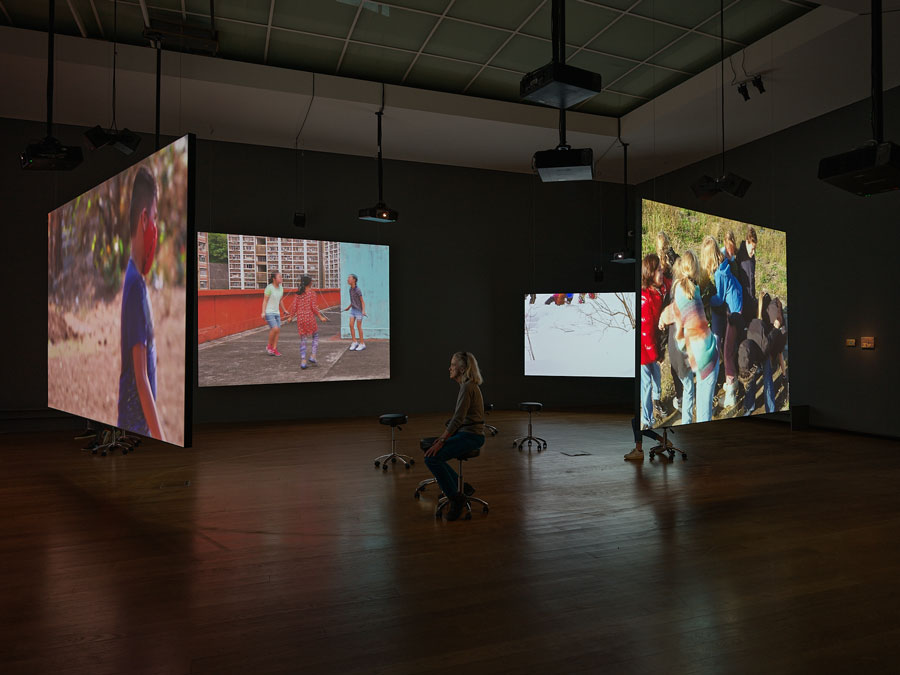 O primeiro momento expositivo, lança-nos numa experiência imersiva proporcionada pela cenografia do espaço, desde a baixa iluminação ao som elevado de crianças a brincar, cujos gritos, cantorias e interjeições se entrecruzam num mesmo momento. Deixamo-nos conduzir pelos seus risos infantis em imagens coloridas e vibrantes que se exibem em ecrãs grandiosos, que percorremos e contornamos como se estivéssemos num verdadeiro recreio. Filmados em vinte e cinco países, os vídeos conduzem-nos por uma viajem no tempo e no espaço - de Hong Kong, ao Afeganistão, passando por Londres ou Marrocos – e em todos reconhecemos a universalidade e a ingenuidade dos jogos infantis. Quais metáforas da sociedade pela óptica das crianças que nos levam a repensar a nossa relação com o espaço público e a cidade, os jogos em exibição caraterizam-se pela extrema simplicidade e por ocorrerem na rua, recorrendo as crianças ao ambiente e espaço urbano, enquanto instrumentos, para a concepção das regras das suas brincadeiras. Não obstante os momentos de felicidade pueril captados e retratados na série Children’s Games, muitos dos jogos foram filmados em zonas de conflito e de agitação social, durante eventos marcantes da história recente: desde a guerra no Afeganistão à pandemia covid-19, dando-nos o artista, nas palavras da curadora, uma visão desses gestos marginalizados na nossa esfera pública, bem como a responsabilidade psicológica de olharmos para essas crianças.