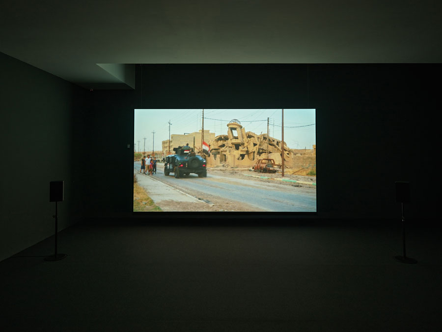 Numa sala isolada, assistimos na escuridão a um ato de resistência extraordinário de crianças em Haram Footbball (2017), filmado em Mossul, no Iraque, onde um grupo de adolescentes recorre ao simulacro e à invisibilidade ao jogar futebol sem bola, desporto proibido e banido pelo Estado Islâmico. Aparentemente inocentes, as imagens do jogo adquirem uma dimensão política e ativista ao serem acompanhadas por legendas que nos informam da execução pública levada a cabo por um pelotão de fuzilamento, do grupo jihadista Estado Islâmico, a treze adolescentes numa rua de Mossul, por assistirem na televisão a uma partida entre o Iraque e a Jordânia.