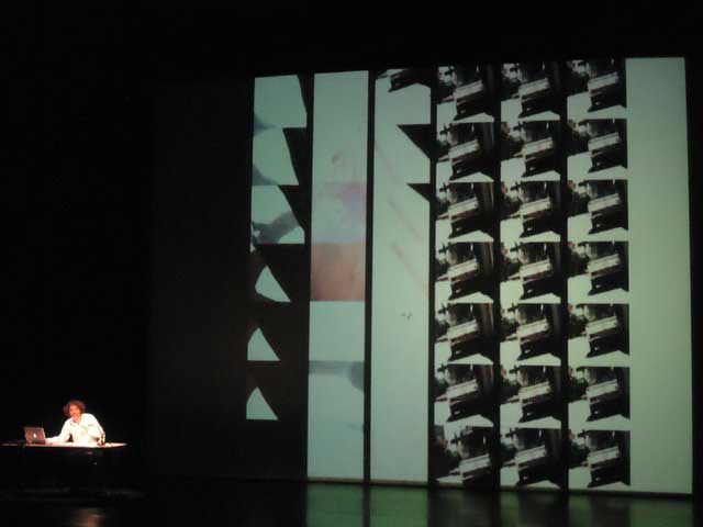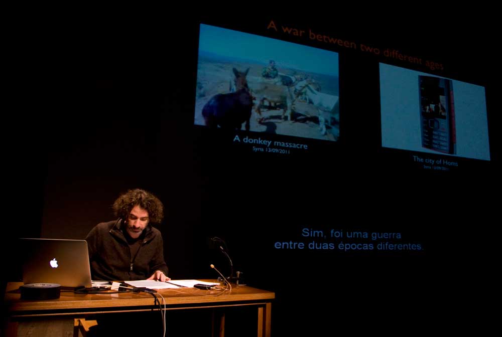 O AGORA QUE É LÁRITA XAVIER MONTEIRO2014-02-25É de longe, de muito longe que acompanhamos os nublosos conflitos do Médio Oriente. De longe, tão longe que o conhecimento mediado pelas imagens televisivas e os vídeos das redes sociais surgem casa dentro em situação quase ficcionada, quase inacessível. Como se os média perdessem precisamente essa justeza que é estar no meio. Entre a circunstância e o espetador. É de perto que o artista libanês Rabih Mroué acompanha a realidade da vizinha Síria. Mas é sobre a utilização, a narrativa e o poder dos instrumentos virtuais de comunicação que decide falar. A conferência-performance Pixelated Revolution [1] que apresentou em Serralves, exibe ao mesmo tempo que pensa os registos de acontecimentos em curso: a revolução Síria, os sírios, a morte. “Os Sírios estão a filmar a própria morte” Pixelated Revolution é uma palestra não-académica que estreou no P.S. 122 em Nova Iorque em 2012 e passou como projeto de instalação pela dOCUMENTA (13) de Kassel. Em Portugal, Mroué vem apresentando os seus trabalhos individuais e em dupla com Lina Saneh, desde Biokhraphia (2002), Who’s afraid of representation (2004), How Nancy wished that everything was an April Fool’s joke (2007), tendo também colaborado, em Yesterday’s Man (2007) [2], com Tiago Rodrigues para a companhia Mundo Perfeito. Todos se enquadram numa pesquisa sobre a representação do corpo-pátria libanês ou do corpo-estrangeiro em território de circunstâncias políticas problemáticas. A sua criação baseia-se na recolha de documentos e imagens pré-existentes, veiculadas pelos dispositivos de comunicação no espaço público. Talvez por isso tenha escolhido o discurso como modo eficaz de relatar essa experiência de reflexão. Mesa, cadeira, computador Apple MacBook, pequeno candeeiro, copo de água, folhas de papel impressas. Rabih Mroué entra de expressão séria no corpo descontraído. Senta-se na cadeira e inicia a leitura enquanto manipula as imagens e os vídeos projetados numa tela que ocupa todo o palco do auditório. Não deixa de ser curiosa esta desproporção entre a figura do intérprete-conferencista, ao canto, e a enorme tela que configura importância às ideias, imagens e vídeos comentados. E como se torna paradoxal que dos vídeos amadores que vai mostrando não restem senão caras pixelizadas, cuja identidade é diluída. Não identificada. A sangue-frio e com certa [e necessária] distanciação, o artista analisa o Facebook dos grupos revolucionários, incluindo vários vídeos amadores, tremidos e sem foque. É sobretudo “Double Shooting”, colocado online no Youtube, que nos obriga a ver. Frame a frame. Da habitual visualização rápida das plataformas sociais à análise exaustiva. Trata-se de um registo através da câmara de telemóvel de um homem que é atingido por um atirador quando percebe que está a ser filmado. Decerto não vemos o homem por detrás da câmara, embora possamos ouvir a sua voz. Anónimo. O olho da sua câmara viu o que depois se torna acessível à escala global na world wide web. O olho somos nós. Também não definimos os traços do assassino, ainda que todo o seu rosto – no frame super ampliado – se espalhe na tela gigantesca do auditório. Anónimo. No olho do furacão da civilização da imagem, estes vídeos destacam-se pelos seus elementos chocantes, perversos ou imprevisíveis. Muitas vezes tornam-se virais. Mroué quer tentar perceber, chegar à meta-narrativa. Portanto, recorre à metodologia dos cineastas dinamarqueses Vinterberg e von Trier que redigiram o Manifesto Dogma 95, colocando-o em paralelo com os modelos de filmagem dos revolucionários sírios: como filmar uma manifestação? Nesta guerra da imagem, ou guerra contra imagens, as câmaras móveis funcionam como armas de arremesso. Ainda que trémulas, permitem denunciar ao mundo fragmentos da violência praticada. Correm, errantes, são bípedes. Os homens e mulheres que as seguram testemunham a própria morte sem, no entanto, serem mártires. Sem que saibamos se o corpo-humano que está do lado invisível do corpo-máquina [implantado como prótese óptica, o telemóvel], sobrevive. Sabendo que alguém fez o upload daquele registo do corpo-máquina. Do outro lado, a estabilidade traduz-se nos tripés e nos aparelhos de alta resolução, símbolos da firmeza revestida do regime. Com momentos de uma lucidez crua, quanto incrivelmente irónicos [até cómicos, não fosse tudo tão trágico] a performance instiga mais do que esclarece. Aponta-se dos factos: a morte de mais de 130 mil sírios e milhões de refugiados, mantendo-se a guerra civil que mistura revolucionários com islâmicos fundamentalistas, iranianos, curdos, libaneses do Partido Hezbollah,…contra a milícia e o regime de Bashar al-Assad. Do olho da vítima ao olho da câmara, do olho do assassino ao olho da sniper há uma bala disparada. Faz um ricochete. Aponta-se diretamente ao espetador. “É muito provável que atrás desta janela estivesse sentado um snipper” Este agora de lá também se torna mais perto pelo que traz a exposição Preso por Fios [3] da artista tunisina Nadia Kaabi-Linke, com curadoria de Isabel Carlos e em exposição no CAM-Gulbenkian. Comovente e sofisticada na execução dos diversos suportes e materiais e na exploração do seu potencial teórico, a artista evoca perturbações do traçado histórico entre povos e culturas. Falando da simbologia dos israelitas e judeus escondida no belíssimo ready-made Smooth Criminal, do deslocamento imagético da instalação de vídeo Non e do apagamento da memória em Tunisian Americans. Neste contexto há uma obra recente que me prende a atenção. Snipers (2014) mostra a impressão de uma parede de Berlim – cidade onde a artista atualmente vive e trabalha. Marcada de balas, alude ao passado da II Guerra Mundial e simultaneamente enuncia a história recente da Tunísia. Na sinopse tam