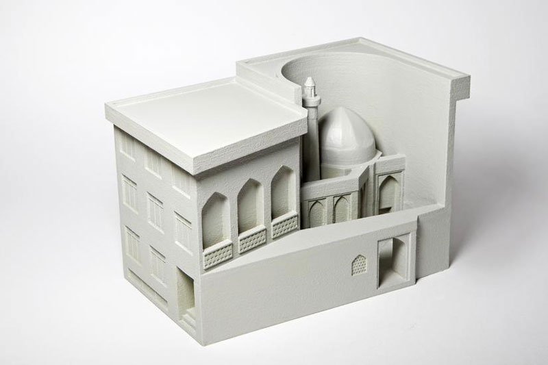 Nazgol Ansarinia. Residential building with front shops, mosque with courtyard on Sayad highways. Fabrications, 2013. Em colaboração com Roozbeh Elias-Azar. Gesso, resina e tinta.