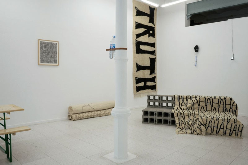 Entre muitos outros casos posso falar-te também do “hahahaha” presente em algumas peças, que, na realidade, começa com “ahahahah” e logo se converte em “hahahaha”. Nasce de outra história, onde o protagonista faz um golpe no joelho com uma mesinha em frente ao sofá. Ele está de ressaca e, ao magoar-se, começa a queixar-se de dor: “ahh ahh ahh!”. Pouco a pouco transforma-se num “hahahahahahhaha!!”, como uma estratégia de lidar com a própria dor. Claro que esta história e todas as outras são exemplos que abordo nas performances, e que, pelo seu caráter/ formato, têm um resultado muito diferente do que simplesmente descrito. Mas isto para dizer que, realmente, contar histórias faz parte daquilo que faço e muitas vezes, as peças expositivas têm a função de arquivo, de sketch, de fragmento para não me esquecer da história.