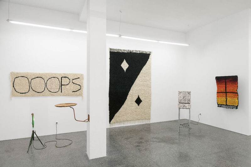 A ideia de criar tapeçarias surgiu por casualidade, através de uma viagem que fiz a Marrocos, em 2012. Na verdade, fui numa viagem de surf, mas durante uma semana em que não havia previsão de ondas, eu e um amigo decidimos fazer uma viagem pelo atlas, onde tive a oportunidade de ver e conhecer cooperativas, lojas e mercados com uma enorme variedade de tapeçarias. Foi ali que comecei a pensar na possibilidade de criar umas peças utilizando esse formato - pela sua associação e relação ao ato de contar histórias. Percebi que esta forma de arquivar, nas tapeçarias, todas as ideias que apresentava nas performances, fazia muito sentido, como um objeto que atravessa gerações, que é utilizado e que envelhece com o rasto das pessoas que convivem com ele. Depois desta viagem terminada, a ideia permaneceu e, passado cerca de um ano e meio, decidi lá voltar com a intenção de tentar materializar esta ideia. Desta vez, claro, com mais pesquisa de antemão, acabei numa região onde se trabalha muito com roupa usada misturada com lã nos tapetes, numa técnica chamada boucherouite. Interessou-me tentar criar estas peças que são tecidas com roupa minha, roupa de amigos meus, roupa encontrada (e que acaba assim por adquirir um valor extra, existindo também uma história por detrás de cada peça de roupa). Foi nesta viagem que encontrei e conheci uma comunidade na região de Azilal e desde então que trabalho com eles. Inicialmente, o objetivo passava por aprender a tecer, para poder fazer eu mesmo as tapeçarias. Aprendi então as bases técnicas e, com o passar do tempo, fui-me apercebendo que as famílias que vivem nestas comunidades, queriam e realmente precisavam de trabalho. Foi assim que construímos um intercâmbio: eu aprendi a técnica e executo, apesar das mulheres destas famílias me ajudarem com grande parte do trabalho (elas riem-se de mim de cada vez que começo a tecer, porque sou sempre muito lento).
