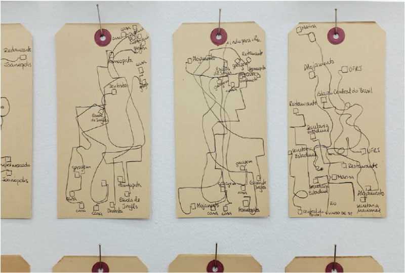 A Sociedade do Cansaço e do desvelo exagerado (HAN, 2005) e, por que não pornográfico, em sua dinâmica quotidiana em busca do espelho de Narciso tem provocado profunda exaustão do ímpeto criativo na vida, de maneira mais abrangente e, do ponto de vista da criação, na arte contemporânea. Por vezes, a forma relacional que Bourriaud (2009) propõe entre o ato artístico e o receptor resulta num círculo de incompletude da fruição que esvazia o domínio da técnica e a volição da forma. Admitamos que, num mundo de crises da identidade ontológica conflagradas, cujos seres erram a esmo com certezas vazias e perguntas mal formuladas, o aparato “arte” tende à repetição que não faz eco; à incisão que não provoca sangramento; à descarga de ímpeto que se choca com sensibilidades moucas. Em meio a isso, pela primeira vez em exposição na galeria Espavisor, em Valência, Espanha, a obra da brasileira Ana Amorim propõe uma discussão multifacetada do ambiente artístico, das apreensões estéticas e do próprio organismo da Arte. Ana não é uma artista que se preocupa com a palpabilidade do ofício da criação para efeitos imediatos ou fins utilitaristas. O trabalho ora exposto é fruto de um processo que lhe consumiu, às vezes com intermitências, outras vezes com pragmatismo, os últimos trinta anos. Dessa forma, não é exagero especular que a esta altura, vida e obra já lhe formam uma amálgama indissociável e intransferível, tal qual um nome, um número de documento ou linhas de uma biografia. Algo muito próximo de uma estética situacionista, que é o aspecto que mais rápido salta às vistas do atento espectador. Nascida na cidade de São Paulo, em 1956, Ana Amorim se graduou, nos anos 1980, na renomada escola de artes da Fundação Armando Álvares Penteado (FAAP), onde lecionaram figuras icônicas da arte brasileira, como Nelson Leirner e Regina Silveira. Em seguida, partiu para os Estados Unidos para iniciar um projeto de mestrado. A poética que propunha consistia na realização de mapas mentais desenhados em livros, sempre ao final de cada dia. Em seguida, a artista transferia os mapas para diferentes suportes, reproduzindo sua impressão dos caminhos e das rotinas vividas, transpostos para o papel como a cristalização do típico viandante de uma grande metrópole. O projeto, intitulado 10 Year Performance Project, iniciado em 1988, teria a duração de uma década e formaria não só o inventário de uma arte urbana e desprendida, mas abduziria para o suporte artístico a vida mesma. Por esse motivo, mencionei o Situacionismo de Guy Debord há pouco, porque é entre a vanguarda das artes conceituais e dos processos imbricados que se situa a chave de interpretação para a imensa produção de Ana. Debord, em seu manifesto de 1960 urge aos artistas que se livrem das cisões que existem entre aquilo que se produz e aquilo que se vive. Em Ana Amorim, talvez pelas influências de figuras como Vito Acconci e Richard Long, não existe margem para a distinção entre a atitude estética e a visão de sobrevoo, de contatos superficiais. O que há é um convite à entrega, à reflexão de um estatuto muito maior, que transcende processos limitantes e puramente objetivos. Preocupada com a forma pessoal de documentação do tempo, perenidade da memória e concreção de uma vida-arte, Ana ainda incorporou mais um elemento à sua poética, a performance. Com Counting Seconds, título da ação, passou a ocupar locais públicos com uma caneta em apostos uma folha em branco para lhe servir de súmula. De tempos em tempos, punha-se a contabilizar o número de minutos transcorridos durante sua permanência nesses locais. Criou um sistema simbólico com a finalidade de catalogar aquilo que para um benjaminiano “homem da multidão” se esvai à revelia: a corporeidade do tempo. Seus mapas e suas coordenadas temporais fundem-se, assim, para criar um organismo maior, uma unidade que suplanta generalizações históricas.