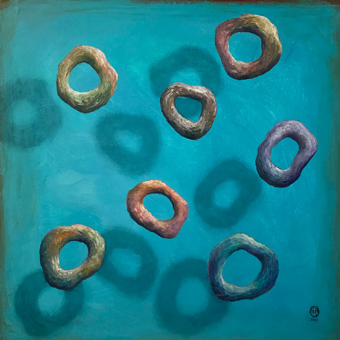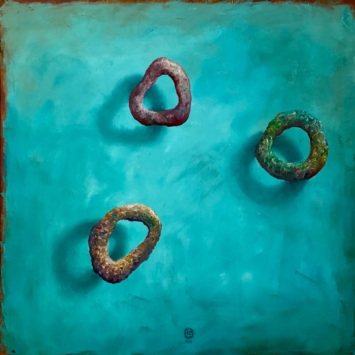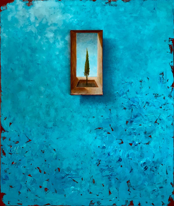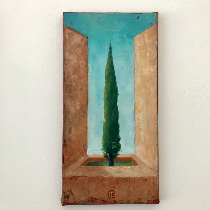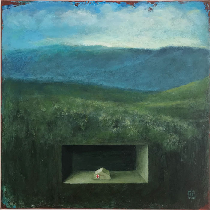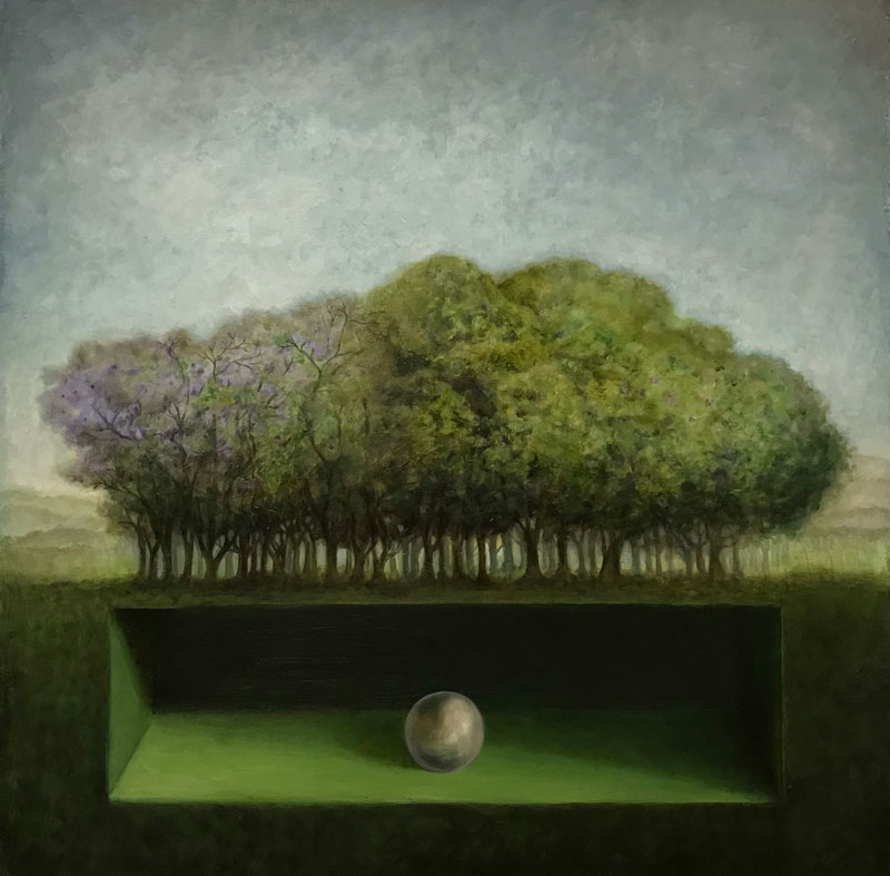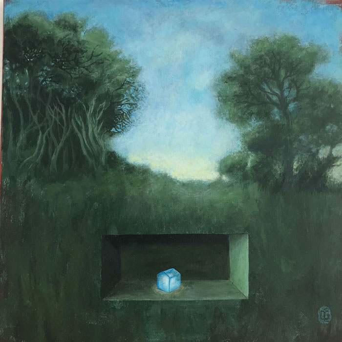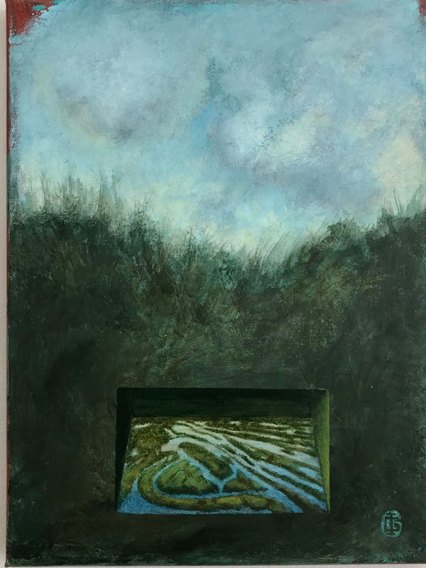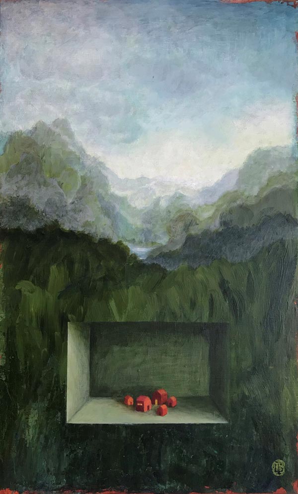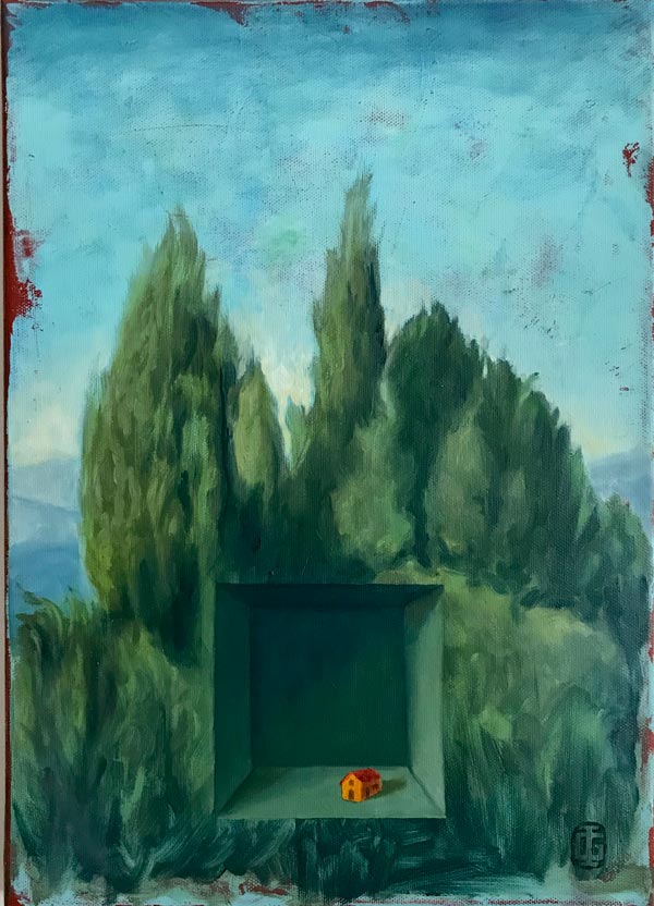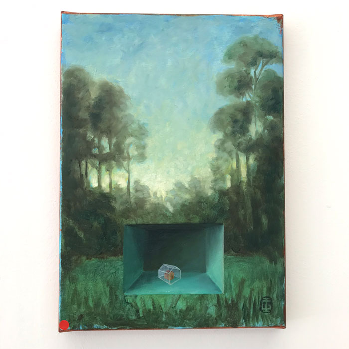 Quando me foi dado vê-las, verifiquei a revisitação da tradição da pintura de paisagem e das ilusões ópticas do trompe l’oeil. Nestas «Sementes flutuantes», os fragmentos circulares de sementes são artificiosamente pintados em tridimensionalidade contra um fundo azul-céu parecendo desprender-se do suporte e disseminarem-se no espaço. Na série «Another green world», que evoca a música ambiental do músico e artista visual Brian Eno, vemos buracos ou esconderijos protectores em paisagens estranhas de florestas e céus tormentosos. São pequenas zonas de aconchego onde se abrigam ciprestes e pequenas casas, fontes ou rios. Estes elementos alegóricos podem ter várias leituras. Por exemplo, das árvores nascem sementes. E as pequenas casas onde habitamos são os nossos lares e o lugar da família, unidade fundamental, onde se trocam e se semeiam afectos e ideias. Por seu turno, as fontes e os rios são elementos na natureza de transporte das sementes e factores de propagação e germinação.