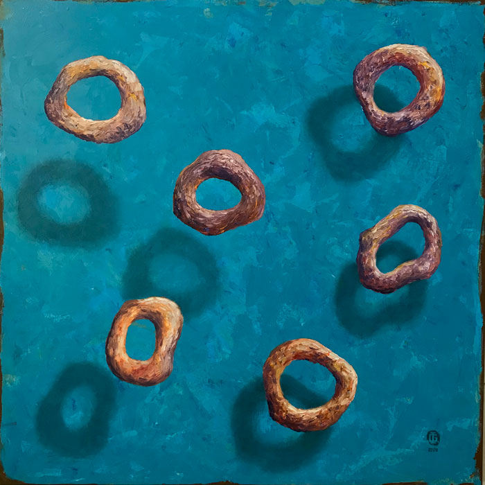 É estimulante encontrar algo inesperado e que nos dê esperança num momento em que nos encontramos encerrados nas nossas habitações, com limites de horários e de deslocações, impedidos de ver e abraçar familiares e amigos, ou com essas relações reduzidas a breves encontros. Falo dos recentes trabalhos de Isabel Garcia, realizados em plena pandemia e mostrados na exposição SEMENTE/SEED, ocorrida entre 5 de Setembro e 2 de Outubro deste ano, na Galeria Arte Periférica no CCB em Lisboa. Aí teve a artista em exibição um conjunto de pinturas e pequenos objectos-esculturas. Por essa altura, estávamos ainda no Verão, saídos do confinamento mais duro e antes, portanto, de assistirmos à segunda vaga que nos levou ao actual período de isolamento. Isabel Garcia não registou explicitamente nos seus trabalhos qualquer indicação de estarmos em pandemia, nem tal seria necessário, pois já nessa altura estávamos expostos através dos media a longas horas de informação. Facilmente encontramos, porém, na metáfora da SEMENTE o seu modo de falar da doença e da morte, mas também da vida, sobretudo daqueles – os excluídos – que, nesta pandemia, mais sofrem. A verdade é que SEED coloca uma problemática universal e quotidiana, apesar de à primeira vista aparentar ser apenas um tema unicamente de investigação científica. Com efeito, o mundo das sementes e das plantas é também objecto de pesquisa histórica e até alimentar, no contexto do chamado «imperialismo ecológico» (Alfred Crosby) devido ao comércio global de sementes e plantas que modificou completamente os hábitos alimentares e as práticas agrícolas do mundo inteiro. Plantas asiáticas multiplicaram-se na África e nas Américas e, inversamente, as plantas americanas difundiram-se noutros continentes (J. Mendes Ferrão, Le Voyage des Plantes et les Grandes Découvertes, Chandeigne, 2016). Actualmente, as sementes são objecto de largas discussões pois estão em causa as modificações genéticas e a redução da biodiversidade. Foi também sobre uma premissa histórica que a artista desenvolveu o projecto SEED/SEMENTE, declarando-me que «o mundo sem sementes seria um gigantesco penedo nu, sem vida a deslocar-se no espaço». Do grego «sperma» e em latim «sémen», a raiz etimológica da palavra não esconde a relação com a natureza e a vida, através da reprodução das plantas e animais. As sementes são estruturas fundamentais para a nossa sobrevivência e responsáveis por garantir a dispersão das espécies no ambiente. Daí que a série de pinturas «Floating seeds» de Isabel Garcia lembre os complexos processos de transporte e dispersão das sementes, por vezes a grandes distâncias, pelo vento, pela água ou por organismos vivos ou até sem a ajuda de nenhum agente externo (autocoria), garantindo assim que as plantas possam germinar e desenvolver-se em diferentes locais.