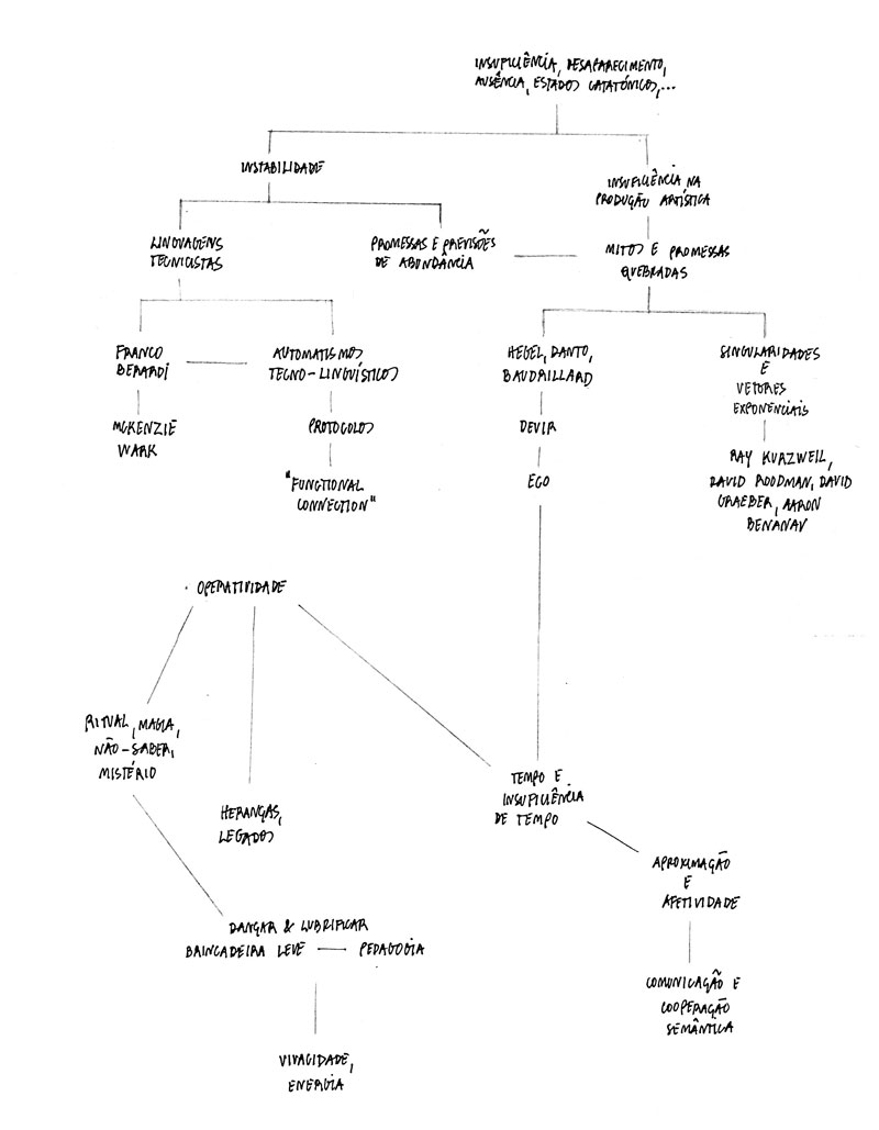 II - Manifestações Uma das primeiras questões que Vítor Grilo Silva mencionou quando confrontado com a premissa aqui apresentada, foi a questão da operatividade dos objetos, ou a falta dela. Esta operatividade, “qualidade do que é operativo, do que está pronto para utilização”, é hoje escassa na relação que detemos com a produção artística. Falar de operatividade é falar de ativação, de ligações e relações estabelecidas, ou pelo menos da possibilidade de. Entre sujeitos e objetos, mas igualmente entre sujeitos e outros sujeitos. Operatividade pode facilitar uma interação bem como uma cooperação, sendo que existem operações e espaços que só podem ser alcançados ou ativados, coletivamente. Esta operatividade pode assim ser, a arena das ações e relações. Pensar segundo a perspetiva da operatividade, significa pensar de forma distinta das heranças que nos chegam. Heranças que determinam modos específicos de interação e de execução. Heranças que definem como determinadas aproximações devem ser feitas, como certas interações devem acontecer, e que construções, obras, objetos, trabalhos e projetos podem ser apresentados, ainda que dentro de uma narrativa que o contradiz e que tudo afirma contemplar. Olhar para esta questão a partir da perspetiva da operatividade permite-nos dar prioridade a um conjunto diferente de valores e objetivos, distintos das formalidades e preocupações utilitárias. Utilizemos uma analogia: o processo de refinamento tende a concentrar e reduzir. A perpetuar e a repetir. Condição necessária à reprodução de um determinado conjunto de características. Esta repetição tende por sua vez a proteger e a sacralizar – processos expectáveis, simbióticos e mutuamente necessários. No entanto, a condição natural de uma edificação heterogénea, para além de uma contínua reprodução, necessita de uma resistência que procure assegurar que esta edificação se expande para lá de si mesma, evitando terminar-se, estabelecendo um equilíbrio entre expansão e preservação. Assim nos chegam heranças e legados. No final de umas das suas obras mais recentes, McKenzie Wark dirige-se à importância de spoken-only languages. Spoken-only languages são hoje, segunda a autora, substituídas por linguagens técnicas que passam a operar enquanto linguagens de produção. [6] As heranças que nos chegam são em grande parte linguagens tecnicistas, dotadas de imanência, que se sobrepõem a linguagens quotidianas, não-tecnicistas, não mecanizadas, o que se verifica dentro e fora do espaço artístico. No mesmo ano, 2019, Franco Berardi falava de algo semelhante quando se referia a automatismos tecno-linguísticos. Em “Futurability: The Age of Impotence and the Horizon of Possibility”, o autor focou-se nestes automatismos que, dizia, procuram automatizar todo o espaço de produção e cognição, simplificando relações sociais e substituindo atos afetivos. [7] Processos de automação e a tecnicização usurpam o espaço da cognição. Em ambos os casos, experiências de conjunção social são substituídas por conexões funcionais. [8] Quer as linguagens não técnicas, quer este entendimento de operatividade, existem em oposição a uma redução ou fechamento – dos objetos, das relações que podem ser estabelecidas e da linguagem. Ambos estes aspetos, que prosperam no domínio do mundano (que é o do mundo), não se regem por um objetivo último de utilidade. Tal não significa que toda a tecnicização seja inerentemente negativa, mas sim que a dispersão global de linguagens estritamente técnicas, uniformiza e limita. Contrariamente, Vítor demonstrou-se mais interessado numa noção de aproximação, de cuidado e afetividade, de languages of care – hoje tão obviamente fundamentais e necessárias de serem de priorizadas – dentro da sua prática. Este conjunto e desenvolvimento de fenómenos ao longo do decorrer histórico, impedem uma certa “penetração no objeto”, ou uma forma “de aceder objetos”. Constituem e confluem por isso num enquadramento segundo o qual se estruturam modos pré-determinados e tendenciosos de leitura, perceção e relacionamento. Não se trata de “acessibilidade, mas do acesso aos objetos” que poucas vezes acontece, e quando acontece nem sempre é da forma mais interessante. Este enquadramento gera, naturalmente, um saber e uma referencialidade – fundamentais para um processo de desenvolvimento e edificação – que podem criar, simultaneamente, uma “herança sacra” difícil de se manusear. Esta é uma generalização complexa, mas não há nestas heranças uma negação de entretenimento? “As pessoas andam mal, as pessoas andam tristes.” Onde está a energia, onde está a alegria?! “Todas as investigações são vãs se não anseiam a alegria” recordava Vítor ao citar uma frase do projeto “reciprocity” de Diogo Branco e Helena Carneiro. E aqui, Vítor falou-me do mistério enquanto prisma para pensar. Neste caso mistério pode, e talvez deva, ser pensado e equacionado a outras palavras, como magia, ritual, ou até a não-saber. No decorrer das conversas que tivemos sobre esta problemática, por mais do que uma vez procurou-se considerar o tópico de insuficiência em relação a outros tempos (outras relações e linguagens), que acabou por desaguar no espaço do ritual e mito. O ritual primordial opera a partir da dança, da magia, do trânsito, da fruição, da diversão e de um outro tipo de pedagogia. “O que é que aconteceu ao mistério?” – perguntava-me Vítor Silva. O mistério foi “uma pulsão que se perdeu”, mas uma relação “que pode ser refeita”. Conceber a magia ou o mistério como metodologia, poderá parecer ser uma conceção descabida, mas não mais descabida do que achar que não existe qualquer tipo de insuficiência no espaço da produção artística, ou achar que o que vigora não precisa de qualquer ânimo,