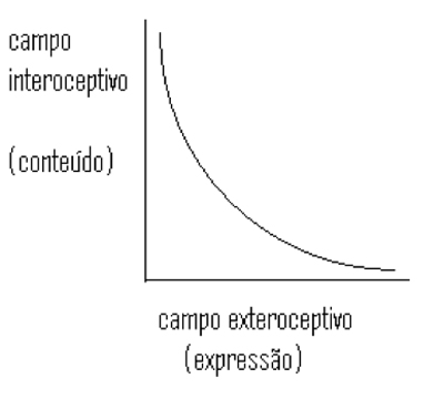 Como vemos no gráfico acima, o campo do conteúdo, chamado interoceptivo, expressão adotada pela semiótica a partir da fenomenologia (assim como exteroceptivo), e o campo da expressão exercem entre si correlações inversas. Isso quer dizer que toda vez que é dado enfoque, por usos de isotopias, recursos visuais, entre outros, ao plano do conteúdo, diminui o enfoque no plano da expressão; entretanto, quando a expressão é enxertada de valores diversos, o plano do conteúdo que se vê esquecido, diminuído. Assim, temos que, caso eu diga ritmicamente, ou seja, numa certa velocidade e sem variações café com pão Talvez, ao ouvir essas sequências sonoras, venha à mente do nosso interlocutor com muito mais facilidade o som de uma locomotiva do que a informação sobre o que haverá em seu lanche da tarde. Eu repeti termos do plano da expressão (determinante) e o plano do conteúdo (determinado) perdeu seus efeitos de visibilidades (um café fumegante e um pãozinho crocante por fora e macio por dentro, por exemplo). Acontece que a ênfase em um ou no outro plano não se subsume apenas a efeitos estilísticos ou comunicacionais; há diferenças na circulação de poderes, de estratificações, segundo a valoração de um plano da linguagem em relação ao outro. O plano do conteúdo é o das visibilidades, Deleuze, no seu livro Foucault daria como exemplo de uma forma do conteúdo a prisão, onde o prisioneiro não vê mas é visto, ou seja, as visibilidades estão em jogo. Uma forma da expressão seriam os enunciados jurídicos, por exemplo.