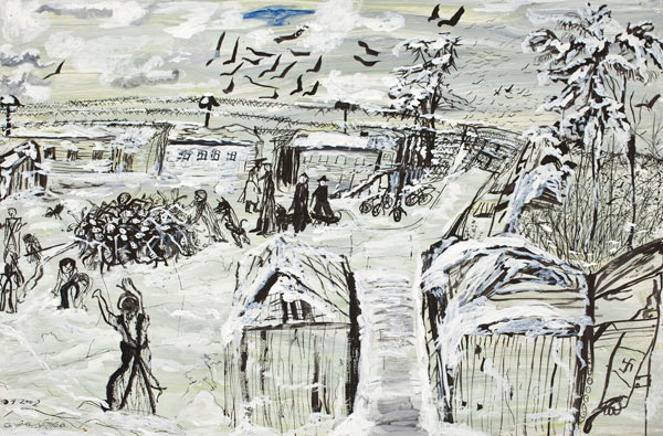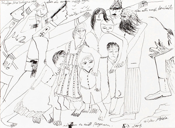 Die Züge sind schon voll, aber die müssen noch rein. Weiter, los, los! Los, alles nach Auschwitz! (...), 5.3.2005. Colecção Hojda e Nuna Stojka, Viena. Cortesia: Ceija Stojka International Fund