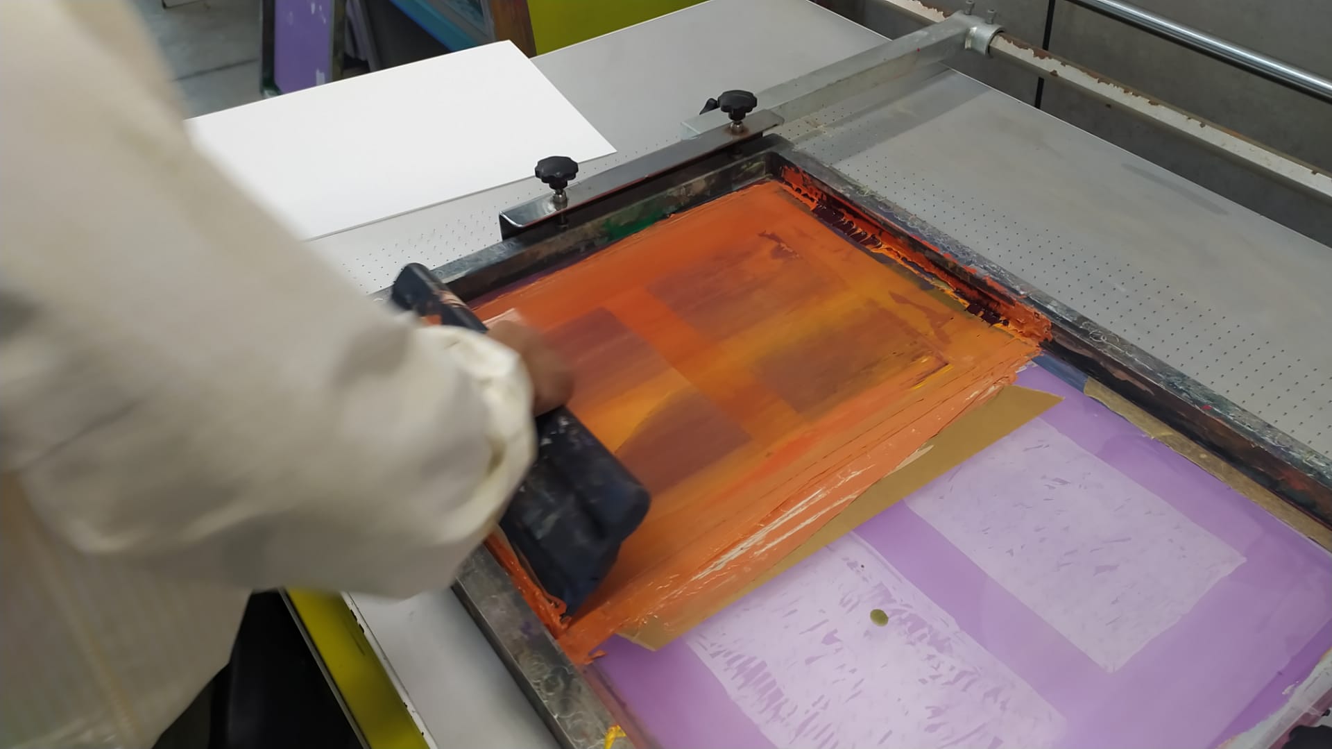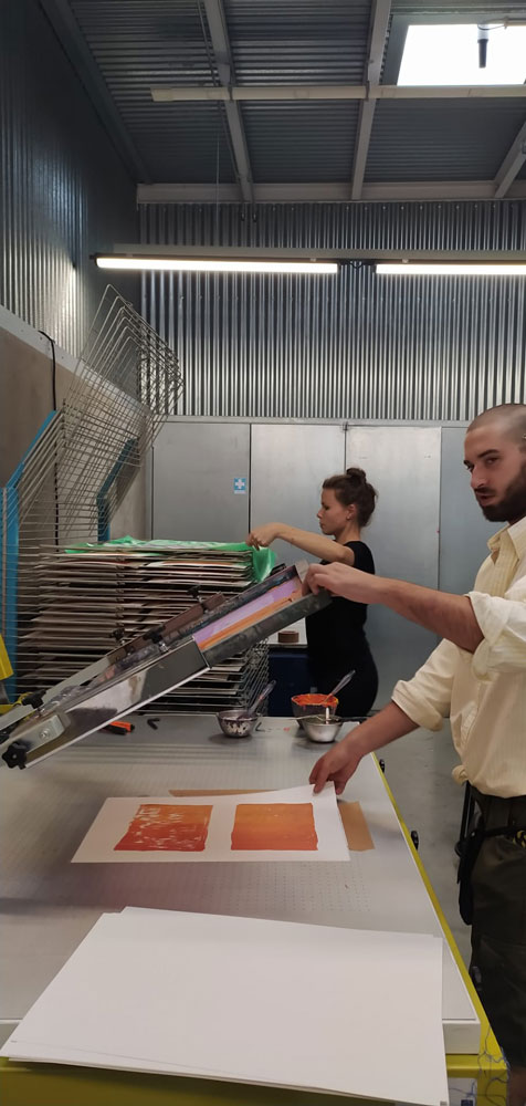 Escolher o lugar do discurso para descrever uma experiência de trabalho que se interliga com os vários estares - das técnicas, dos artistas, e também dos projectos que se interligam - é um exercício ambíguo: onde deverá estar a minha voz? Se relato algum poderá ser neutro - porque o ver está cruzado com os olhos - o relato onde para além dos olhos se encontra o corpo, e no corpo, o trabalho... como poderá acontecer? Para que a monopolização desta partilha seja mais moderada, tentei-me conter na minha colocação, que já cá estaria de alguma forma, pelo que a voz talvez seja vacilante e dialogue com a proximidade com as pessoas. [Qual será, de facto, a distância da pessoa ao artista...?] Divaguei no levantar de questões em que posso pensar a partir da experiência: O que ganham os artistas - perdão, os pintores! -, em estar juntos em períodos curtos de tempo (no caso, a residência organizou-se em duas semanas de trabalho, cada uma delas dedicada a uma das áreas das técnicas de impressão) para desenvolver trabalho artístico? E o que ganham as áreas disciplinares em serem ocupadas - ou absorvidas - neste modelo? A exigência do conhecimento simultâneo de possibilidades relacionais várias, com os outros, e com as matérias, para além da inclusão num ritmo gerido entre os mesmos elementos é - salve-se a redundância - exigente. Condicionar os modos de trabalho, mas também os modos de relacionamento, é de facto produzir um experimento que não aconteceria de outra forma - ou proporcionar as condições para que o experimento se dê sozinho. Será uma experiência social, também esta, de realizar uma residência artística intensiva em que se impossibilita a fuga? Pintores juntos em oficina, e juntos à mesa, sem diálogos de outra ordem que não a da pintura. Será? Pintores em auto gerência a encontrarem o equilíbrio entre a distribuição das tarefas de índole doméstica - quem cozinha, não lava a loiça, é sabido - e a delimitação territorial das áreas de trabalho. Esta cor... partilho-a? Esta imagem de teste, pode ser imediatamente reutilizada pelo próximo? A dominação de um ritmo é um exercício de poder absoluto. E aqueles que primam pelo controlo dessa possibilidade (será também assim? ou escreve-se do lugar de fora do mundo?) para si próprios são os mesmos que encontram constrangimentos de outra ordem: o limite das folhas. Porquê ainda... produzir imagens? E para quê colocar esta pergunta aos que nela ou dela não encontram saída. A resposta: a incapacidade de parar de as fazer, pensar, sonhar.