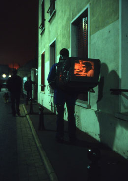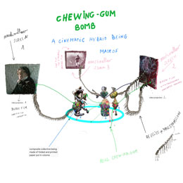 Num mundo cada vez mais formatado e massificado, Marie mostra-nos ser mais avant-garde que nunca – relembro agora o momento em que ouvi Sandro Aguilar dizer a Marie “Taking pleasure, and being able to do it with the minimum of conditions, and to do it directly, it’s being the most modern and the most updated filmmaker possible, in our days.” [4] Vinda da pintura e apaixonada pelo cinema mudo de Georges Méliès, os seus "tableaux vivants", como lhes gosta de chamar, foram uma forma de passar da pintura ao movimento, brincando com a magia das (não) narrativas espontâneas, como rasgos de cores e sonhos delirantes: desenham-se as cenas, prepara-se o ambiente, e depois convidam-se as personagens a entrar. Na pintura ou no cinema, do negativo ao positivo, em monótipos ou na película – o que sai é sempre uma surpresa – "está lá tudo, e é belo".[5] O trabalho desenvolvido ao longo dos últimos dois anos proporcionou a concepção desta exposição criada pela artista em parceria com o seu colega e amigo David Legrand, companheiro de projectos, parceiro de sonhos, aliado na teatralidade e performatividade do trabalho – arte – escolha – vida. David Legrand, um autêntico agitador foi um dos criadores do projecto "La Galerie du cartable", que também foi apresentado numa performance interactiva, e que continha um filme feito por ambos numa mochila que se torna um cinema portátil, abrindo-se como uma câmara antiga. A premissa para esta exposição foi pensar como expor o trabalho de Marie fora do contexto da sala de cinema; e há muitas oportunidades e possibilidades que se abrem em termos de materiais, de formas de expor, de aparatos ou artifícios que complementam e expandem os filmes da realizadora. Surgiram elementos e ideias que se aproximam muito dos cruzamentos que a própria galeria procura trabalhar e com a programação do Festival. Entramos num território que nos leva aos primórdios do cinema e ao burlesco, trazendo um certo humor e uma teatralidade excêntrica – e isso veio também a verificar-se nas escolhas da programação paralela. Começamos o percurso da exposição com uma série de desenhos, elaborados propositadamente para a galeria e para este contexto. O próprio suporte é muito delicado e esse é também um lado de Marie –- esse território da fragilidade – que ela trabalha e assume, acolhendo tudo e todos na sua alegre loucura – sendo ela mesma essa alegre loucura. Na primeira sala encontramos obras de David Legrand que ganham uma enorme dimensão plástica e escultórica com três figuras colocadas no meio da sala que se ligam, por tentáculos, às três projecções –- são seres de uma nova era, figuras que se transformam e que mantém tudo à sua volta vivo, ligado, a respirar. Desde o diálogo fictício entre Marguerite Duras e Roland Barthes aos elementos plásticos e constantemente mutáveis, este é um lado que interessa muito a David Legrand – a performatividade, a encenação de vozes, a metamorfose contínua. Seguimos, e entramos cada vez mais no mundo de Marie: um cenário de ópera, a galeria moldada para um modo de pré cinema, onde caixas de luz e modos de fazer cinema mais arcaicos nos transportam a lugares que a própria realizadora explora no seu trabalho, e que estiveram muito presentes na forma de trabalhar e construir a exposição. Desde panelas que relembram os círculos de Chaplin e que encerram a imagem naquela roda viva, às cortinas com uns olhos bem abertos, melancólicos e perguntadores, passamos por confettis que nos convidam a juntar-nos à festa e quase, quase a comer o bolo. Conseguimos ouvir todo um conjunto de elementos sonoros, de diferentes trabalhos, que se juntam e que se tornam numa selva – festa. Fazemos o percurso pelas salas da galeria, como se Marie nos guiasse, enquanto se ri, divertida, quase como se estivesse a deixar marshmallows pelo chão – e nos levasse para onde quer, para todo o lado. Marie percorre o poema, desperta as aves e os animais, dá música e festa a todas as coisas, abre-nos lugares onde todos os delírios são possíveis. Filmes loucos e filmes sérios. Filmes loucos e sérios. Numa tensão latejante entre a dor e a alegria, Marie transporta-nos, transmuta-nos, transforma-nos, transcende-nos. Transborda, transgride. Transita e transfere.