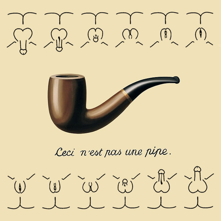 [*] Imagem: Cruzamento de uma imagem da obra de René Magritte intitulada "A Traição das Imagens" com dois frisos em cima e em baixo, em ordem especular oposta, que representam a escala Quigley para variações de intersexualidade produzidas por alteração genética. |