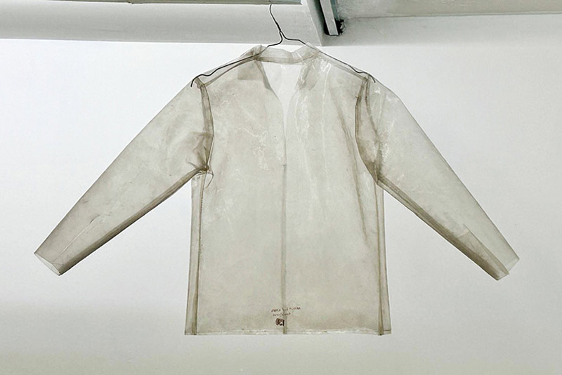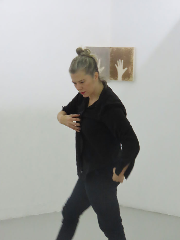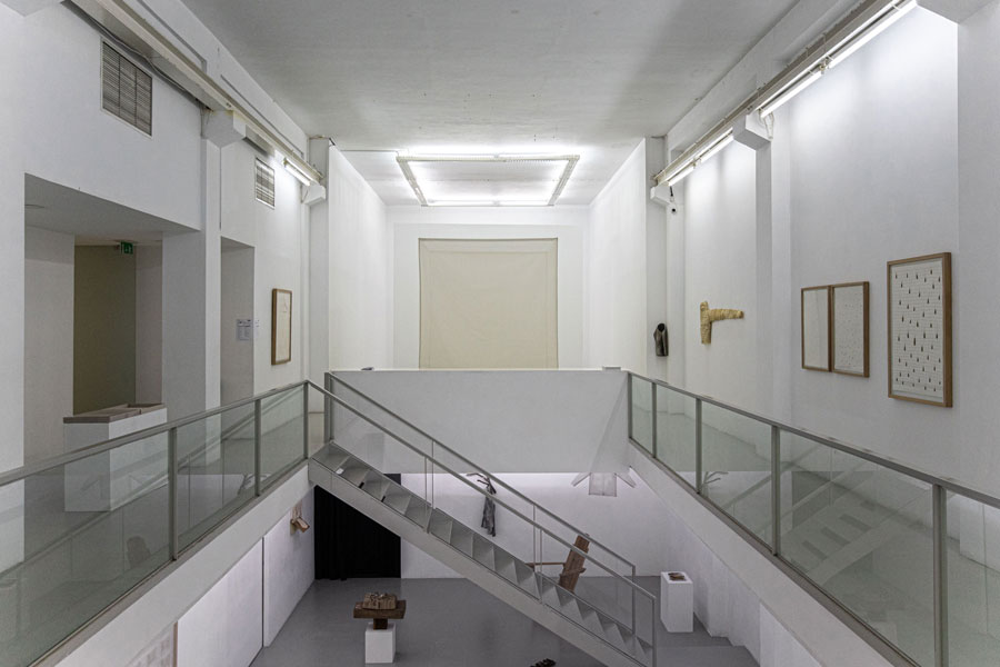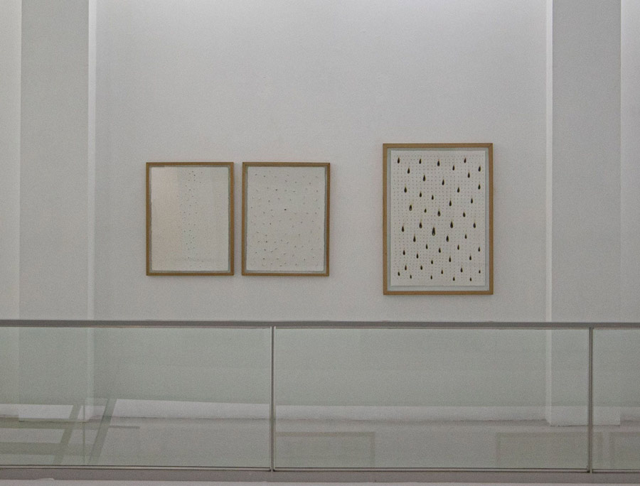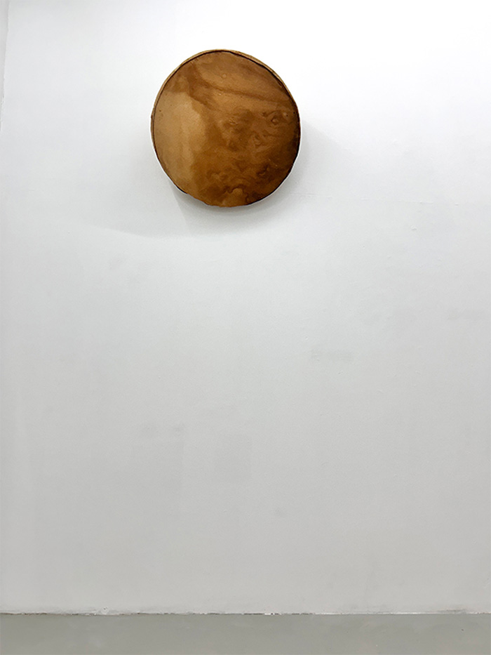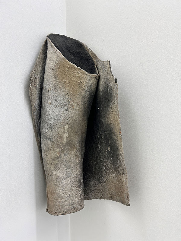Neste piso, os trabalhos expostos ocupam igualmente teto, paredes e chão, e o som do batimento cardíaco da artista é constante. Agora, estremece não só o nosso o corpo, mas a própria arquitetura. «A dureza da madeira do cabide com cabo, que acompanha a coluna vertebral e o coração, simboliza a dura crueza da vida» [11] e está plasmada no desenho Para Gina Pane e Frida Khalo [imagem 2] que nos recebe quando regressamos ao piso 0. Na parede oposta, vemos duas naturezas-mortas que nos mostram dois corpos: Manga de Casaco [imagem 20], em tecido de lã, barro cru e cinza, sugere um braço amputado, e Mais Perto de Ti [imagem 21], em tripa de vaca e fio de algodão, um corpete justo cujo braço esquerdo se prolonga ad infinitum. Perto, os desenhos perfurados Mas onde Nós Estamos É a Luz e Desenho para Gina Pane [imagem 22], tal como para Lucio Fontana nas suas telas perfuradas, querem transcender o espaço, criar uma nova dimensão para a arte, relacionar com o cosmos que se expande infinitamente para além do plano confinado do quadro.