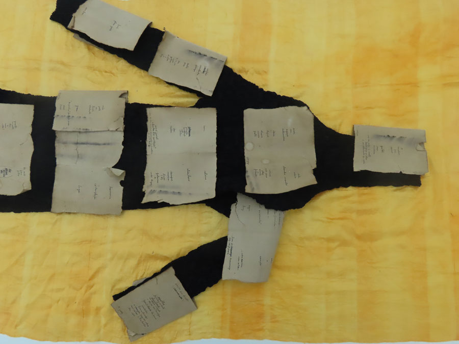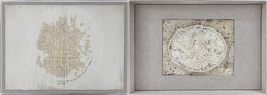 No acervo (sala ao lado), Território — Arqueologia; Não Há Fim; Empurrar o Mundo e Le dur désir de durer (Paul Éluard) surpreendem quase no fecho deste percurso. Sobre a peça-tributo a Paul Éluard, o poeta da liberdade, podemos ler no manual de instruções: «Peça composta por uma triologia, onde três objetos se fixam à parede. Uma camiseta que a artista usou é pendurada num cabide. Imperativamente rasgada, a camiseta foi tingida com chá de camomila, bem forte, depois levada à máquina de lavar para consolidar as manchas sobe o tecido. O garfo, com que a rasgou é preso na parede por um prego num fio com um pequeno nó, em sua memória.» O lado conceptual e emotivo da peça balança com a descrição rigorosa do seu processo de realização. Cada detalhe, cada passo, cada gesto é primordial. Cérebro e Mãe [imagem 23] encerram Tubolagem, assegurando a conexão dos dois hemisférios cerebrais por uma espécie de «cabeamento» que estabelece a comunicação entre eles. O hemisfério esquerdo é responsável pelo racional, o direito pelo emocional. A «tubolagem» torna-se presente, de novo, neste complexo sistema.