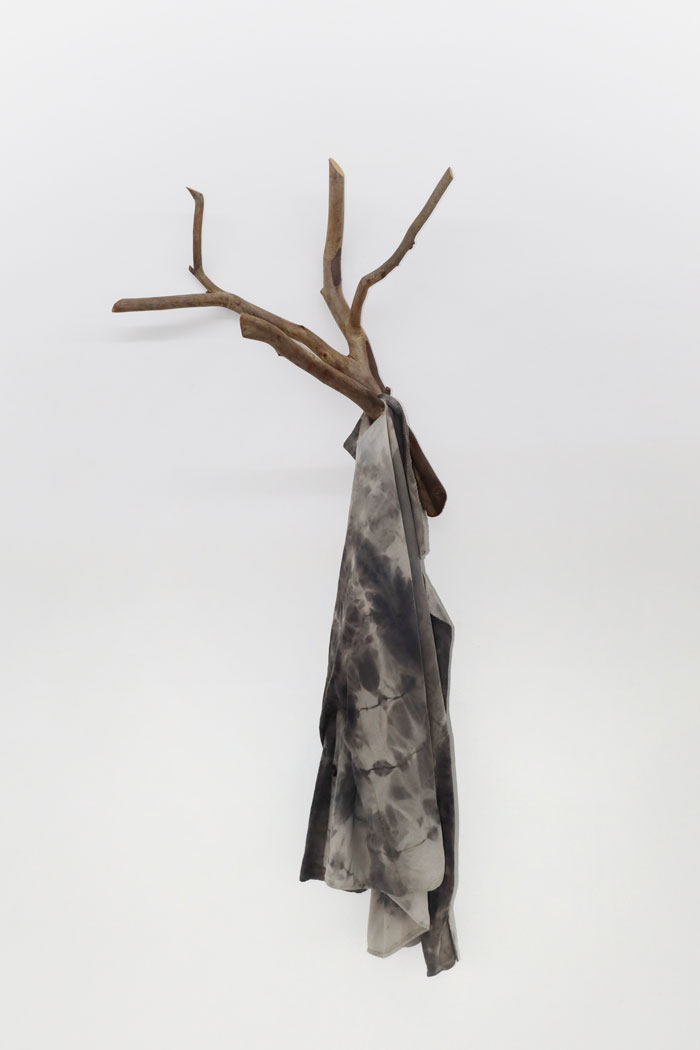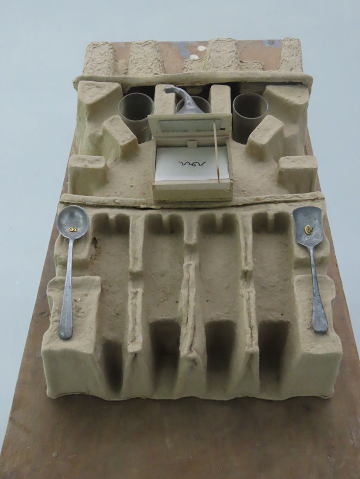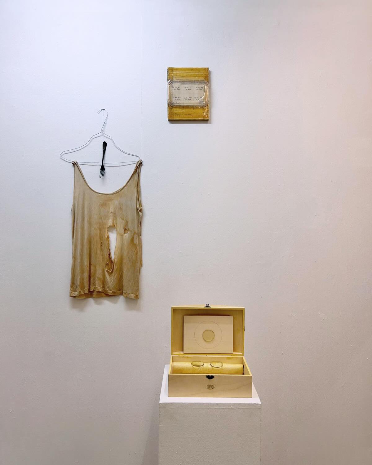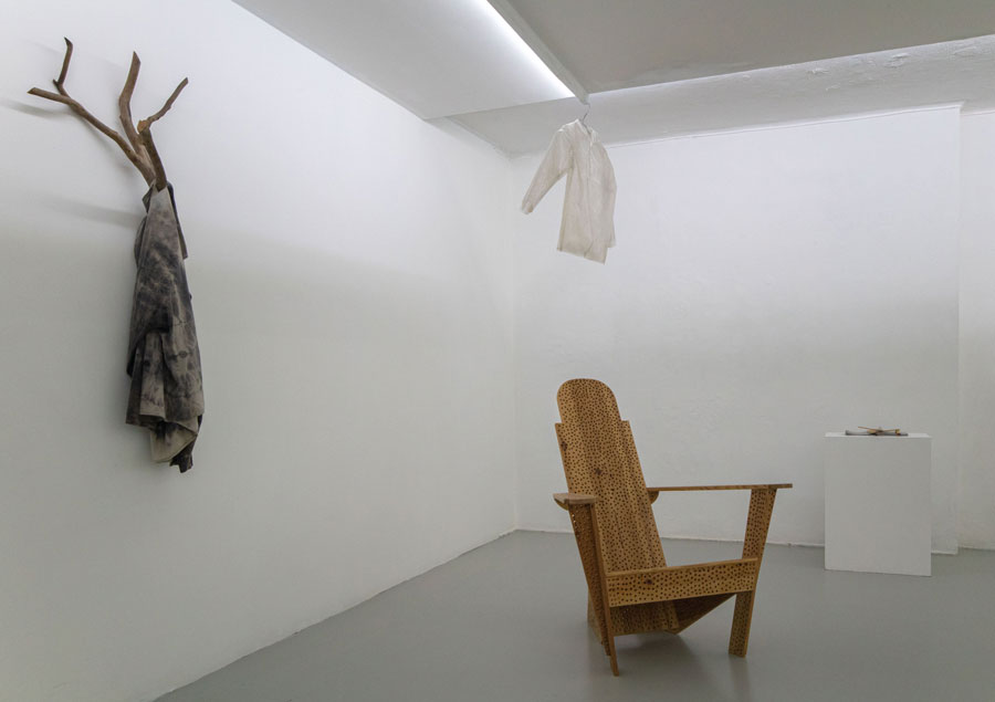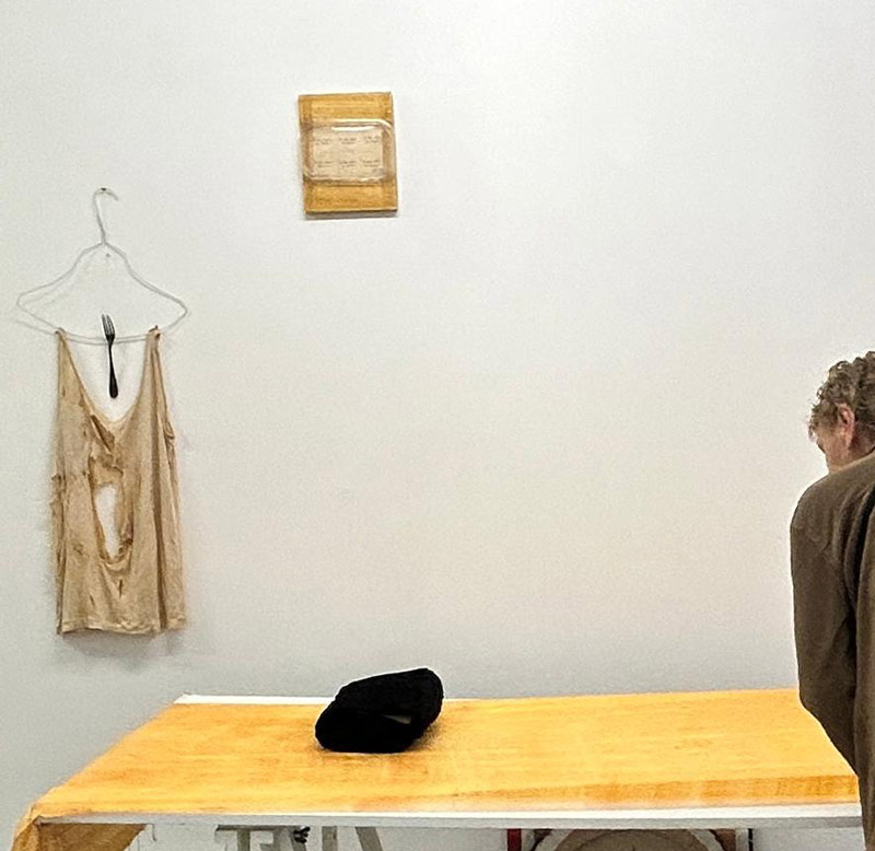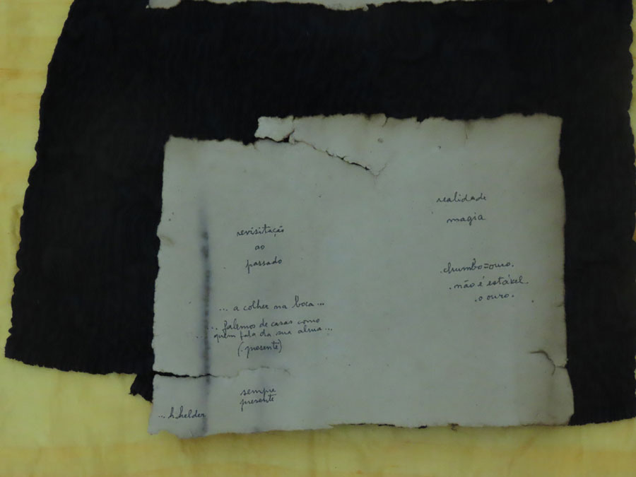 Pés na Terra, perto de Lua, mostra fotográfica e performaticamente, em tríptico, os membros inferiores da artista, em pé, com os pés nus no chão frio de tijoleira de uma cela do Convento de Beja, as unhas pintadas de dourado e um vestido colocado no chão embrulha as peças principais da sua exposição sobre Soror Mariana Alcoforado que ali teve lugar; duas peças de fruta vermelhas, provavelmente maçãs; e um caderno, supostamente de notas. A fruta e o caderno remetem-nos, respetivamente, para o corpo físico e mental — e, intrinsecamente, para a domus. Este autorretrato realista e monástico da artista contrapõe os dois autorretratos (su)realistas — Coluna Vertebral e Aventuroso — em representação da vida (vertical) e da morte (horizontal), recolhidos muito perto de Cubo, donde emana o som do bater do coração da artista. Coluna Vertebral [imagem 6] retrata o ADN e o modus operandi de Maria José Oliveira, «simboliza […] a memória da sua atitude recolectora, uma tubolagem, onde acoplou objetos significantes numa assemblage vertical» [9] e o Aventuroso [imagem 7] o luto. Nesta peça, que a artista descreve como livro sem palavras exatas, o seu corpo surge representado por uma cabaia de seda preta, que nunca chegou a usar, pousada numa mortalha dourada. Por cima, repousam folhas tiradas do livro homónimo manuscrito em homenagem ao filho Miguel, exposto no piso -1 [imagens 8, 9]. «As suas folhas brancas foram marcadas pelo café, exibem manchas de pingos, e as palavras, escritas frente e verso, falam da ligação de mãe e filho para além da vida.» [10], lemos no manual de instruções. No piso -1, as escadas acentuam a ideia de casa e à chegada encontramos, imediatamente à esquerda, uma cadeira e duas peças de vestuário [imagem 10]. Pode Voar à Vontade [imagem 11], um tronco de acácia fixo à parede, sustenta um casaco da artista. Camisa em Poliestireno [imagem 12] parece levitar por uma suspensão vinda do teto. O casaco pendurado torna presente a artista, como se o tivesse despido há pouco, a camisa transparente, ligeiramente insuflada, materializa o seu espírito e Caruncho [imagem 13], uma cadeira de madeira rigorosamente perfurada, o tempo. A narrativa deste tríptico é sublinhada pelo livro da artista, Aventuroso [imagem 14], pela prateleira de cartão com papari e osso de choco Comida Primordial [imagem 15] e pela Construção Abrigo. Para Espaços Alquímicos (Nas Caves ou nas Altas Torres) [imagem 16]. Impressionante como, nestas diversas assemblages, se cruzam múltiplas histórias, e tomo agora conhecimento de que os fragmentos em ouro depositados nas duas colheres de alumínio foram realizados por uma aluna, numa aula no Ar.Co, na década de 1990, sobre Ana Hatherly, orientada por Maria José Oliveira, no âmbito da disciplina Estúdio, que criei para proporcionar aos alunos de joalharia projetos interdisciplinares. Como permuta, simbolicamente, os artistas recebiam uma peça de um dos alunos. Testemunhamos, assim, como tudo se perpetua e transforma nas mãos e no pensamento desta artista. Tudo é orgânico, pão, alimento. Alquimia. Transformações; Fronteira Líquida. Até Fui a Cacilhas e Resíduos Vegetais com Jarro de Vinho Tinto, são igualmente prova disso [imagens 17, 18, 19].