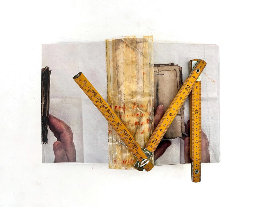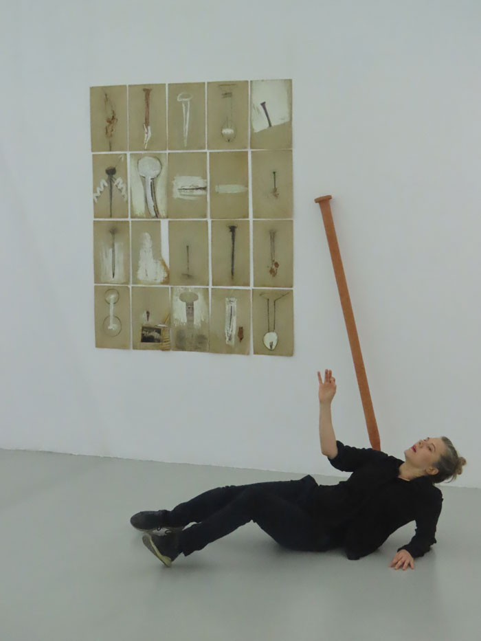 Este encontro improvável entre as duas artistas resultou num breve ensaio experimental e íntimo, no qual a peça de Maria Nurmela provou estabelecer múltiplas afinidades com a de Maria José Oliveira. A performance de Nurmela pareceu referir uma das fontes de Maria José Oliveira, Gina Pane, «como um dos expoentes máximos da body art, na década de setenta, que utilizava sempre o corpo como matéria e suporte para a sua criação artística.» [2] A voz de Maria Nurmela estabeleceu relação com o som do coração de Maria José Oliveira e o seu corpo com as múltiplas representações do corpo no trabalho da artista [imagens 3, 4]. Na sua obra, Nurmela «faz referência à famosa peça de William Shakespeare com o mesmo título, que aborda temas de identidade, papéis sociais e escolhas pessoais. Através de movimentos, objetos e símbolos, Nurmela destaca o tema da liberdade de escolha: a possibilidade de interpretar e experimentar a vida à sua maneira. Este solo profundamente pessoal e evocativo convida a refletir sobre a transformação e o legado.» [3] Este encontro não poderia, por isso, fazer mais sentido. O número significativo de obras e o espetro temporal que Tubolagem abarca lembram a exposição 40 Anos de Trabalho, de 2017, na Sociedade Nacional de Belas Artes. Encontramos algumas obras revisitadas, instaladas de outro modo, e novas. Ambas as exposições são afins pelo seu carater intemporal, pois não se distinguem épocas ou tempos. O modus operandi é circular, as obras e os materiais revisitam-se permanentemente, confundem-se sem hierarquia e sem competição. Todas são vitais para a artista e cumprem um propósito imperativo. São, por isso, singulares, insubstituíveis e impressionam pelo caráter autobiográfico, pela referência incontornável e permanente ao seu corpo e ao de alguns que já partiram. O primeiro filho, Miguel, é um deles. Em ambas as exposições, como refere João Pinharanda no catálogo da primeira, Maria José Oliveira ora coloca o corpo no presente ora no passado e é nele que «fixa as suas fantasias.» [4] Quem conhece a vida e o percurso artístico de Maria José Oliveira compreenderá melhor a sua obra, mas, de modo a orientar o visitante, a Galeria Graça Brandão elaborou um pequeno manual de instruções com breves sinopses, sublinhando que a obra deverá ser entendida como a artista a pensou. Refere também, nesse manual, as principais fontes artísticas e literárias abrindo-o com excertos do livro de artista Aventuroso — cujas palavras ressoam ao som do coração que ouvimos bater: «Quantos minutos tem a nossa vida?» [5] A leitura imperativa do texto de Adelaide Duarte apresenta a essência da artista, da sua obra e desta exposição. Dignos de realce são os títulos e o modo rigoroso e atento como as obras estão instaladas no espaço pela mão da artista e do arquiteto Alberto Caetano. Sem hierarquia e ordem cronológica, a artista apresenta trabalhos em múltiplos materiais e suportes, todos resultantes da sua gestualidade: seja desenho, pintura, colagem, palavra, construção ou apropriação. São múltiplas as «coisas» que desvia do seu lugar de origem e integra nas assemblages que cria: vestuário, alimentos, restos, partes, algumas possíveis de identificar outras menos «numa mimésis de naturezas degradadas.» [6] Todas fazem parte do seu quotidiano e carregam em si uma memória específica, num verdadeiro exercício de (in)disciplina [7] , como referiu Paulo Henriques no texto que escreveu para o catálogo da exposição 40 Anos de Trabalho.