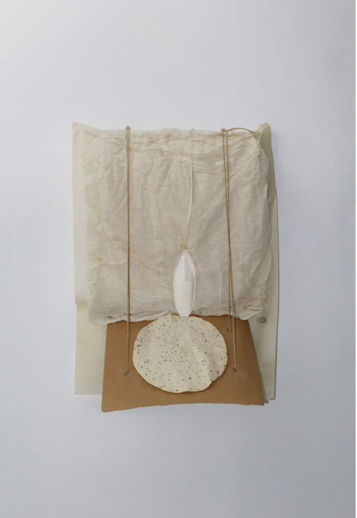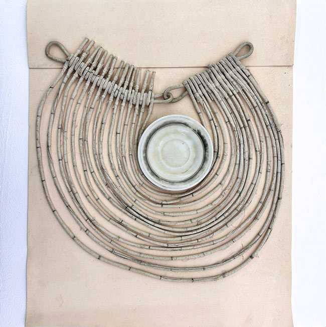 Maria José Oliveira, Espaços Intermédios, 1988-2024. A sua primeira exposição individual foi numa galeria vizinha, na Travessa da Água-da-Flor. A Galeria Artefacto 3 [8] mostrava, por norma, joalharia contemporânea e, em 1988, Maria José Oliveira expôs Ourivesaria Têxtil, redenominando assim a própria terminologia convencionada e os materiais normalmente afins a esta disciplina. Como referiu na entrevista que realizei em 2012, justifica o título «Pela incongruência, pelo paradoxal…» Identificou-se na altura com a liberdade desta disciplina e com a relação estreita que estabelecia com o corpo. Sílvia Chicó escrevia o texto de sala e denominava as peças apresentadas de «anti-joalharia». Uma dessas «não joias» integra esta exposição. Surge pousada num plinto em estreita relação com um prato de café da Vista Alegre, dos anos 1940, que guardou de casa dos seus pais. O prato preenche o lugar do corpo e sublinha a forma circular implícita nesta «peça para o corpo», como a artista prefere chamar. Na altura, moldou-a e fotografou-a no corpo do filho de 12 anos. O diâmetro dos quinze círculos concêntricos em tela crua com desenhos a grafite crescia em torno do pescoço do pequeno David. Aqui, este díptico — peça para o corpo (colar) e prato — faz parte da série Espaços Intermédios.