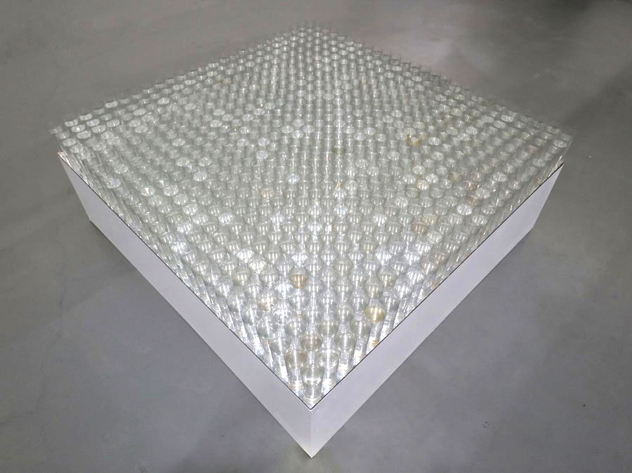 Telão na entrada da exposição Tubolagem. Galeria Graça Brandão, 2024. © Galeria Graça Brandão. No piso 0 somos levados a seguir o corredor (mezanino) que circunda o piso -1 da Galeria Graça Brandão. Por ser estreito obriga a uma maior aproximação das obras, muito embora também possibilite vislumbrar claramente duas ao longe — Cubo e Lua [imagem 5]. Parece reunir-se aqui um corpo de trabalho de autorrepresentação e biográfico, por isso mais emotivo, não sendo fortuita a presença de Lua no início deste percurso.