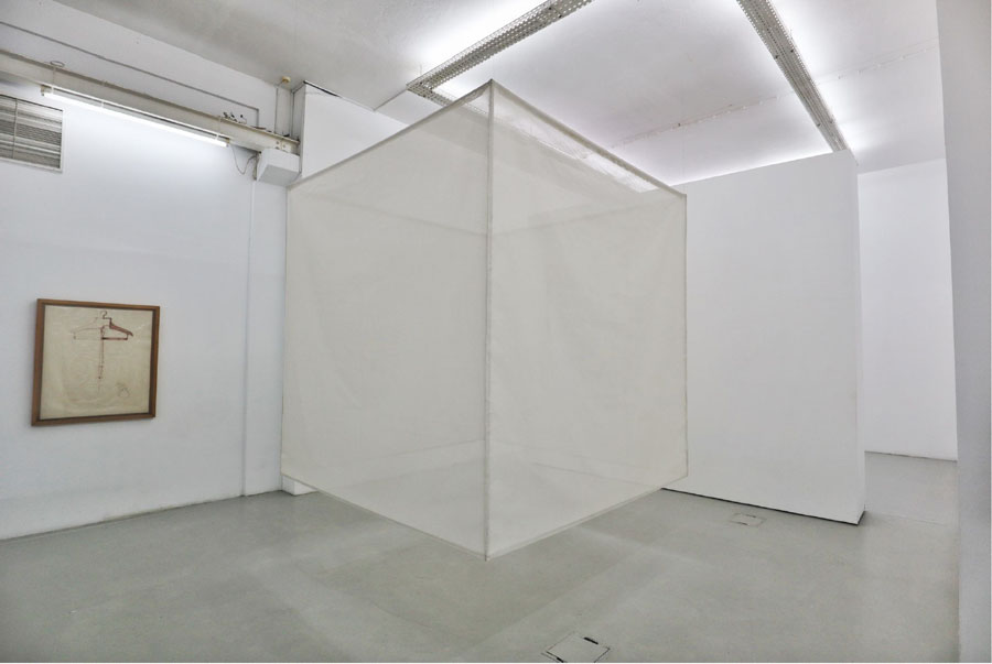 O som do batimento do coração da artista é o elemento central desta exposição. Parte integrante de Cubo [imagens 1, 2] — um grande white cube (com cerca de dois metros e meio de lado) suspenso no piso térreo —, expande-se livremente por todo o espaço da galeria e embate no nosso corpo, ecoando. Impossível alhearmo-nos desta batida cardíaca que ressoa em nós confundindo-se com o bater, silencioso e quase impercetível, do nosso coração. O som ouve-se, desta forma, em stereo através de dois canais áudio, reproduzido por duas colunas diferentes — o corpo da artista e o nosso. O título da exposição ganha, assim, sentido, pois desse cubo branco podemos imaginar múltiplas artérias (tubulares) que irrigam metafórica e sistemicamente cada uma das vinte e oito obras, mais quatro no acervo, que constituem esta exposição. Maria Nurmela, na sua passagem recente por Lisboa, visitou a exposição e, impressionada por esse pulsar da obra de Maria José Oliveira, propôs ensaiar in situ a peça As You Like It — que criou com Lisi Estaras e irá interpretar brevemente no Turku City Theatre´s Sopukka, na Finlândia, cidade natal desta performer e coreógrafa contemporânea.