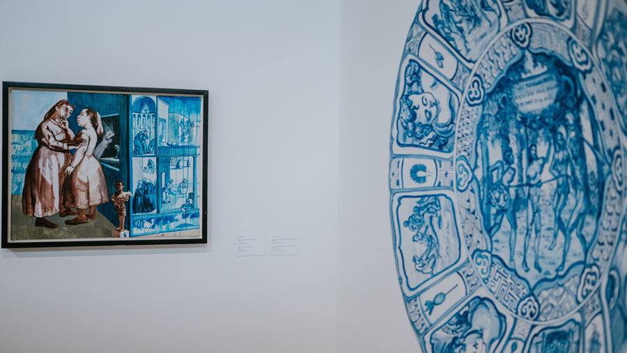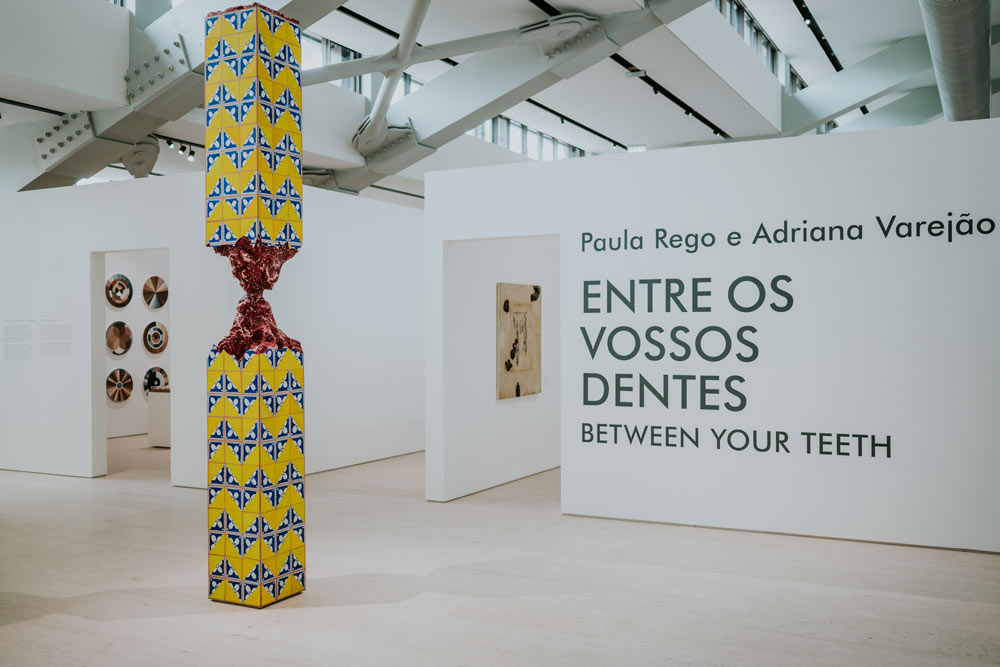 Sentarmo-nos diante de um quadro de Paula Rego não é experiência banal. Mas há quem passe por um bosque e não veja nada mais do que lenha para a fogueira, dizia Tolstoi. Já nos acostumamos a passar pelas coisas com os olhos embutidos de quotidiano e, tantas vezes, um quadro é só um quadro. Emoldurado sempre de forma similar, modificado, eventualmente, seu tamanho e suas cores, um desatento poderia não prestar atenção ao que lhe diz. Mas assim como escutar não é ouvir, olhar também não é ver. Do poema que inicia esse texto, foi extirpado pequeno verso, “Entre os Vossos Dentes”, para nomear a mais recente exposição da Gulbenkian, que reúne dois nomes de peso da arte moderna e contemporânea. Na esquina do século XX e XXI, Paula Rego e Adriana Varejão, agora em diálogo, confluem em um espaço comum por meio de uma curadoria que propõe a comunicação entre ambas. Pela dimensão das obras, pelos temas tratados e pela confluência atlântica, a exposição sugere não só o encontro de duas sensibilidades, mas talvez, eventualmente, o encontro de duas experiências histórico-estéticas sobre o destino cruzado desses dois países. Nesse sentido, a exposição nos coloca diante de duas artistas que expressam não só uma particular sensibilidade, mas uma temática alargada que alcança a dimensão de uma cultura e de um tempo. Trata-se, nesse sentido, de apanhar, ao mesmo tempo, história e estética pelas mãos das artistas. Paula Rego dispensa apresentações. Pintora portuguesa fundamental, pintou da segunda metade do século XX até o início desse século, forjando um vasto acervo de pintura realista, figurativa e abstrata. Paula Rego se debruçou sobretudo sobre as figuras, símbolos e retratos quotidianos da família e da cultura portuguesa. Concedeu especial atenção ao universo feminino, que retratou de maneira crua e realista em retratos quotidianos, mas também de maneira intrépida e impiedosa, jogando luz à violência, ao grotesco, ao disforme, aos corpos não normativos, às vísceras dos humores – não tendo deixado pedra sobre pedra sobre questões fundamentais como a questão do aborto. O sangue está quase sempre presente nos seus quadros. E mesmo no mais aparentemente banal retrato familiar, o que se sente é a presença de qualquer medo e qualquer crueldade. Rego expressou um certo corte grotesco para evidenciar as formas do real, apresentando a mulher, a família, o simbólico, o religioso e o sexual de uma perspetiva ao mesmo tempo realista e disforme, crua e diabólica, verdadeira e cortante. Cavou com a unha as feridas e as asas que deram forma ao imaginário de um país, dando especial atenção ao universo feminino e à violência que ronda à volta desses corpos.