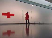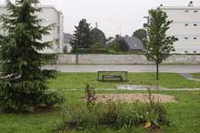 Vista do CAC de Bretigny, com uma peça de Teresa Margolles, “Mesa y dos bancos”, 2005 e de Lois & Franziska Weinberger, “Transportabler Garten”, 2005