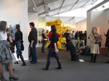 FIAC, PARISSÍLVIA GUERRA2006-10-29Episódio 2 – Jardin des Tuileries e a Cour Carrée du Musée du Louvre Entre o Grand Palais e o Musée du Louvre estendem-se os antigos Jardins do Rei que devem o seu nome à grande manufactura de telhas existente anteriormente nesse espaço – Les Tuileries. Os jardins são este ano o percurso pedonal entre os dois principais pólos da FIAC e nos seus relvados, entre os portões dourados e as árvores outonais, encontramos as esculturas de grandes dimensões que usufruem deste modo de um magnífico stand “open air”; Richard Long, Jean-Michel Othoniel, Tony Cragg, Subodh Guptah entre outros encontram-se à venda nos jardins. A obra mais lúdica é o submarino musical que submerge do grande espelho de água, de Alexander Ponomarev. Após o passeio democrático pelas Tuileries, o único local da feira de “entrada livre” (o bilhete da FIAC custa 20 euros e dá direito a uma única entrada), avistamos a Pirâmide do Louvre e a Cour Carrée. A grande tenda alugada frequentemente para desfiles de moda, encontra-se “embrulhada” por plásticos semi-transparentes que permitem vislumbrar a frenética actividade existente no seu interior. Aqui, exterior e interior assumem um aspecto muito mais descontraído que no Grand Palais, e o público é também mais eclético. Deambulam alunos das escolas de arte, jornalistas, jovens coleccionadores e evidentemente representantes do Ministério da Cultura francês. Aliás a Cour Carrée segundo os seus organizadores é o lugar destinado à arte contemporânea nas suas tendências emergentes. O ambiente parece invocar o espírito do atelier de artista ou de galeria em montagem de exposição, tanto na apresentação dos stands como na apresentação das próprias obras que muitas vezes saem das divisórias dos expositores. Na entrada do grande quadrado encontramos a Galerie de Expeditie Zsa Zsa Eyck de Amesterdão que é um bom barómetro da cultura contemporânea flamenga; forte em cor e miscigenação, apresenta tapeçarias do artista P. Struycken, com o título “Boulez a 44K” de 2005 e as formas escultóricas de manequins em cobertas de lã da autoria de Fransje Killaars. Ao meio-dia é anunciado o vencedor do Prémio Marcel Duchamp – o feliz contemplado é Philippe Mayaux e o seu relator perante o júri foi o novo director do Palais de Tokyo, Marc-Olivier Wahler. Na Parker’s Box de Brooklin voltamos a encontrar as obras de Bruno Peinado, e um pouco mais à frente na galeria Layr:Wuestenhagen Contemporary de Viena encontramos o artista lusitano, João Pedro Vale, que apresenta uma série de formas escultóricas nas paredes, formas que como é habitual na obra do artista cruzam as referências da arte da tauromaquia e o imaginário oceânico português. A força da arte permite que, neste evento, se possam encontrar alguns artistas portugueses representados pelos seus galeristas internacionais, apesar da lacuna na representação de galerias portuguesas. A Rubicon Gallery de Dublin mostra obras de alguns artistas britânicos como Stephan Brandes e Blaise Drummond. Tel Aviv é a sede da galeria Dvir que além dos artistas israelitas expõe Jonathan Monk dos Estados Unidos. E entramos no triângulo da ex-URSS, com a galeria Raster de Varsóvia, a XL Gallery e a Aidan de Moscovo. Neste ambiente frio onde se partilha a vodka, a barcelonense Nagueras Blanchard irrompe em cor apresentando, entre outros trabalhos, o vídeo de François-Xavier Courrèges “Another Paradise” (2005), um loop de 5’30 minutos de relação amorosa entre dois piriquitos. Mas na Cour Carrée encontram-se também diversas galerias parisienses como a Frank Elbaz ou a Galeria Polaris que apresenta, entre outras obras, as de Stéphane Couturier e de Yto Barrada (recentemente com uma exposição monográfica nas galerias do Jeu de Paume). Dentro da Cour Carrée parece que estamos dentro de uma das telas mapa mundi de Alighiero Boetti, mas num mundo quadrado. O design tem também um espaço, desde 2004 na FIAC, com representação de 9 galerias que apresentam as suas peças num espaço aberto sem a delimitação de muros dos stands (cenografia concebida pelo arquitecto Emmanuel Combarel); no entanto, a sensação com que fiquei foi de que, subitamente, passei de uma feira de arte para dentro de uma loja Habitat. O luxo dos partners da FIAC: o Comité Colbert. Na entrada da esquerda da Cour encontramos uma grande instalação dos Electronic Shadows onde são apresentados jovens designers das escolas francesas selecionados por esta comissão, de 60 empresas de alta costura e perfumaria francesas. Como afirma um texto da comissão: “Há uma afinidade natural entre a arte contemporânea e o luxo porque falamos a mesma língua, o processo criativo”. A presença desta comissão com o nome do ministro de Luis XIV que adoptou as famosas medidas a longo prazo para a economia francesa é sintomática da actual aliança do grande capital à arte contemporânea: de Pinault à Fundação Cartier (que inaugura hoje a mostra de Gary Hill nos seus espaços), da companhia de electricidade francesa (EDF) à Fundação Louis Vuitton. O capital procura a sua alma ou vice-versa. |