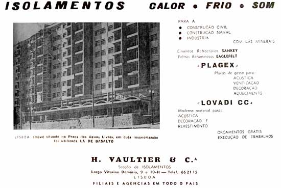 A partir da década de 1950, com a proliferação dos edifícios de rendimento (cuja arquitectura, já sem o pendor nacionalista das décadas anteriores, absorve alguns dos princípios do moderno), prolifera, também, a publicidade de arquitectura frequentemente apoiada na imagem da própria arquitectura (especificamente a que referimos, publicada nos periódicos especializados), utilizando-a como factor de diferenciação que visa, essencialmente, sublinhar e acentuar a mensagem, como demonstra o anúncio aos isolamentos H. Vaultier & C.ª [Fig.1], apoiado na imagem do Bloco das Águas Livres de Nuno Teotónio Pereira e Bartolomeu Costa Cabral. São, assim, publicidades construídas sobre imagens de obra feita e servem para associar, neste caso um material, ao (reconhecido) prestígio do construtor, do fornecedor, ou do projectista, através da “colagem” do nome-marca ao edifício em causa [Fig.2], ambos, a partir daí, ditos, naturalmente, de “excelência”. Não sendo publicidade de imobiliário, este tipo de anúncios refere-se, na sua maioria, a edifícios de rendimento construídos em Lisboa desde o segundo pós-guerra, facto que configura por si um sistema de divulgação de modelos de arquitectura [4] , localizados em zonas de relativa centralidade e destinados a uma (certa) classe média então em formação, pelo que, com base na imagem, são anunciadas, sobretudo, as qualidades da sua construção (rigor, robustez, inovação [Fig.3]). Esta tipologia publicitária estende-se ao longo da década seguinte, com alterações que incidem apenas nos modelos/edifícios divulgados, num fenómeno que indicia um crescimento urbano constante, baseado numa procura limitada, face às contingências do poder de compra da generalidade dos portugueses à época.