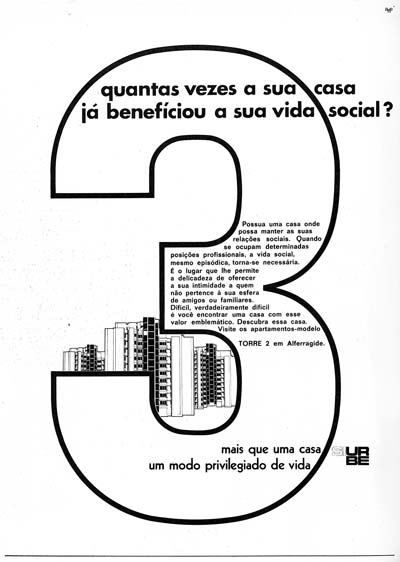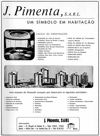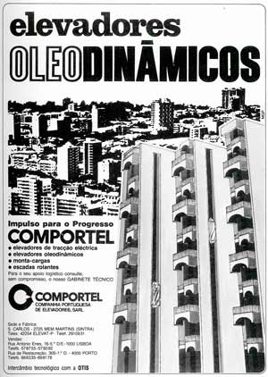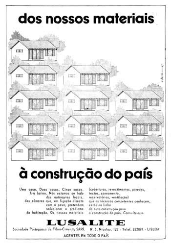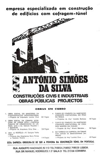 Será, apenas, a partir dos anos de 1970 que o investimento em construção de habitação irá começar a ocupar um espaço significativo no conjunto de anúncios publicados. Este fenómeno, verificado a partir da publicidade dos construtores que referem explicitamente os locais e empreendimentos em que trabalham (ou haviam trabalhado), é revelador da dimensão crescente do volume de construção de habitação nesses anos. A publicidade evoluía, desta forma, para a divulgação da construção de torres (associado, essencialmente, ao anúncio de elevadores Comportel [Fig.4]) e conjuntos habitacionais (associados às empresas de construção e imobiliária Batiponte [Fig.5], J.Pimenta [Fig.6], entre outras), facto que coincidia com uma forte aposta na construção (rápida), visível no anúncio da Lusalite [Fig.7], que traça uma evolução “dos nossos materiais à construção do país” [5] . Da “rapidez” que a publicidade “propunha”, salienta-se a aposta em materiais e técnicas de prefabricação, sendo que, do novo país referido no anúncio, é de salientar o vasto número de obras em curso, com ou sem indicação do nome dos arquitectos (exemplarmente descrito nos anúncios de António Simões da Silva [Fig.8] que divulgam obras em curso de Lucínio Cruz, Silva Dias ou Nuno Portas e Nuno Teotónio Pereira). Se excluirmos desta leitura os edifícios de habitação social, por não se enquadrarem na lógica de consumo aqui em análise, temos em construção um parque habitacional direcionado para uma classe média que cresce em número e que vê o seu poder de compra aumentar, surgindo, com ele, “novas necessidades”, de algum modo, também difundidas pela publicidade.