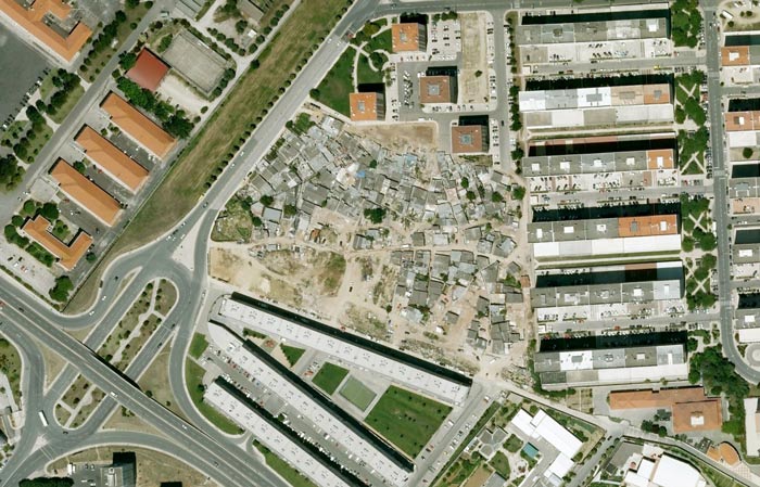 O Bairro da Quinta da Vitória foi um bairro de habitação precária localizado na freguesia da Portela, concelho de Loures, sobre a fronteira com o concelho de Lisboa (fig.1). Tal como muitos outros bairros auto-produzidos que surgiram na periferia de Lisboa a partir dos anos 60, nasceu da ocupação das antigas trincheiras da Estrada Militar, zona difusa relativamente à propriedade do solo. A sua construção deveu-se inicialmente à fixação de migrantes portugueses, tendo-se adensado com a chegada de vagas consecutivas de imigrantes de países africanos, desde o pós 25 de Abril até ao início dos anos 90, que incluíram a vinda da comunidade Hindu de Moçambique devido ao agravamento da guerra civil nos anos 80. A presença desta comunidade levou à construção do primeiro templo Hindu em Portugal, Jai Ambe Mandir, em 1983, na rua principal da Quinta da Vitória (Cachado, 2008, p. 41). O levantamento do bairro feito pelo Centro de Estudos Territoriais em 1992 registou 333 agregados familiares para um total de 1556 moradores, dos quais 47% eram hindus, seguidos por portugueses e africanos. Em 2002, num novo recenseamento, este número aumentou para 446 agregados familiares. Os limites da Quinta da Vitória colidem com os da Portela de Sacavém, um bairro de classe média dos anos 70 composto por edifícios de 11 pisos e um desenho urbano marcado pelas premissas da ‘cidade funcional’ modernista (fig.2).