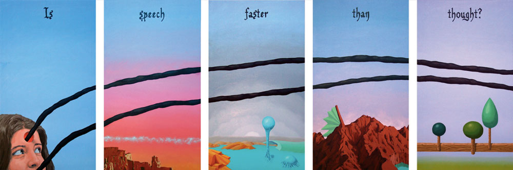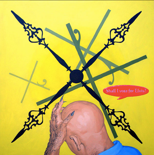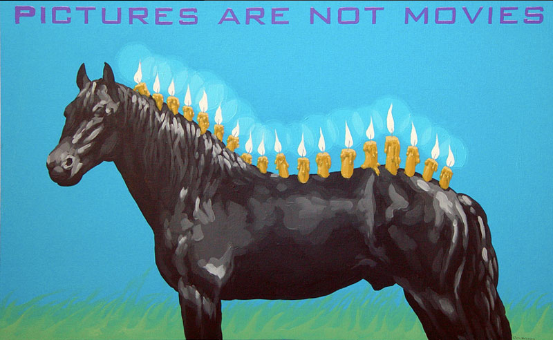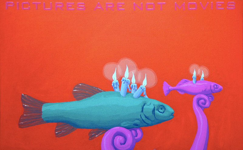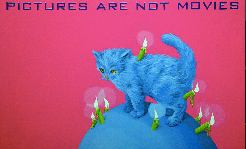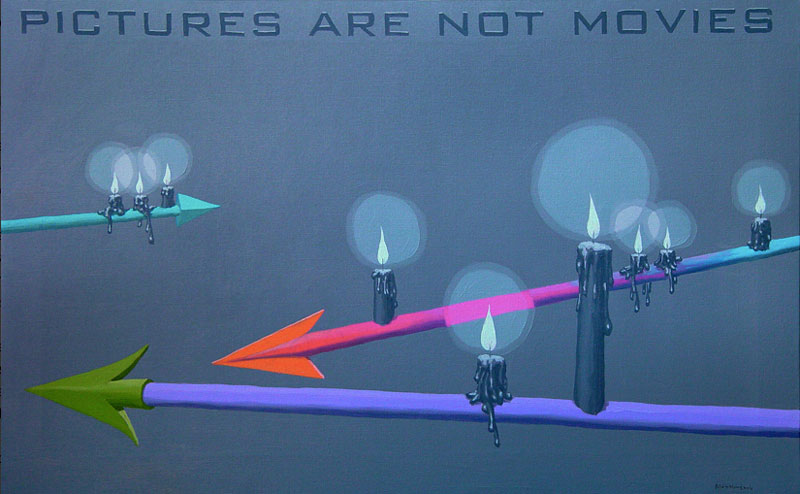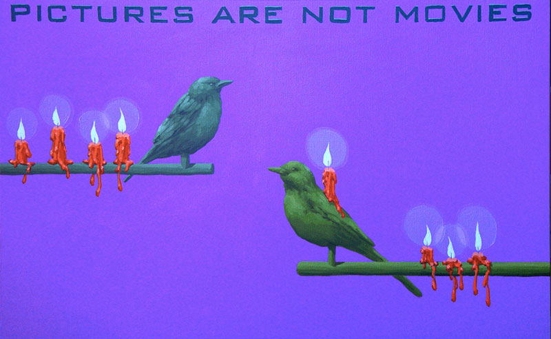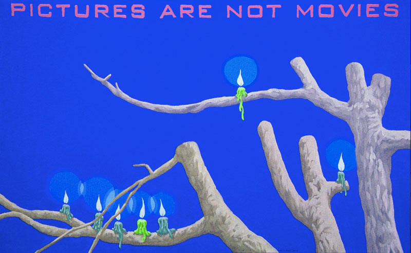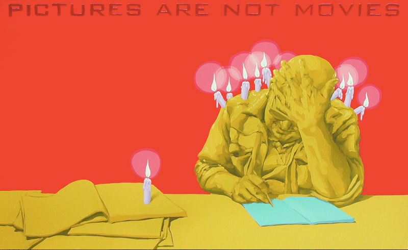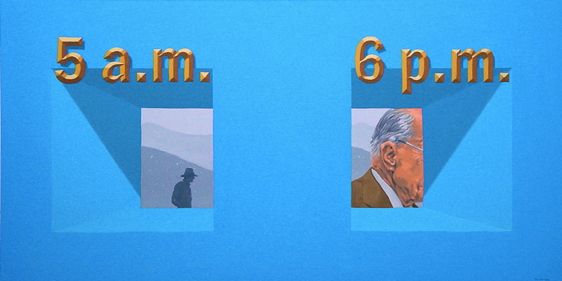 A arte contemporânea nos ensina que não se é mais possível pensar a poética como algo inédito. Após a experiência das vanguardas históricas na Europa do início do século XX, e seus desdobramentos para além das Guerras e da consolidação da sociedade de mercado, o que vimos ao longo dos últimos 50 anos foi uma intensa correlação de ideias, processos artísticos e suportes de produção da arte. Por um lado, há a sensação de que tudo que deveria ou poderia ser produzido, o foi. O pragmatismo e os novos estados de coisas numa sociedade orientada à alta produtividade e ao esgarçamento das relações humanas têm um papel preponderante no processo. Por outro lado, o campo se expande no sentido de que novos artistas são impelidos a trabalhar a forma existente de maneira a dar-lhe outros significados, reciclar seus sentidos e oferecer ao espectador novas vistas em torno do legado anterior. Com efeito, diz-nos um importante estudo sobre o tema: A estética contemporânea, sofrendo a influência desse ambiente próprio de uma civilização tecnocrata e pragmática, se orienta em três direções ou tendências: 1) Reaparecimento de tendências icônicas, ou representativas, desprestigiadas desde a época do expressionismo abstrato; 2) Reação ao abstrato e tendência ao neo-construtivismo; Expansão ambiental e tendência à arte conceitual (MOURÃO, s/d, p. 73). Nesta chave de atuação, encontramos o português António Olaio, nascido em 1963 em Sá da Bandeira, Angola, que vive, hoje, em Coimbra onde é professor no Departamento de Arquitetura da Faculdade de Ciências e Tecnologia da Universidade local. Tendo uma carreira que se iniciou nos anos 1980, não poderiam ser diferentes seus diversos estímulos estéticos formais e conteudísticos. Chegou a formar um grupo musical chamado Repórter Estrábico, em que mesclava performances e poesia. A partir dos anos 1990, passou a produzir conjuntos artísticos em que a tónica dominante seria a conjunção de suportes da produção em diálogo intenso e imediato. Aqui, com este breve ensaio, pretendo partir da série “Pictures are not movies”, que António Olaio produziu em 2005, composta por 12 pinturas, um poema e uma música, cuja melodia é de autoria de João Taborda, parceiro musical de Olaio há vários anos. De princípio, o que depreendemos dessa série, bem como de outras produzidas pelo autor, é uma preocupação em não estabelecer hierarquizações categorizantes quanto ao meio pelo qual se expressa uma arte. Ao nos aprofundarmos em “Pictures are not movies”, observamos uma constante preocupação em estabelecer elos sólidos entre aquilo que se vê, aquilo que se lê e aquilo que se ouve, como se os três formassem uma aurística fenomenológica que nega o fim da arte por meio de sua reprodutibilidade técnica (vide Benjamin), ao mesmo tempo que reconstrói maneiras de se decodificar o universo da estética criteriosamente ao gosto de um tempo social e histórico massificado. O que Olaio parece perseguir a todo momento é uma maneira eficaz de recompor o elemento sensível da arte, perdido por força de um cerebralismo impelido contra uma sociedade utilitarista. Se desejarem uma asserção melhor elaborada de meu raciocínio, examinemos o que nos diz um dos diversos tratados estéticos de Merleau-Ponty, dos quais me valerei ainda outras vezes mais para meus argumentos: O mundo verdadeiro não são luzes, essas cores, esse espetáculo sensorial que meus olhos me fornecem, o mundo são as ondas e os corpúsculos dos quais a ciência me fala e que ela encontra por trás dessas fantasias sensíveis (MERLEAU-PONTY, 2004, p. 3). Vejamos. Analisar Arte Contemporânea por vezes se torna um empreendimento exaustivo que não leva a parte alguma e não contribui para os estudos específicos se preso estiver a um sistema de massificação da percepção. Não se pode balizar a fruição estética pelo macroentendimento de mundo que o receptor presumidamente detém. Longe disso, a gama infinita de possibilidades deve ser abordada a partir de seus predicados autónomos, em que pese a formação, a instrução e o domínio estético-histórico do autor. Quero me utilizar, em primeiro lugar da mais impressiva imagem que compõe “Pictures are not movies”, 5 a.m, 6 p.m. A primeira imagem nos coloca diante de um discurso complexo quanto à interação entre distintos suportes de produção, como citei anteriormente. De modo geral, o traço de Olaio e suas escolhas estilísticas nos remetem a um surrealismo metafísico de Magritte, por exemplo, em que o desamparo inunda as vistas por meio de personagens isolados, deslocados de seu meio. A cor azul, que deveria trazer algum alento à percepção do espectador, não irá cumprir este papel. Ao contrário, potencializa a sensação desalentadora por meio das perspectivas das linhas que formam duas janelas pelas quais o observador deve procurar a chave de leitura. Algo incomum à pintura em sua evolução histórica é a inserção do verbo. Quando nos deparamos com uma imagem que nos arrebata, devemos mergulhar e perscrutar seus indizíveis. Mas, Olaio nos oferece uma pista a mais para a compreensão de sua criação, quer dizer, ao inscrever na imagem “5 a.m” e “6 p.m”, o enigma se torna mais intrigante. Especulo que o homem da janela à esquerda, jovem e distante, isolado e cabisbaixo se limite com a inscrição “5 a.m”, que no sistema anglo-saxão de medição de horas significa cinco horas da manhã. Um horário que não mede realmente o tempo em números, mas desloca a percepção do espectador para a alvorada do Homem. Tal qual o enigma da Esfinge, no amanhecer um jovem tem apenas uma vaga ideia de como o mundo se lhe apresenta. Há apenas um empirismo em torno daquilo com o que nos relacionamos. O contato corporal estreito só produz um “sentimento vago”, o “saber de um algo indeterminado” que nunca é suficiente para “acionar” a conduta [..