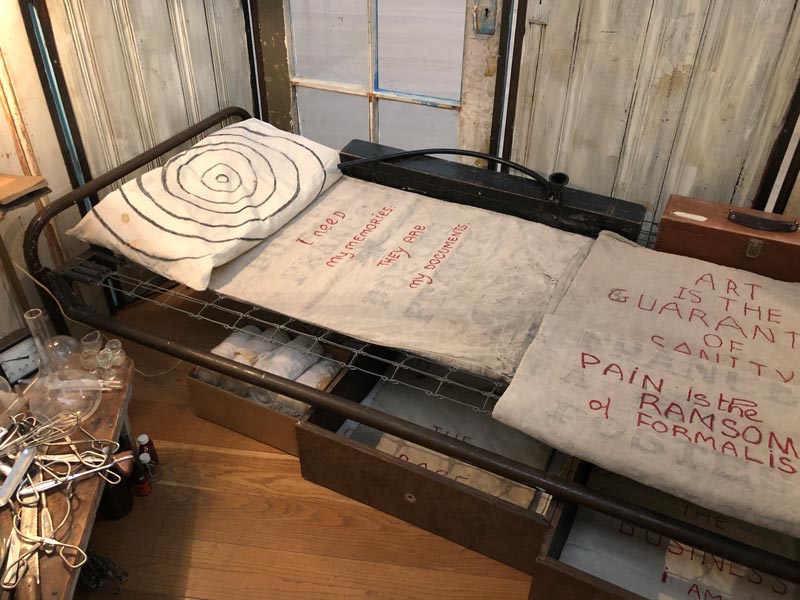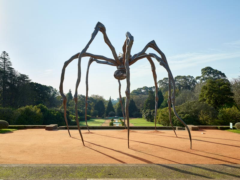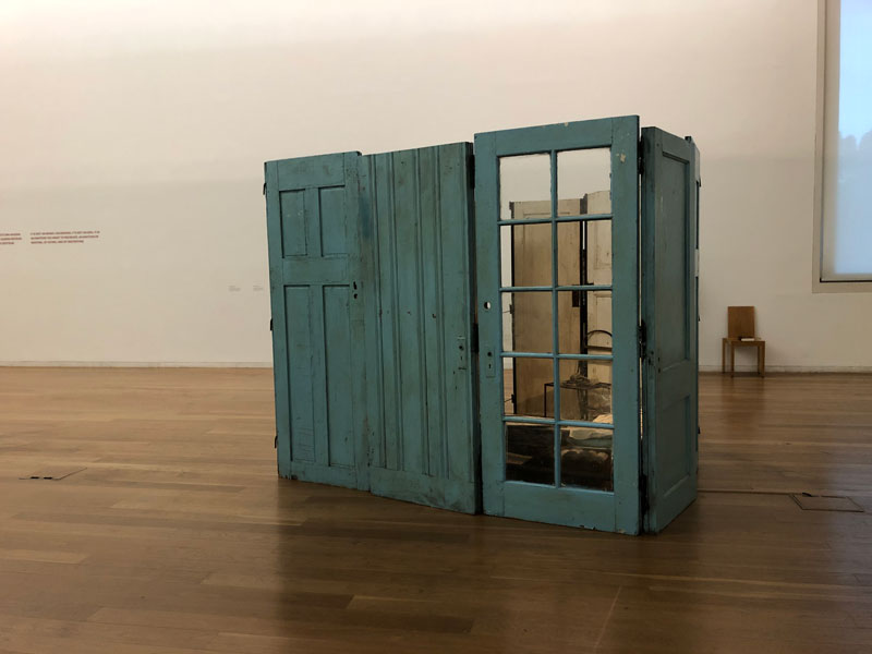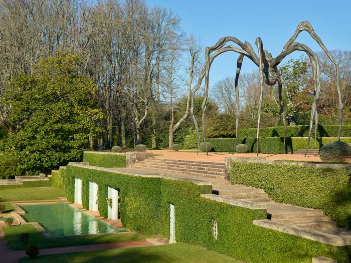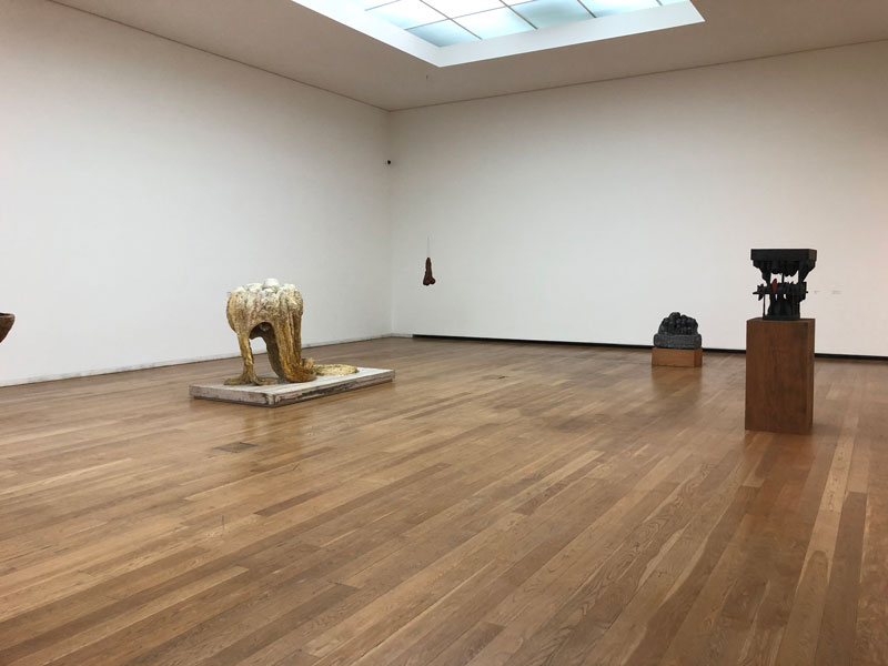 Lippard, no seu núcleo de metodologia, criticava também as estruturas de poder e o domínio do patriarcado, e usou ferramentas para falar da importância de todos os aqueles que se rotulavam de Outros (negros, latino americanos, LGBT, etc.). Bourgeois teve um papel determinante nesta exposição; segundo Lippard o seu trabalho tinha-se orientado na direção da “Eccentric Abstraction” desde os anos 40, pelas suas qualidades corporais/viscerais, assim como por meio de um vínculo ao Surrealismo Europeu, e a trabalhos como “Fur Teacup” de Meret Oppenheim, objeto de forte conotação sensual e erótica. “Orgânico”, “Erótico”, Sensual”, foram as palavras que a crítica de arte usou para descrever o trabalho de Bourgeois, e a sua quase visceral identificação com a forma, capaz de ativar as sensações físicas mais poderosas. Desta época resulta a série “Janus”, representada em Serralves, com a peça “Hanging Janus with Jacket”(1968), alusão mitológica ao deus romano Janus de duas faces, olhando em direções opostas, vulnerabilidade e fragilidade do corpo em suspensão, a dureza de uma poderosa capa metálica, representam opostos que se fundem num só género. Em “Destruction of the Father” (1974), instalação de carater dramático e canibalesco, fantasia de devorar um pai infiel, o latex utilizado nas formas redondas iluminadas por uma luz vermelha, serve uma dupla função transversal na obra de Bourgeois, transmitir agressividade e vulnerabilidade. Esta dualidade contraditória, mas ao mesmo tempo tão humana, é um registo/marca da liberdade poderosa com que experimentou novos materiais e formas. Os temas da memória e dos conflitos de infância são recorrentes, e “Cells”, instalações que realiza em meados dos anos 80, salas enigmáticas encerradas por redes ou paredes com janelas de vidro, contêm um duplo significado, são formas de organismo vivo e de confinamento, frequentemente lugares de contemplação da dor física, emocional, psicológica. Salas/quartos que lembram os “Wunderkrammer” do século XVII (gabinetes ou vitrinas, alegorias de curiosidades), contêm objetos usados como instrumentos de memória, e convidam o espetador, a apenas a alguns centímetros do nosso olhar, a prestar uma atenção curiosa, mas ao mesmo tempo preservar os seus conteúdos. O espetador debate-se entre a imersão e o distanciamento. Os conteúdos emocionais do corpo são captados nas suas tensões, como acontece em “Cell III” (1991) na figura arqueada com os dedos crispados, e pouco depois em “Arch of Hysteria” (1993), obra de cunho subversivo, na representação de um torso sem cabeça suspenso precariamente por um fio, em posição arqueada (posição do corpo “histérico”), os braços ao encontro dos pés formando um círculo, a histeria normalmente associada à história clínica da mulher é aqui apresentada assexuada. Desta tensão entre os elementos autobiográficos e uma sintaxe metafórica complexa, resultam as gigantes “Spiders”, produções mais recentes, que fornecem ao observador um écran de projeção da sua própria memória. “Maman”, a escultura da aranha gigante, dedicada à sua mãe, é uma metáfora que se alimenta do interior, numa sucessão de reparações/cuidados com a teia.