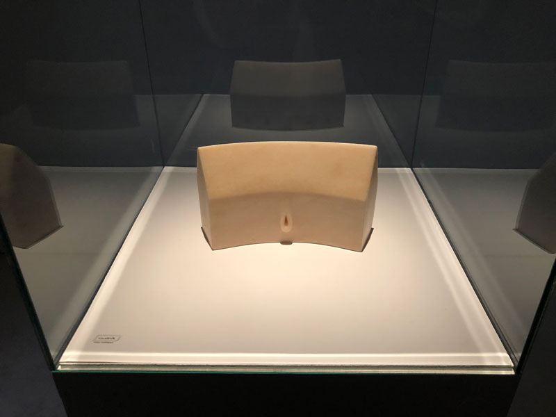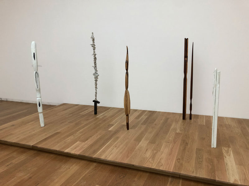 Penso que o trabalho de Louise Bourgeois é indissociável das questões de género que dominaram as artes visuais dos anos 60, 70 e depois, masculino/feminino, amor/ódio (nas suas relações com a mãe e o pai), o corpo e as suas dores, no entanto vai mais longe. Já nos anos 40, numa década ainda embrionária para as questões feministas, realiza uma série de obras a que chamou “Femmes Maison”, figuras femininas cujos corpos consistiam parcialmente numa casa, referência ao estatuto social das mulheres e ao seu estatuto de domésticas, explorando o mesmo tema na escultura. Mas englobar a obra de Bourgeois no estereótipo feminista parece-me demasiado restrito; a sua vasta criação artística não cabe nessa tipologia. A identidade de género é camuflada em ambiguidade, de género neutro ou ambissexual, em “Maternal Man” (2008), obra em que o corpo apresentado é em simultâneo Homem/Mulher, carregando um ventre cheio e um pénis, ou ainda “Fillette”(1968), escultura fálica em latex, posteriormente recriada em final dos anos 90, de formas sexualizadas não claramente femininas ou masculinas, evocação de um mundo sexual indiferenciado e polimorficamente perverso. A utilização de materiais, estranhos à tendência mainstream da escultura – latex, borracha, gesso, cimento, argila, cera, que práticamente não tinham ainda sido utilizados, são meios para criar objetos poderosamente tácteis e sugestivos, no entanto ligados a uma linguagem formal abstrata. Ao abandonar Paris, onde descobriu com Léger o seu destino de escultora, por via do seu casamento com o historiador americano Robert Goldwater deixa para trás uma história de vida, que irá constituir matéria de criação para grande parte do seu trabalho posterior. “Personages” (1947-54), grupos de esculturas antropomórficas, variantes do totemismo, nas suas formas esguias e verticais, são as que têm maior recuo temporal nesta exposição, e datam dos primeiros anos da vivência em Nova Iorque. A morte precoce da mãe, um pai mulherengo e cruel, levam-na a fazer psicanálise durante várias décadas. A sua obra é disso reflexo. “Deslaçar um Tormento” é uma obessão transversal na sua criação, “eu tenho sido uma prisioneira das minhas memórias e o meu objetivo é livrar-me delas” (não será o objetivo de todos nós?). O peso da memória é exorcizado nas diversas práticas artísticas que realizou, num teatro em miniatura, encenado em séries de instalações com assemblages do seu mundo quotidiano (“Cell I e II”/”The Destruction of the Father”/”Le Defi”, etc), e na escultura informe, (“The Quartered One”, “Avenza revisited”). Esta lógica obsessivamente posta em prática com objets trouvés e artefactos, construindo um teatro autobiográfico de memórias, é um dos processos centrais do seu trabalho criativo. Nos anos 60, levou o tema doméstico mais longe em “Lairs” (Tocas), lugares de abrigo, e de refúgio do mundo exterior, simbolicamente aqui representado por “The Quartered One”(1964-65), escultura informe, suspensa, com aberturas, que na sua origem foi pensada para o exterior em ondulação tranquila com o vento suave, transmitindo uma sensação de segurança.