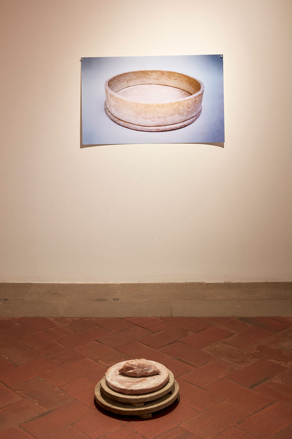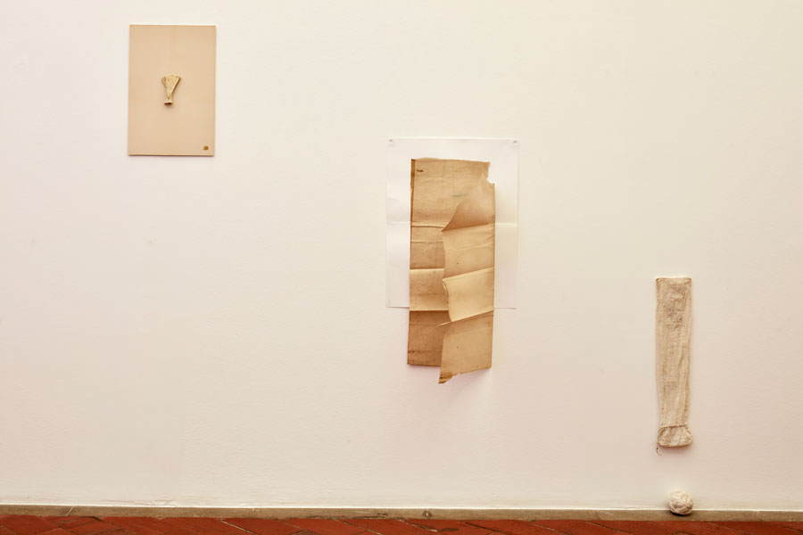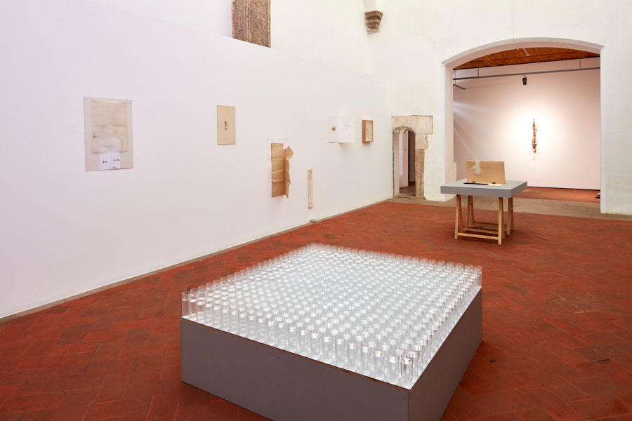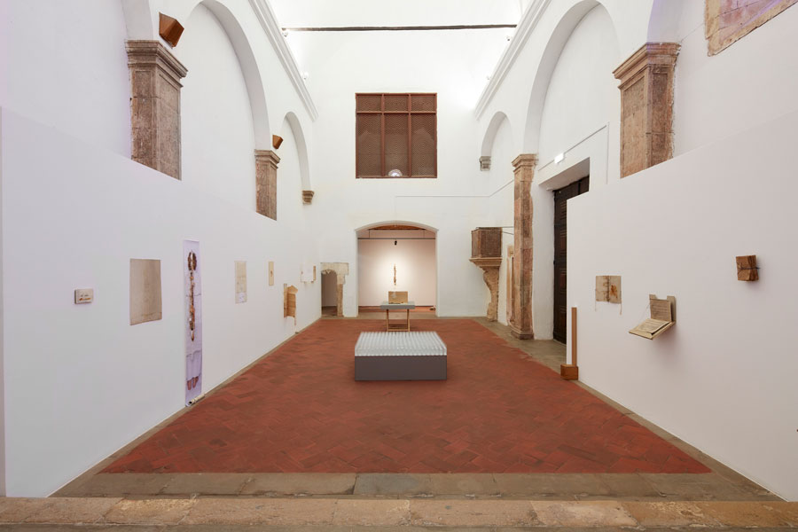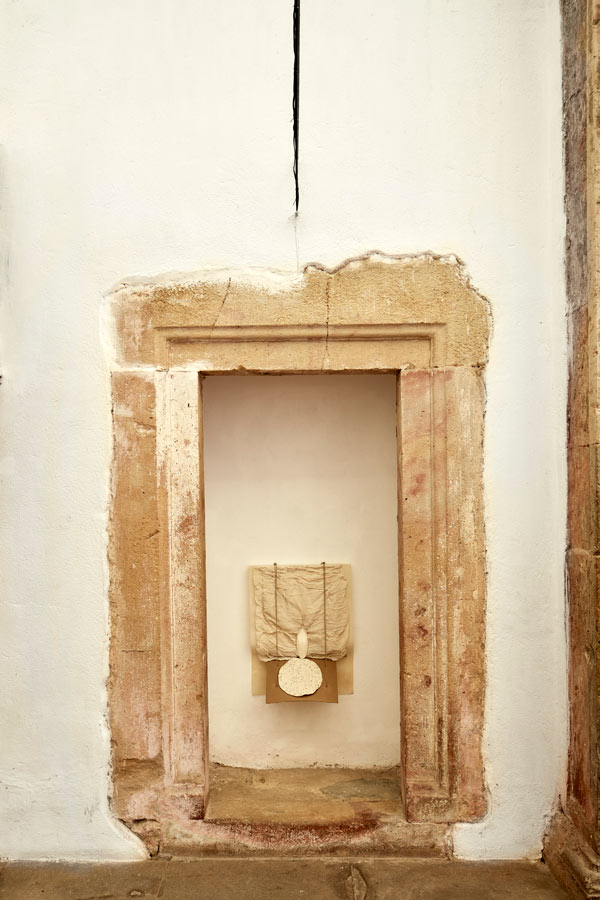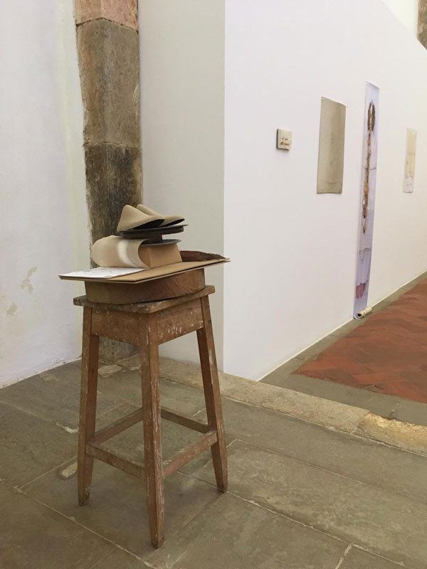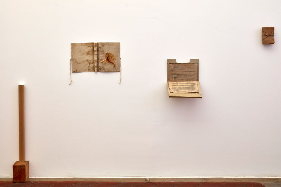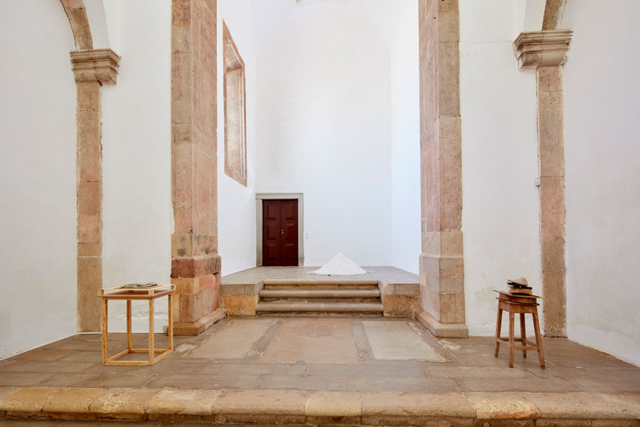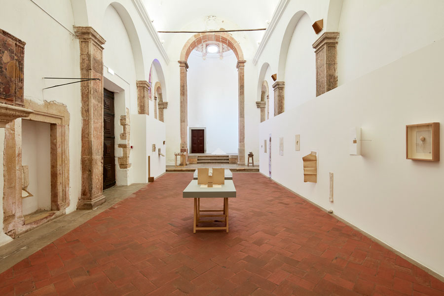 O canto dos pássaros flutua no ar, e no exterior da capela, um ninho de aves permanece no topo de uma das torres do museu. A água e o sangue não vivem sem o ar. Mas houve quem quisesse ir mais longe, mais alto. Ícaro desejou qualquer coisa que não é sua, por natureza. O Erro de Ícaro (2021) apresenta uma diversidade de objectos depositados sobre um banco (moldes de sapatos, espalhadores de calor, o desenho de um pé, restos de cera, penas). Em conjunto, estes objectos levam-nos a especular sobre o erro de Ícaro. “Não ter medo”. De acordo com Maria José Oliveira, o «erro», ao partir da experiência, é uma afirmação. É possuir a certeza do que se é, criando e arriscando no contacto com o mundo, com a matéria que ele nos fornece. Se Ícaro cometeu um erro, certamente não foi ter desejado voar. A intersecção entre orgânico e inorgânico, ou o que vem da terra, e o que vem das mãos - como as asas de Ícaro moldadas por seu pai -, apresenta-se em obras como Flutuar para voar (2021), e Território (1995/2021). O gesto da mão, e o seu ofício fazedor, intersectam- se com elementos com origem no mundo natural - concha de choco, espinha de peixe -, que nos convidam a penetrar no avesso das coisas vivas, no seu interior. A memória é preciosa e as mãos guardam-na, tocando aquilo que nela não é conciliável com as formas do corpo. Com ele, preserva-se o vestígio de algo que agora é eterno, e por isso, vivo, como Cíclade, osso adivinhatório (2020/2021).