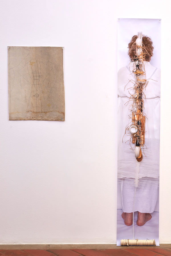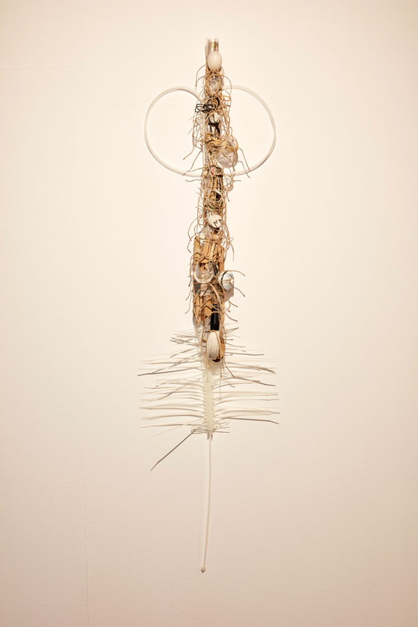 Ao ritmo da vida, na escuta da terra e perante a sua mutabilidade praticamente invisível mas perscrutada pelo tempo, e pelo corpo, Estamos aqui porque voámos diz-nos sobre isto de se estar vivo, de se ser vivo. À entrada da capela, Coluna Vertebral ou o princípio do mundo (2019), apresenta uma «coluna» composta por elementos de natureza heterogénea. A coluna de Maria José Oliveira possui no topo um ovo e uma lâmpada, algo que também encontramos na obra Universo e luz (2017). O ovo é uma questão actual. Um princípio. Parece que este problema, do ovo e da galinha, permanecerá connosco até ao fim. Lembrando o conto de Clarice Lispector, “Quando morri; tiraram de mim o ovo com cuidado. Ainda estava vivo. — Só quem visse o mundo veria o ovo. Como o mundo, o ovo é óbvio.” [1]. O princípio do mundo é também o que lhe dá a morte, mas a morte pode ser entendida como um princípio vital. A morte como matéria viva, é o fundamento dos que fazem dos restos, dos ossos, diamantes. Tesouros. No fim da vida, o corpo liberta gases, e se a luz é a potência que inflama o princípio desta coluna vertebral, ela lateja também no fim. Com o Ar. Tudo isto parece desenhar uma elipse achatada, e a luz e o ovo podem afinal partilhar alguma afinidade. Ao percorrer com os olhos a coluna, encontramos objectos de uso quotidiano (facas, uma chávena, molas, pedaços de madeira, fios, letras inscritas em pedaços de madeira, pincéis). Todos os objectos estão atados com corda, cravados uns nos outros, formando uma linha vertical, da qual, na extremidade inferior, surge a espinha de um peixe, sucedida por uma pequena cauda. Ao partir da coluna para pensar a génese do mundo, Maria José Oliveira coloca na fisionomia das espécies e no mundo natural, o eixo sob o qual assenta a origem do mundo. Esta ideia ecoa as teses de Charles Darwin. Com o seu trabalho, Darwin destruiu a crença em torno da origem divina, e no lugar desta, colocou o processo natural de selecção e transformação das espécies do qual deriva a sua vida, mutabilidade e sobrevivência no tempo. A coluna vertebral de Maria José Oliveira reverbera igualmente o contributo de Donna Haraway. A autora interdisciplinar, também bióloga, em Staying with the Trouble, Making Kin In The Chthulucene (2016), trata a hipótese do cruzamento das narrativas entre espécies naquilo que designa por «narrativa multiespécie». Trata-se para Haraway de cruzar humano e não humano, uma perspectiva que visa subverter a narrativa do humano como espécie soberana, dona da história e do mundo. Curiosamente, a capa do livro de Haraway, é um esqueleto heterogéneo, composto por partes da ossatura humana, articulada com seres vivos de outras espécies. Os objectos que compõem a coluna vertebral de Maria José Oliveira confluem várias narrativas, aquelas inscritas no uso e na vida dos objectos, também partes da vida da artista. Há por isso uma multiplicidade de media, mas também de tempos. Os tempos que atravessam as histórias que levamos na coluna e nos ossos. Quantas serão as narrativas que carregamos?