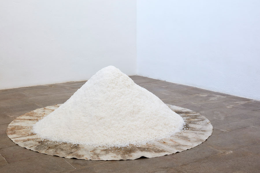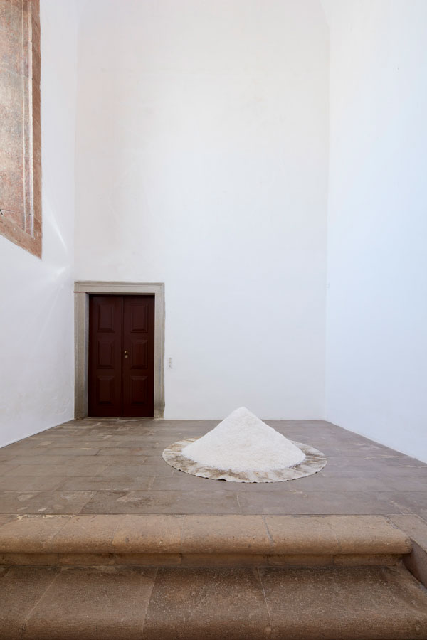 Em Sal Sobre o efeito do tempo (2021), a artista apresenta um montículo de sal sobre tela crua. O tempo torna-se matéria criadora, aquilo que José Gil refere como o «trabalho artesanal do tempo», manuseado por Maria José Oliveira. A tela crua, cortada na forma de um círculo, foi parte de uma intervenção de land art executada pela artista. A tela crua exposta aos elementos naturais num período extenso, inscreveu nela as manchas do mundo (provocadas pela acção das folhas, da madeira dos troncos, dos ramos, da terra, da chuva, do vento). Sal sobre o efeito de tempo é um trabalho que reenvia a essa mutabilidade que o mundo natural produz, e que nesta obra é aliado a uma matéria com uma carga ancestral. Também o sal atravessou tempos. Tendo tido diversos usos, o sal foi moeda de troca, conservante, curativo, alimento. O sal atravessa inclusive, a nossa própria pele, o nosso tecido, e assim parece que o eco destes objectos, a sua ressonância, está também dentro de nós.