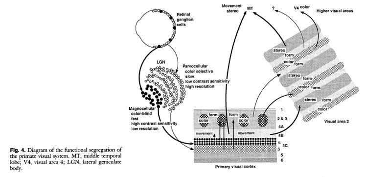 É um facto que os mecanismos fisiológicos afetos à perceção visual se desenvolveram em função da sobrevivência dos organismos no seu meio ambiente. Todo o sistema visual se encontra em permanente alerta, seja para regular funções orgânicas elementares, seja para despoletar a reação a eventuais situações de perigo. Em função dessa exigência, o dispositivo visual desenvolveu uma enorme maleabilidade face a múltiplos estímulos – luz ou ausência desta, movimento lento, rápido, muito rápido, etc. Trata-se de operações aparentemente simples, mas que foram fruto, ao longo do tempo, de uma complexa evolução dos órgãos. Quando existe irradiação de luz, esta é imediatamente detetada através de uma reação automática, inconsciente, e o mesmo se passa em relação à deteção de movimento ou mesmo à necessidade de centrar um objeto no nosso campo visual, para o isolarmos e o reconhecermos através da sua forma, escala, cor ou textura. A neurociência tem-nos elucidado como, na perceção visual, as imagens se formam, em grande parte, já na própria retina, constituindo aquilo que se designa por campo ou ambiente retiniano. Este específico ambiente no qual as imagens se apresentam será apenas um passo um conjunto de operações intrincadas, que implicam toda a complexidade do sistema neuronal. Mas, na sua expressão imediata, contemplar/perceber imagens, expondo-as diretamente na retina, significa explorar fisiologicamente o campo visual, mapeando no córtex visual a sua projeção na retina. Isto ocorre sobre o pano de fundo da relação (em permanente movimento) entre o organismo e o ambiente, a qual o aparelho percetivo pode limitar-se a simplesmente duplicar e confirmar. No entanto, nesse contexto, o mínimo facto relevante vai ser imediatamente registado e induzir uma reação. O campo retiniano forma um ambiente singular no contexto do nosso complexo sistema visual, e pode-se considerar o ponto de partida para a contemplação do mundo. Assim, tendo em conta o presente contexto, a maior ou menor acuidade com que observamos um objeto prende-se com a curiosidade e a atenção sobre o mesmo e as suas implicações para a própria sobrevivência. Num primeiro momento, tudo aquilo que é selecionado, e simultaneamente o que é simplesmente ignorado, depende já de uma semiótica do organismo, e do modo como os seus processos simbólicos estruturam a perceção. Este fator está presente em todo o acto de ver e, em particular, em qualquer relação que se estabeleça com a imagem, mental ou pictórica, começando na própria sensibilidade do olho. Essa dimensão puramente ótica do simbólico revela-se fundamental para a arte moderna. Na medida em que esta valoriza, e procura, a rutura no simbólico – sem que de modo algum possa verdadeiramente aboli-lo – é muitas vezes através da redução aos seus componentes elementares que ela vai prosseguir, estrategicamente, esse objetivo. Assim, vamos ter múltiplos processos de redução: impressionismo, simbolismo, cubismo, surrealismo, expressionismo, minimalismo. Em qualquer caso, essa redução faz-se ou investindo diretamente a dimensão sensível e material, na sua sensibilidade e materialidade, ou investindo o próprio simbólico, de tal modo que este não pode ficar intacto – como é o caso do simbolismo ou do surrealismo – ou ainda provocando o curto-circuito das duas dimensões – como faz frequentemente o expressionismo. De qualquer modo, a imagem passa a estar em questão, de tal modo que o ótico, na sua imediatez, é diretamente convocado, mesmo que seja, como em Duchamp, para o negar – em nome do cérebro e dos seus processos simbólicos, que, como nos ensina a neurociência, estão já presentes no olho, na retina. A forma como a luz é capturada passa, assim, a constituir um primeiro fator decisivo para percebermos o mecanismo que preside à leitura de uma imagem. A luz chega ao olho em diferentes comprimentos de onda e intensidades, e é justamente na diferenciação desses comprimentos de onda e dessas intensidades, e da sua distribuição espacial, que consiste a sensibilidade do olho. Para realizar a diferenciação de um modo seletivo, possibilitando a formação de imagens a partir do que pode surgir como caos indiferenciado, o olho dispõe um conjunto de mecanismos que calibram a sua sensibilidade, preparando e mesmo antecipando o tratamento da informação pelo córtex visual [3]. Em primeiro lugar, os fotorrecetores – em especial os cones e os bastonetes [4]. No entanto, o ambiente retiniano não é povoado apenas pelos fotorrecetores. São conhecidas mais de oitenta tipos de células na retina humana, desempenhando diferentes funções especializadas no processamento da informação visual (e, em alguns casos, não visual), e organizando-se em diferentes vias neuronais conduzindo ao cérebro. As células ganglionares constituem um elemento chave deste processo, recebendo toda a informação proveniente dos fotorrecetores, e enviando-a para o cérebro. São os diversos tipos de células ganglionares que separam a informação visual, especializando-se em diferentes características, tais como luminosidade, contraste, movimento, cor ou espacialidade. E cada tipo de célula ganglionar constitui, por si só, uma rede de campos recetivos que recobre o espaço retiniano, canalizando para o cérebro um tipo específico de informação. Desse modo, cada ponto da retina parece ser representado por diversos canais especializados de informação, correspondendo, cada um, a um diferente tipo de célula ganglionar. Contudo, ainda não há acordo sobre a forma exata, e as diferentes modalidades, que assume o processamento da informação. Quantas vias neuronais existem, que informação veiculam, e como se relaciona essa informação com o conteúdo percetivo [5]? A conceção atual do processamento visual resulta, em qualquer caso, da confluência de diversas linhas de investigação: prim