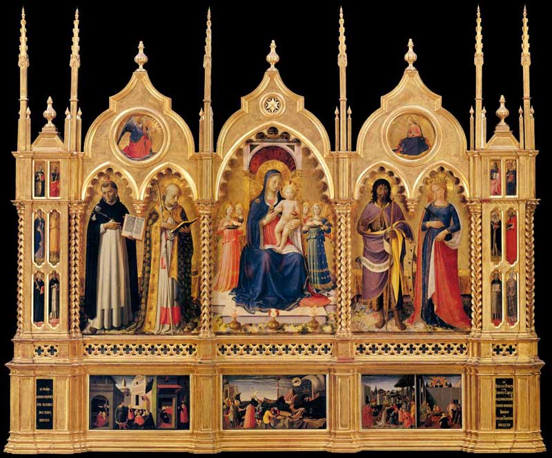 O painel central representa São Nicolau como o patrono dos marinheiros. O cais aparece num primeiro plano em jeito de filete horizontal que atravessa toda a pintura. O próprio São Nicolau aparece aqui agraciando a cena. Ao fundo, o mar, formando uma baía, em tons verde-escuros, do lado esquerdo, e castanho-esverdeado, e apresentando alguma agitação, do lado direito. Do lado esquerdo, dois navios estão fundeados na baía, enquanto que, do lado direito, fora da baía, um terceiro parece envolto pela tempestade. No recorte da baía aparece uma elevação em tons rosa, com um forte no seu cimo. No horizonte, um céu que da esquerda para a direita estabelece um arco de luz claro-escuro em tons cinza. E temos pela segunda vez o santo representado. Agora aparece por entre as nuvens, olhando para o interior de um dos navios, no qual se veem marinheiros juntos, em pose de oração. Na verdade, o painel justapõe a narrativa de dois milagres de São Nicolau: à esquerda, o Milagre do Cereal – no qual o santo, quando a fome assolava Myra, convence os marinheiros que levavam o trigo ao imperador a descarregar o necessário à alimentação da cidade, garantindo-lhes que o peso que transportavam não diminuiria. À direita, o Milagre do Navio – no qual, durante uma tempestade, os marinheiros de um navio em perigo invocam em seu auxílio o santo, que surge efetivamente no navio e os ajuda a salvá-lo. O dispositivo narrativo é desconcertante, e a sua leitura é estranhamente sublinhada pela modelação luminosa. De facto, o já referido arco luminoso, que domina toda a atmosfera deste painel, articula a passagem de uma cena para a outra, o que nos outros painéis acontecia a partir da construção espacial, nomeadamente através dos elementos arquitetónicos. No conjunto da predela, é notório que Fra Angelico não respeita a unidade espacial, que era a condição do dispositivo narrativo que se exprimia no conceito de istória, avançado à época por Alberti, e exemplificado pela prática de Masaccio. Na predela. o espaço é um patchwork de elementos arquitetónicos espacialmente contraditórios. Esse espaço contraditório – que, decisivamente, ainda se constitui, apesar de tudo, na aparência de um espaço cénico – permite a Fra Angelico articular, num mesmo painel, já não os diferentes momentos de um mesmo episódio, como em Masaccio, mas diferentes episódios disjuntos. No painel central, a articulação dos dois episódios que já referimos não é feita através deste dispositivo arquitetónico. Neste caso, Angelico, ao invés de desconstruir o espaço masacciano através da recusa da unidade perspética e arquitetónica que sustentava o desenrolar da istória, recua para os espaços – pré-masaccianos – de Lorenzo Monaco e Gentile da Fabriano – cujo São Nicolau salvando um navio da tempestade é, aliás, explicitamente citado por Angelico no lado direito do painel. Se esses espaços não se estruturam através do recurso a elementos arquitetónicos, esta aparente regressão vai possibilitar a Fra Angelico a abordagem de um outro problema: a luz e a sua unidade. Por um lado, toda a pintura parece flutuar num ambiente atmosférico tridimensional: quando a sua estrutura é analisada em pormenor, podemos constatar que não existe uma perspetiva dominante, e que esta é usada localmente e de um modo extremamente fragmentário. Basta que observemos as proas dos navios para que imediatamente nos apercebamos de que os ângulos de captação são diferentes. A perspetiva não é usada para estruturar o espaço, como apesar de tudo ainda sucedia nos outros dois paineis da predela, aplicando-se simplesmente à definição espacial dos objetos. Mas aquilo que é verdadeiramente notável diz respeito à luz, e à forma como Angelico a aplica na pintura. Começa por iluminar todo o quadro da esquerda para a direita. As cores usadas pelo pintor são, grosso modo, muito esbatidas, com relevo para o esverdeado e para um céu timidamente iluminado, ponteado com pequenos traços de cor. Apesar de Angelico demonstrar um grande domínio das técnicas de modelação espacial, nitidamente não é procurada uma grande aproximação à realidade. Mas, indo além dessa aparentemente escassa preocupação naturalística, da esquerda para a direita do painel, é a própria luz que se transforma, descrevendo, no céu, um subtil arco de luminosidade que, da esquerda para a direita, escurece e perde saturação, enquanto o seu matiz cromático se transforma progressivamente, de um amarelo esverdeado num verde azulado. Simultaneamente, o mar, que do lado esquerdo é verde escuro, torna-se, do lado direito, mais escuro e acastanhado. Por outro lado, o navio à direita, no qual os marinheiros rezam, parece ter como principal fonte de iluminação – pondo-o em relevo face à escuridão que o envolve – a luz que emana da figura do próprio santo, que surge no céu envolto num halo luminoso. A conjugação destes fatores – perda de luminosidade e saturação, distorção cromática, iluminação local contrastada – permite-nos identificar claramente o que poderá passar despercebido a um olhar mais distraído: a transição entre uma iluminação diurna, à esquerda, e uma iluminação noturna, ou crepuscular, à direita. É também possível, a partir daí, estabelecer uma ligação entre este invulgar dispositivo e a obra de Gentile da Fabriano, que aqui Angelico parece ter querido homenagear. De um modo mais evidente, a cena representada à direita do quadro de Angelico é, como já referimos, uma citação do São Nicolau Salvando um Navio da Tempestade, de Fabriano, que se encontra atualmente no Vaticano, e era o painel central da predela do Políptico Quaratesi, executado em 1425 para o altar da capela dos Quaratesi na igreja de São Nicolau Oltrarno, em Florença. No painel de Fabriano, há uma sugestão de ambiente noturno, através dos tons profundos e escuros do mar (verde) e do céu
