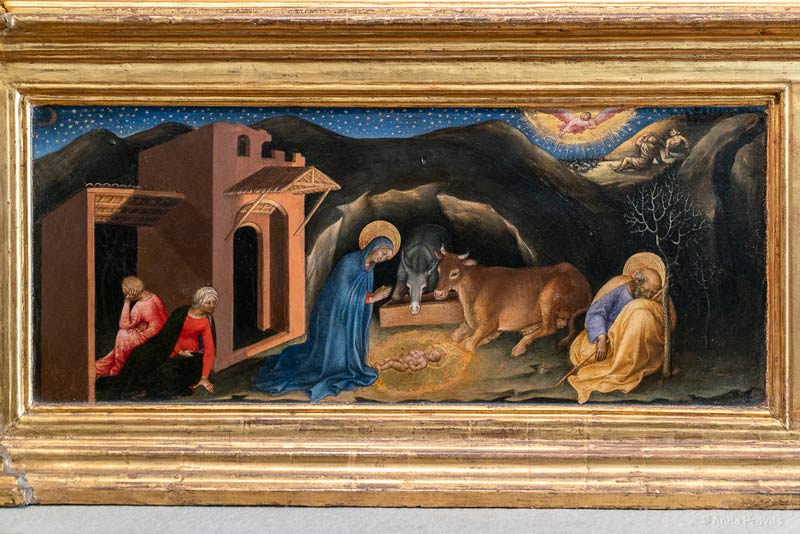 [1] Retirado do altar-mor da capela no século XVII, este retábulo foi posteriormente desmontado e disperso. Já no século XX, o retábulo foi reconstítuido, montado numa nova moldura, sendo os paineis esquerdo e central da predela, que se encontram no Museu do Vaticano em Roma, substituidos por cópias. O retábulo assim reconstituido encontra-se no museu de Perugia.