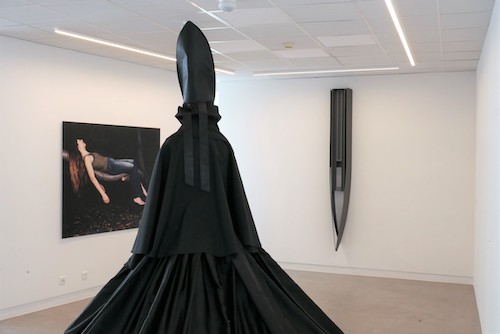 Eis-nos no triângulo: À esquerda, a papisa suspensa com a sua fálica mitra, suspende qualquer pensamento. É negra como a noite, e é hora de atravessá-la. Esta escultura de Ana Rito, torna público o curador, foi apenas vista uma vez, há 17 anos. Mais do que em qualquer outro momento da exposição, torna-se aqui visível a coincidência dos opostos; a matriarcal papisa suspensa na sua graça é coroada pelo símbolo patriarcal fálico. É, portanto, duma criadora que se fala. Diz-nos Marie-José Mondzain: