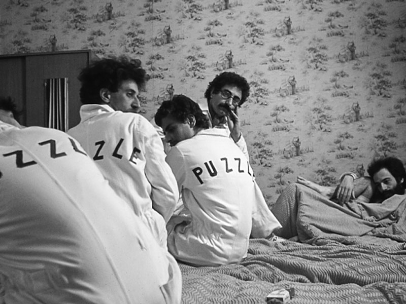 O grupo Puzzle nunca produziu pintura de cavalete, no sentido clássico de uma prática artística organizada através da composição, do equilíbrio entre as partes e o todo, ou mesmo de um trabalho singularizado que o artista dá por concluído no atelier. A sua pintura é eminentemente performativa: subentende a articulação entre projeto individual e coletivo, forma e função, pintura e performance, documento e obra de arte, momento histórico e arquivo. É um trabalho que remete para a possibilidade de participação, improvisação e mutação, entendida como compromisso instável entre cada indivíduo e o coletivo, entre o grupo e as diversas comunidades que o identificam. A obra do Puzzle não se afirma técnica, temática ou conceptualmente fechada; é plural e dependente da própria instabilidade do grupo, dificilmente sobrevivendo descontextualizada da experiência política e social da revolução democrática vivida em Portugal em abril de 1974. Não sendo site specific, a obra do Puzzle foi elaborada para responder a situações e formas de expor específicas, procurando refletir o contexto da sua experiência. Embora algumas pinturas tenham viajado, no final dos anos setenta, em representações de “Arte Portuguesa”, todos os trabalhos do grupo se podem ler através do calendário de exposições para o qual foram realizados. Esta cronologia é uma fiel representação de um contexto cultural em plena transformação, simultaneamente local e internacional. A desmontagem de uma relação contemplativa com a arte levou os artistas a procurar diferentes soluções para desenquadrar uma obra que, paradoxalmente, continuava a ser pintura. A vontade partilhada de desmaterialização, e o foco no processo participativo, conduziu o grupo à construção de obras compostas por recolhas in situ e por vezes à destruição performática das mesmas. A presente exposição apresenta um somatório de pinturas e de objetos que foi possível identificar e recuperar, dando particular relevância aos seus contextos de apresentação e à performance do grupo. Não sendo possível reviver momentos efémeros e irrepetíveis, recorremos ao visionamento de materiais de arquivo, associados a novas formas de expressão como a performance, que nos permitem mapear a constituição de alternativas culturais e a expansão da noção de arte.