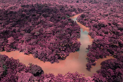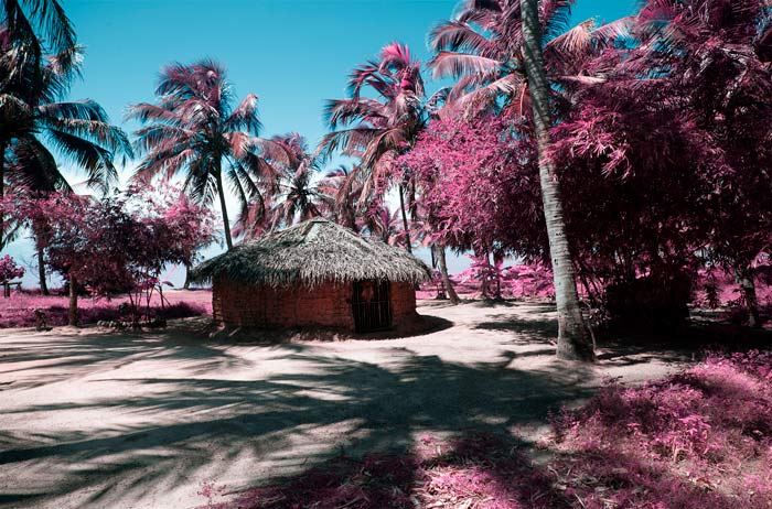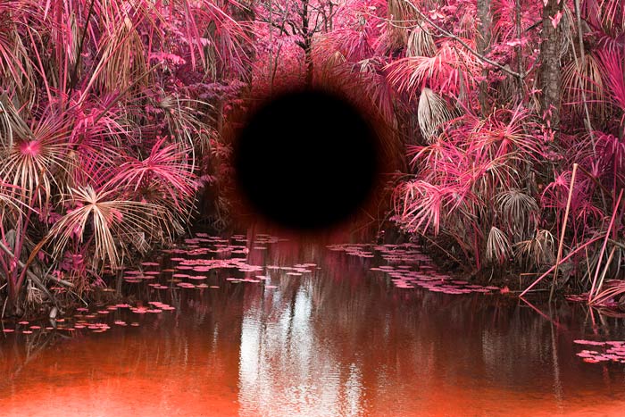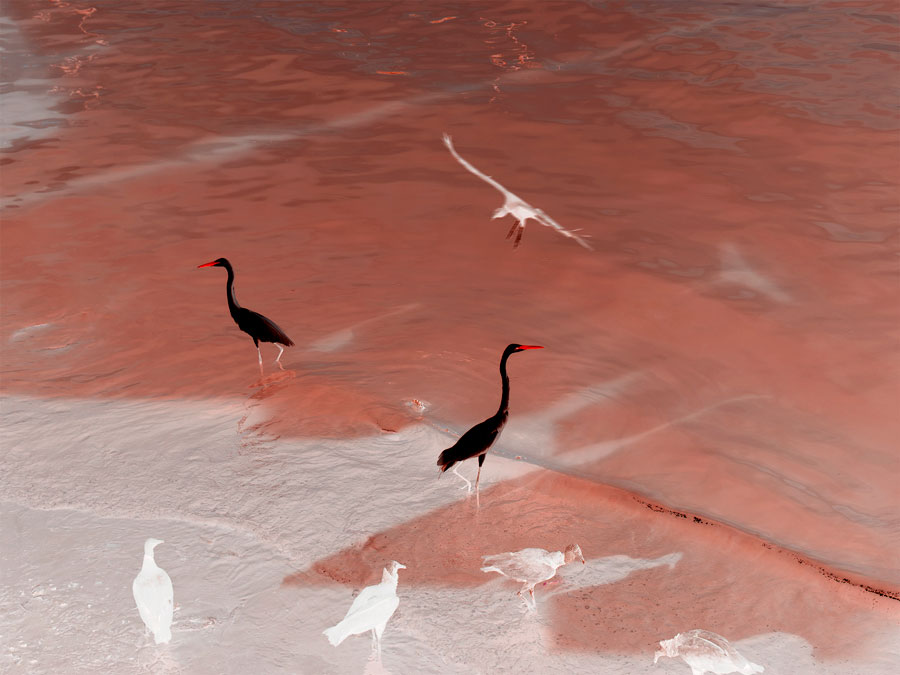 Homenagem a esta luta que se faz cada vez mais urgente, a oca infra-vermelha de Ângela recebe um banho de purpurina, a vista aérea do encontro dos rios na grande selva é cor de rosa, e o sol da última balada, fúcsia, também. Rosa também são as aves pintadas sobre uma paisagem preto e branco, as palmeiras do açaí e o papagaio, a casa no rio, a boiada, o limiar tênue entre o fogo e a liberdade. Paixão, vida, tesão, risco, grito, ardor, fogo, o terreno crepuscular entre a vida e a morte, território nativo, terra ancestral, direito de toda a humanidade. Há gestos – porque estas estratégias de intervenção sobre a imagem fotográfica são gestos de identificação, estranhamento e classificação – que trazem à consciência o pensamento acerca da magia e do onírico do segundo e último manifesto de Glauber Rocha. Diante da impotência e da perplexidade com os rumos políticos do Brasil pós-golpe de 64, o horror das ditaduras militares, o transe político e de consciências, a perda total da liberdade, Glauber se dirige a uma nova questão, a mesma que guia a inquietação de Ângela Berlinde em Transa_Baladas do último sol: não faz sentido lutar no campo da razão opressora, mas nos territórios da desrazão, do absurdo e do mito. Só que no lugar da violência transgressora, para atravessar o adormecimento do sentido e da sensibilidade, Ângela apela à gestualidade da estética do afeto e insere uma lágrima de cristal no olho de Iracema, preenchendo de luz tudo aquilo que parece estar sendo jogado às margens escuras do abandono e do esquecimento. A história continuará a insistir: a lágrima de Iracema nos interpela com dor e amor, e nos deixa sem palavras: não poderemos esquecê-la. E que assim seja.