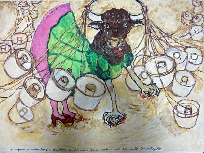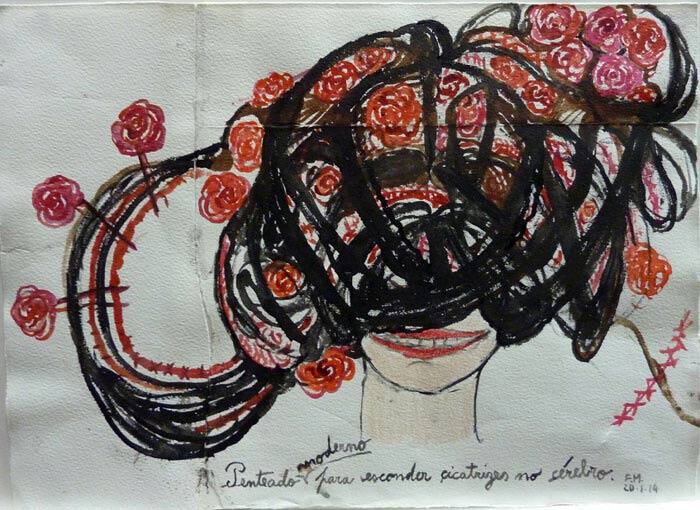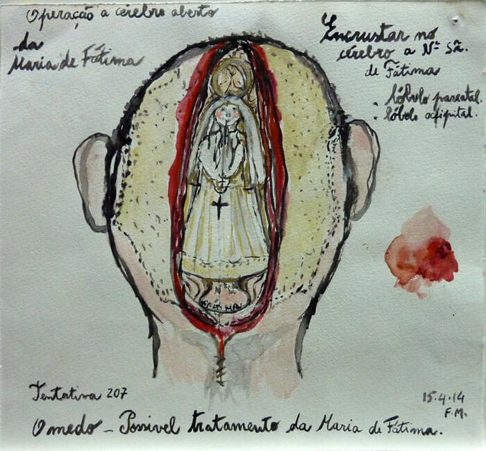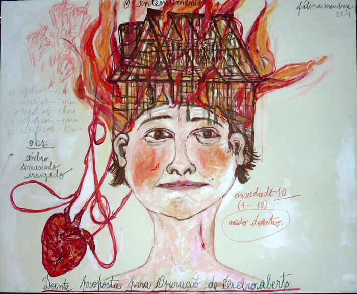 Há quem veja Fátima como uma mulher com medo. Ela admite que, em parte, pode ter culpa disso. A sua pintura é feita de caras deformadas, casas que ardem, cabeças, cérebros, novelos, feridas, bolos prestes a rebentar. Mas também é feita de animais e dias de sol. “Pinto a vida quotidiana”, diz, admitindo poucas barreiras entre a sua produção artística e a sua vivência diária. Porém, há nesta declaração uma ironia circunstancial. O encontro na Galeria 111, que a representa desde 2000, tornou distante a sua casa, atualmente, o seu lugar de trabalho – o atelier tornou-se insustentável. Fátima Mendonça nasceu em Lisboa e tem 59 anos. Foi casada com o artista e professor Rui Serra, e venceu o Prémio Maluda de Pintura, atribuído pela Sociedade Nacional de Belas Artes, em 2001. É filha de “pessoas humildes que lutaram muito para conseguirem ter uma casa”, conta Maria Arlete Alves da Silva, amiga próxima da artista e uma das responsáveis pela galeria que a representa. Logo à partida, esta consideração, vinda da voz de Arlete, e não de Fátima, fundamenta o resguardo da artista, que não obedece à revelação crua das suas obras. Separa-as, também, um quotidiano: Arlete passa os dias no seu preenchidíssimo escritório no Campo Grande, a partir do qual gere a galeria com o seu filho, Rui Brito; já Fátima fica em casa, vai ao Facebook, faz as suas pinturas e gere a “chatice” que é cozinhar “as mesmas batatas, os mesmos legumes e o mesmo peixe.” O que não diz parece tão importante quanto o resto. Admite que se dá com muito poucas pessoas, por ser “muito vulnerável, ter tudo à flor da pele.” Num esgar feliz, quase pueril no seu atrevimento, Fátima revela que a sua paixão pelo desenho remonta aos primeiros anos de crescimento. “Lembro-me de estar na primária, e achar os meus desenhos muito mais bonitos que os dos outros”, diz, recordando que a professora não lhe assinava os desenhos, porque não queria deixar a sua marca num desenho que achasse bom. “Mas também havia um interesse especial nos outros desenhos bonitos.” É aqui que as palavras de Fátima, singelas e simples, mais se aproximam da sua produção artística: nos seus traços rápidos e instintivos, vemos uma menina feliz, assoberbada pelos traumas de adulta. “No liceu, senti que era importante, para o meu equilíbrio mental, ter algo onde me pudesse exprimir e comecei a fazer teatro." Abandonou esta prática pouco depois. "O teatro tinha um espaço de tempo e depois acabava, ao passo que, quando se faz uma pintura e um desenho, elas mantêm-se.” Este fascínio pela pintura e a sua permanência, levou-a a juntar-se, em 1994, à Galeria Arte Periférica. Terá sido apenas em 2000 que integrou a galeria da sua agora amiga Arlete. “Ela fez uma peça sobre um circo que levou para a AR.CO e eu fiquei absolutamente deslumbrada com aquele tipo de linguagem, muito crua" revela a amiga. Mas foi só quando organizou uma exposição na Irlanda, no contexto de uma visita do presidente Jorge Sampaio, que se lembrou de Fátima. "O meu marido não queria que eu expusesse os trabalhos da Fátima, mas eu levei a minha avante. Quando ele viu a exposição, começou a fazer um rapa pé à Fátima para vir trabalhar conosco”, conta, divertida. Fátima Mendonça terá chegado à Galeria 111 na mesma altura de outros artistas que, por lá, também, passaram, como Joana Vasconcelos ou Ana Vidigal, hoje nomes consagrados na arte contemporânea portuguesa. Fátima, no entanto, parece ter ficado esquecida no tempo. “A Fátima e o Rui Serra foram muito acarinhados pelo António Pinto Ribeiro (programador da Culturgest entre 1993 e 2004). A obra muito pessoal interessava muito ao António, mas com a sua saída da Culturgest, esse elo quebrou-se. Ter ficado em Portugal marginalizou-a um bocadinho”, diz Luísa Soares de Oliveira, crítica de artes plásticas no jornal Público. Admite que a obra de Fátima foge das tendências atuais da arte contemporânea em Portugal, caracterizando a sua produção como “muito boa”, mas “marginal.” “Ela própria se marginaliza”, admite. “Está fora do circuito de arte, não vai às exposições dos colegas. É muito fechada.” Arlete confessa: “Eu gosto muito dela, porque é uma mulher muito inteligente, ainda que muito desequilibrada. Há uma linha que separa uma coisa da outra, e ela anda sempre resvés a cair para um dos lados.” Já Diana Costa, artista e professora, sublinha que, hoje em dia, “não há assim tantos artistas a fazer trabalho de conteúdo biográfico”, destacando a coragem da artista em expor as suas fragilidades. Caracteriza-a como uma “fortaleza expressiva e destemida.” Fátima, no entanto, não parece tão ciente disso. Pelo menos, a sua postura não abre espaço a auto congratulações. Entre memórias, recorda o seu fascínio por um desenho que, em criança, viu no chão, sem saber de quem era. “Tocou-me tanto que me lembro de sentir qualquer coisa no estômago.” Fátima é hermética, também, nesta revelação de influências para as suas obras. Na tentativa de outros nomes, evoca o pai e o avô. “Lembro-me de três ou quatro desenhos do meu pai quando ele fez a escola, que eu achava muito interessantes, ou de ver o meu avô a tentar desenhar partes de cavalos, ou partes de bolos, ou partes de chávenas num papel qualquer.” Apesar disso, confessa um certo não reconhecimento dos pais em relação à escolha pela vida artística, “os tempos eram outros. Nunca fui de pequenina levada a museus, nunca me puxaram para esse lado de artista plástica. Ficava mais fascinada com coisas do dia a dia”, sublinha. Arlete conta que, na sua infância, a mãe de Fátima fazia rissóis para fora. “Há imagens da Fátima com montes de cascas de camarão. Ela diz que a mãe comprava o camarão miudinho que era o mais barato, e ela e a irmã passavam dias e dias a descascar os camarões para os rissóis.