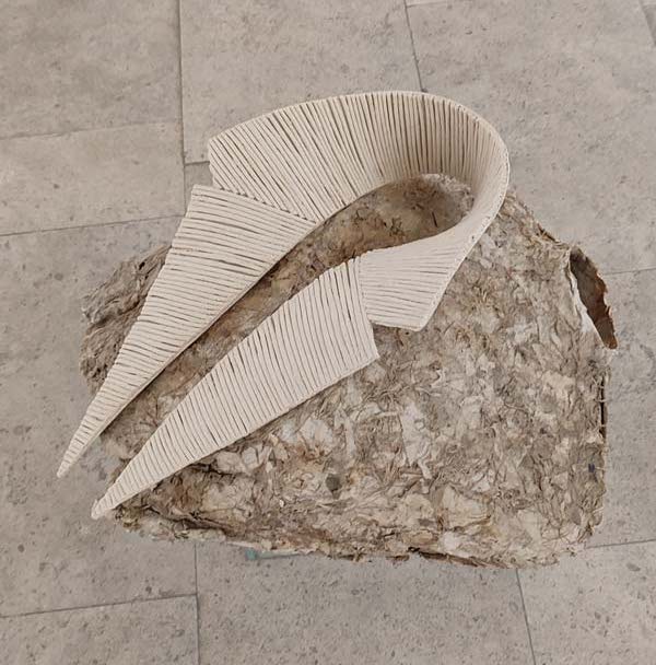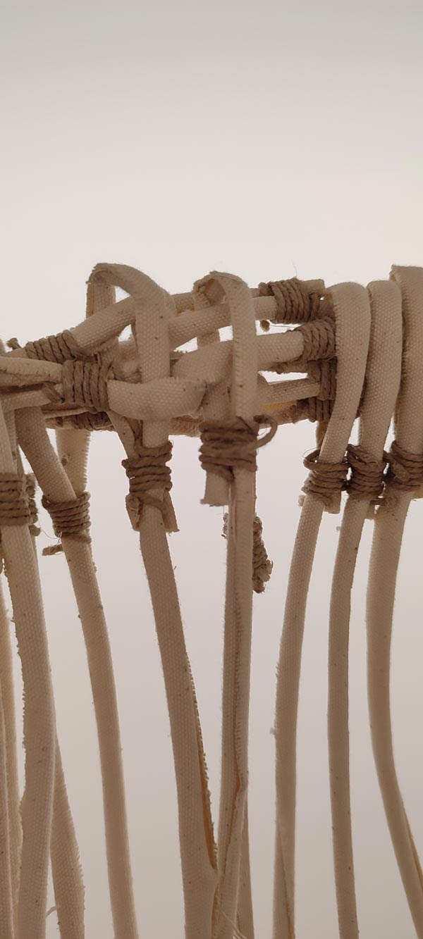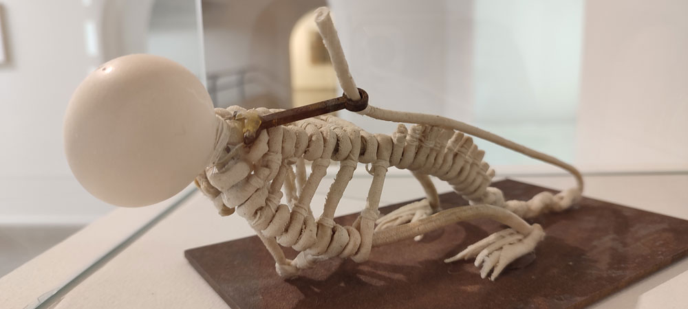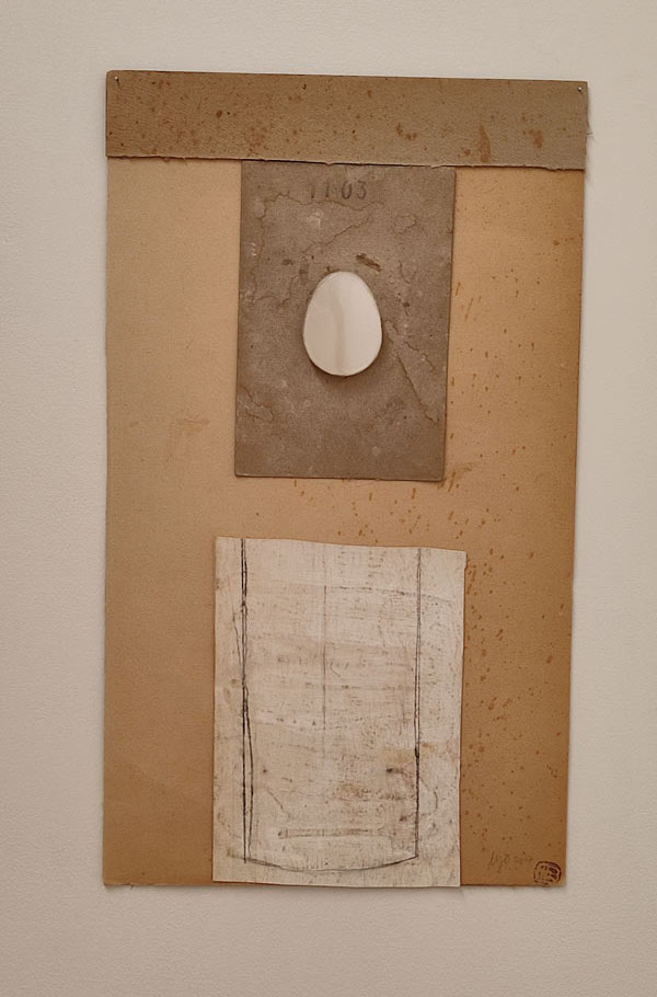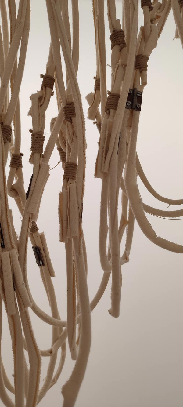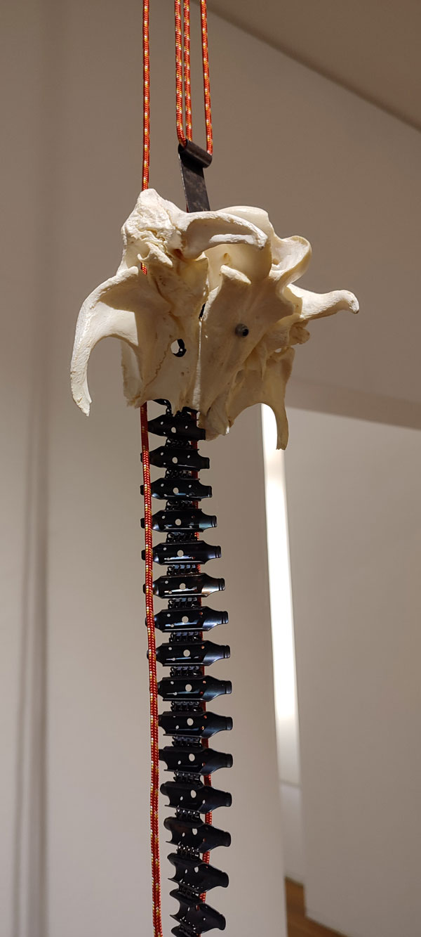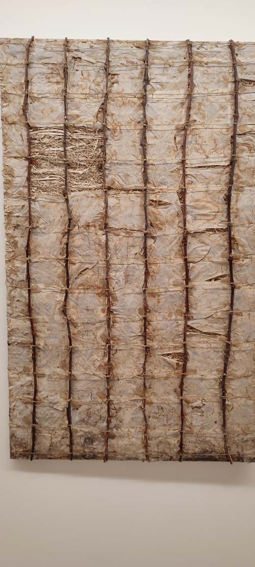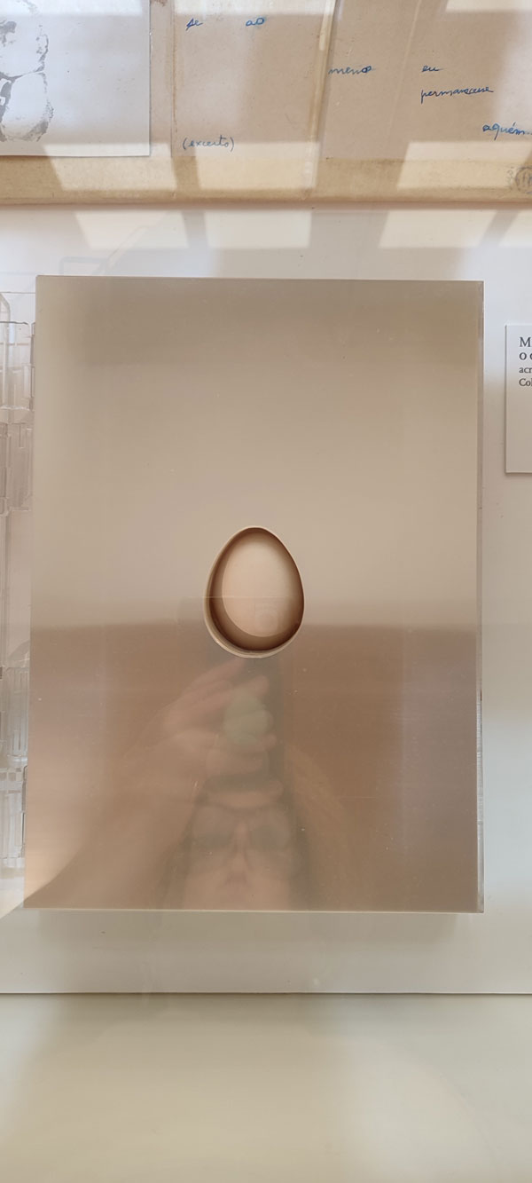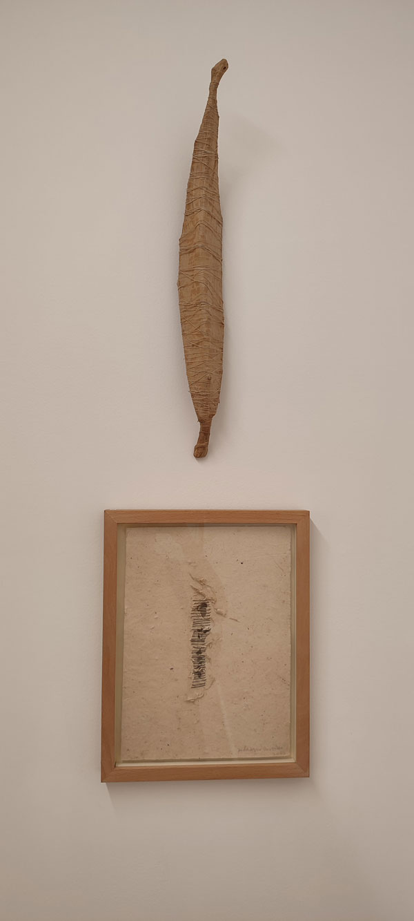 Quer José Gil, quer Eglantina Monteiro falam de uma componente cósmica no trabalho de Maria José Oliveira, e a verdade é que enquanto eu pisava o chão da Fundação Arpad Szenes Vieira da Silva, a minha mente estava também na White Cube Mason’s Yard, Londres, em 2016. Maria José Oliveira fez-me revisitar a exposição de Jannis Kounellis e viajar no tempo para o movimento Arte Povera. No trabalho dela vi o de Pier Paolo Calzolari, Giovanni Anselmo e Gilberto Zorio. A forma sincera como a artista expõe o interior das telas, quer em peças de parede, quer nas esculturas é desarmante, e ver peças feitas com tripa de vaca, com ovos, madeira seca, palha, fio de algodão, parafusos de ferro, barro cru, e o uso de tela tão ‘carna e osseamente’, é visceral e evocou a qual ferocidade do grito anticapitalista deste movimento, mas, no caso do grito de Oliveira um grito sobre a dor, e um ganir feroz de como é que se pode fazer poesia desta dor. A alusão a Frida Kahlo fortaleceu esta proposta a meu ver, e também a presença do feminino na exposição. Especulo inclusivamente que alguma desta linguagem plástica pode estar ligada à ferida, até mesmo a feridas pertinentes ao corpo feminino, sendo que o ovo se manifestou de diferentes formas nesta exposição: como cabeça de um esqueleto pequenino, embrionário, e dentro de uma caixa clinicamente posicionado no seu centro, caixa esta feita de forma que me remonta a um livro assético, médico. Um livro com certeza com muitas histórias para contar, mas que se Maria José as quisesse dizer em palavras, não nos apresentaria tais objetos!
