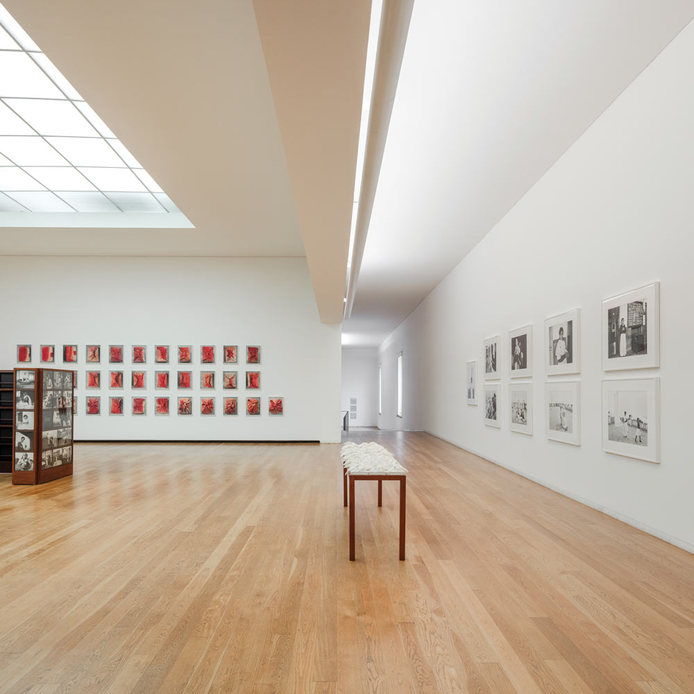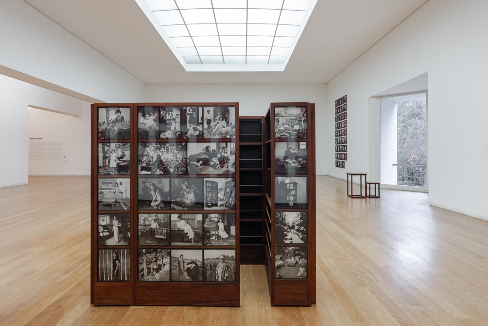 O desejo da artista para que as pessoas se movam entre as imagens, se curvem ou afastem delas como uma escultura, experienciando-as com o próprio corpo, alia-se à ideia de fluxo e à perceção da exposição enquanto organismo vivo e em constante mudança, quer reorganizando a arquitetura dos espaços expositivos, quer alterando as relações de vizinhança entre determinadas imagens. Ultrapassando os limites da fotografia e apresentando-nos um retrato comovente da sociedade indiana, a exposição Dançando com a minha câmara dá-nos a conhecer não só as instalações fotográficas de grande escala da artista, bem como o uso do formato livro, parte essencial da sua produção criativa: Quero ter a liberdade como artista de mostrar o meu trabalho na vossa casa, no parque, no comboio, num livro (…). A este propósito destaquemos expostos na parede, inseridos em estruturas de madeira, os híbridos livros-objeto que compõem Suitcase Museum (2015). A obra, revela-nos quarenta e quatro exemplares de um mesmo livro, apresentando cada exemplar - na capa e contracapa - duas das oitenta e oito fotografias que o compõem, e que combinadas de forma aleatória permitem que a narrativa e a sua interpretação, bem como as ligações entre as imagens, se alterem. Próximas, no chão, duas malas de viagem em couro onde a artista guarda e transporta as quarenta e quatro molduras e um catálogo, completam Suitcase Museum, reafirmando a itinerância da obra e conceitos de acessibilidade, mobilidade e mutabilidade de um museu que se traduz em livro. A importância dos jogos de ocultação/desocultação; frente/verso; presença/ausências e a criação de novas conexões entre as imagens, são uma constante ao longo da exposição atingindo o seu auge nos museus que, funcionando simultaneamente como expositores e arquivos, podem ser abertos, fechados, movidos ou reorganizados. Considerado pela artista a mãe de todos os museus, que potencialmente poderia conter todos os outros, Museum of Chance (2013) reúne 163 gravuras relativas a temas díspares como dança, música, cinema, locais de trabalho e espaços de convivência, bem como pessoas que a artista conheceu. Constituído por duas estruturas em teca de grande escala, que como biombos se abrem em diferentes direções criando vários padrões de visão e movimento, Museum of Chance apresenta imagens e textos de ambos os lados, sendo-nos possível observar no seu interior caixas em compartimentos de arrumação nas quais a coleção é armazenada, numa obra em constante fluxo e movimento. Na mesma sala, do lado oposto, dois museus de sistema retangular – File Museum (2012) e Little Ladies Museum 1961-present – parecem unir-se como peças de um puzzle, revelando-nos os seus lados exteriores móveis e abertos que, como capas de um livro, podemos redesenhar infinitamente. Ode aos arquivos, lugares de histórias e segredos com um perfume que Saramago definiu metade rosa e metade crisântemos, File Museum é simultaneamente um elogio ao papel e ao seu desaparecimento na era digital. Confrontando-nos com a solidão e o caos nos labirintos de arquivos burocráticos da Índia, as imagens revelam cenas semelhantes: espaços interiores cujas estantes nos atraem para o ponto onde a escuridão as cerca, ou onde mais prateleiras bloqueiam o nosso olhar. Arquivos, sacos, baús e caixas disputam o espaço; cadeiras vazias são sitiadas pelas pilhas de documentos que as rodeiam; às vezes, o chão é tomado por torres de papel. Distinto, embora considerado museu irmão do anterior e com o qual partilha conexões ocultas, Little Ladies Museum combina fotografias da artista e dos seus irmãos, captadas pela mãe de Singh, bem como retratos da fotógrafa sobre jovens e mulheres em diversas fases da vida. Museu de figuras femininas, reconhecemos neste labirinto atemporal, imagens icónicas de Singh - a da menina que se aninha na cama ou a da fotógrafa deitada no colo de Mona Ahmed - que se multiplicam e materializam noutros museus ao longo da exposição. Na parede em frente e em diálogo com Files Museum, Time Measures (2015) é, segundo a artista, um trabalho sobre o tempo e o culminar de anos e anos que passei em diferentes arquivos [3]. As trinta e quatro imagens, captadas de uma perspetiva aérea, revelam-nos maços de documentos embrulhados por tecidos de cor vermelha, cujas diferentes manchas e padrões - entre o vermelho, o beije e o branco - provocadas pela exposição solar, indiciam a passagem do tempo e onde cada nó, como um retrato, nos diz algo sobre o estado de espírito de quem o amarrou. Conceitos de arquivo e memória, desaparecimento e extinção atingem o seu pleno na série de 2021-22, Painted Photos em exibição na segunda sala dedicada à exposição. Assemelhando-se a pinturas, as provas fotográficas em pigmento de arquivo e tinta de esmalte sobre alumínio, apresentam espaços interiores vazios, labirintos de arquivos e prateleiras abandonadas, cuja sensação de espectralidade é acentuada pelo exercício formal da artista ao anular cores e contrastes, reduzindo as imagens à sua essência. A mesma sugestão de ausência e vazio acompanha-nos em Museum of Shedding (2016), museu que fiz para mim para própria e onde iria viver, espaço arquitetónico que evoca um interior doméstico, constituído por simples elementos de madeira: uma mesa, uma cama, bancos, duas unidades de arrumação. Para além do mobiliário, o museu aloja fotografias a preto e branco de diversos espaços habitacionais em imagens inquietantes e austeras, despojadas de presença humana. A importância da arquitetura no corpo de trabalho de Dayanita materializa-se nas restantes obras apresentadas no segundo espaço dedicado à exposição, a este propósito destacamos Architectural Montages (2019-21), composições que unem pelo menos duas imagens diferente, duas arquiteturas, duas temporalidades e geografias. Cortando e sobrepondo as fotografias manualmente, sem 