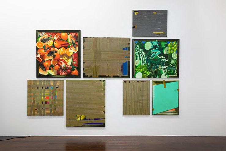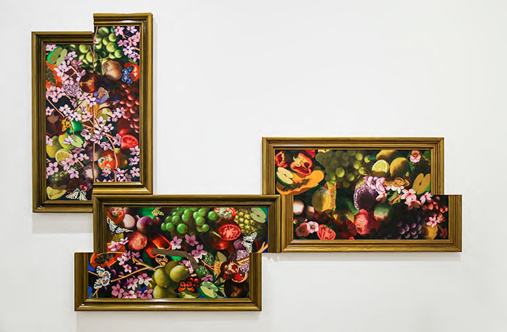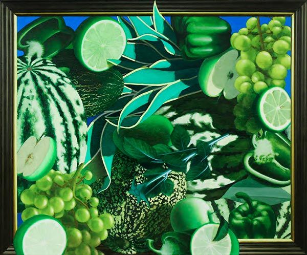 A exposição recupera também o tema das naturezas-mortas que podemos apreciar na pintura holandesa do séc. XVII, com Floris van Dijck ou Willem Kalf e, claro, na pintura portuguesa do mesmo século pela mão de Josefa d´Óbidos, por exemplo. Porém, a abordagem é distinta, no que respeita aos elementos, ao volume e à composição em geral. Enquanto, vemos riqueza numa natureza-morta muito frugal do séc. XVII, as naturezas-mortas de Rui Macedo representam um caleidoscópio de vários frutos e legumes num ambiente de superabundância como Baudrillard caraterizou a sociedade capitalista. Enquanto, o volume dos elementos das naturezas-mortas do séc. XVII, nos apelam aos sentidos como manifestação do divino, próprio da mentalidade barroca, nesta exposição o efeito é reduzido ao efeito de papel de parede como o vemos no ecrã do computador, o que nos apela a uma atividade mais mental do que sensorial. E enquanto, a composição barroca integrava vários elementos num diálogo compositivo-dramático, como pratos, jarros ou toalhas contra uma parede sóbria, estas naturezas-mortas não dialogam com outros objetos encontrando-se fragmentadas na própria moldura. Não falam do todo. Falam das partes, falam de divisão.