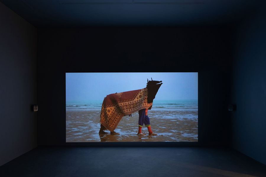 Luísa Santos, na sua crítica à exposição, refere que no diálogo entre a obra de Khorramian e de Farid tal aspeto quase atemporal se manifesta na obra de Laleh como uma ‘espécie de alucinação que nos leva simultaneamente ao passado e ao futuro’, e que na obra de Alia, este esfumaçado é provocado pela ausência de indicadores temporais ou locais, e que por se focar em tradições e rituais do passado nos oferece um ‘caminho para imaginar outras realidades’. O que o trabalho de Farid me trouxe não foi atemporalidade, mas pelo contrário, a questão do presente do ritual. As tradições podem ser do passado, mas se continuam a ser performadas, é porque também são do presente. A sua materialização ancorou-me. No presente, há uma questão taxonómica e linguística relativamente a rituais, cerimónias, celebrações e performances, que implica o discernimento de como estas são participadas e recebidas pelas suas comunidades. O reconhecimento de uma dimensão espiritual e/ou divina da nossa existência e por consequência a sua integração no nosso trabalho, é frequentemente rejeitado por uma variedade de círculos, famosamente o científico, mas também o artístico. Foram Tracey Bashkoff e David Horowitz que com a exposição (de) Hilma af Klint: Paintings for the Future no Guggenheim em Nova Iorque em 2019 abriram e trasladaram a caixa de pandora das mulheres artistas que trabalham com o mundo espectral para o mundo da arte institucional e comercial. De seguida, veio a pandemia, e com ela oportunidades para as pessoas se ligarem a causas menos materialistas nas suas vidas. Mas foi em 2023, quando o mundo já se provia da normalidade do business as usual, que Jennifer Higgie, editora da Frieze, publicou ‘The Other side: A Journey into Women, Art and the Spirit World’ e Caitlin Haskell e Teresa Arq organizaram a exposição Remedios Varo: Science-Fictions no Art Institute of Chicago, que a temática da espiritualidade catapultou para o mainstream artístico e de repente se começaram a ver tais exposições com muito mais frequência e abertura, pois estas instituições conferiram uma certa licença para esta tendência. E de repente – tal como com a temática ambiental – artistas que se distanciavam de discussões metafísicas, começam a ver textos de sala ou de obra descreverem seus trabalhos com palavras como mitologias, mística, sagrado, rituais, criaturas mais-do-que-humanas, o espectral, sem que o trabalho tenha originado de tal ponto. Este é um problema do mundo do consumo ávido de informação no qual vivemos, em que tendências são reproduzidas em série e sem sentido. Não é o caso desta exposição, mas é um problema de genuinidade e integridade da cultura ocidental. Penso que pode haver um trauma abraâmico na sociedade laica das culturas ocidentais em abraçar a divindade, no sentido em que há um medo inerente em discernir entre o que são questões de práticas religiosas institucionais que por serem dogmáticas antecipam a perda de autonomia, e as práticas de ligação ao todo que nos rodeia, estas que nada tem que ver com doutrinas. Penso que existe dificuldade em caracterizar instituições que são constituídas por humanos (historicamente homens na sua grande maioria) imperfeitos, de forma que se possa extrapolar valor, por causa do seu percurso histórico. Falo especificamente do que foi a guerra santa, a inquisição, do envolvimento da igreja católica na escravidão, no processo de eliminação indígena, na pedofilia, assim como o sionismo é colonialista e genocida, e os direitos das mulheres (humanos!) no islamismo criminosos e inexistentes. O divino nada tem que ver com esta administração pútrida da matéria divina. A matéria divina materializa-se culturalmente, mas não é cultural. A máquina capitalista tudo engole, confunde-se o que é autonomia com as características preferidas do capitalismo, o individualismo, o segregacionismo, a separação das partes. Muitas das materializações de diversas espiritualidades têm vindo a desenvolver um sentido secular, e isso dá-se primariamente devido à apropriação cultural que sofrem, guiada por uma vontade de capitalizar as práticas. A yoga por exemplo, é uma prática que na sua vertente ancestral não se distingue de uma prática espiritual, mas que os ocidentais desconstruíram enquanto atividade física para poder monetizar os seus benefícios. Nikita Desai, professora e ativista pela prática de yoga com autenticidade, argumenta que a hipersexualização e comodificação da yoga não só é desrespeitadora das tradições em si, mas como também em termos de representação das pessoas que herdaram a yoga como prática – completa, que inclui a prática espiritual. A yoga não são só posturas de corpo, mas sim um espaço que se cria para a conexão entre matéria, cosmos e a dissolução do ego, ou seja, o reconhecimento e nutrição do divino. Esta conexão é completamente oposta ao sentido de individualismo e vaidade que a yoga ocidental vende; no entanto é feita de forma autónoma, não é um deus que faz o trabalho por nós. Somos nós que temos de fazer o trabalho de nos ligarmos ao divino que está em nós e nos rodeia. Já andamos escravizados pelo sistema de produção e alienação desenfreada do capitalismo, é compreensível – mas funesto – que descuremos trabalhar a nossa conexão com os outros. É mais fácil culpar um só deus (e o que os homens têm feito com a ideia de deus) do que ter a disciplina de trabalhar com uma multiplicidade e complexidade de relações que temos com o todo que nos é visível e invisível. A própria Alia Farid comenta sobre esta temática no contexto de Qeshm, onde filmou At the Time of the Ebb (2019): ‘esforços para ampliar o turismo trivializaram práticas como as performances dos pescadores. Pode-se ver isso também no Carnaval Caribenho, como a burocracia e patrocínios sem escrúpulos são pejorativo