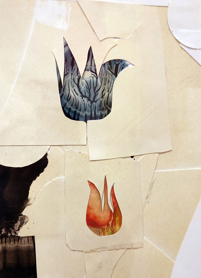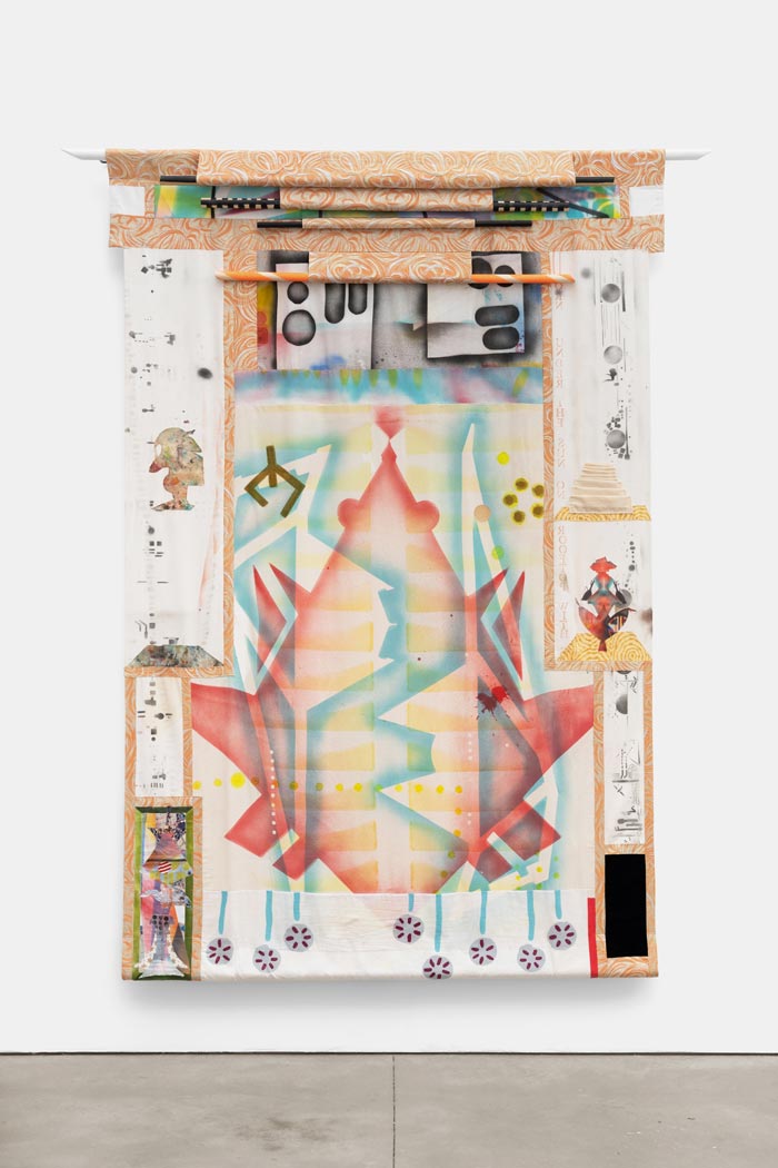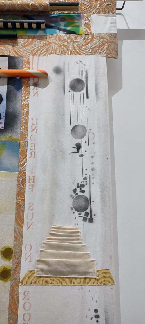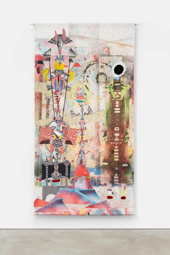 Vemos uma forma preta misteriosa habitar as telas, e também a negro, mãos que a mim me sugerem a delicadeza da pintura Flamenga do século XVII, que aliado à variedade de motivos orientais denuncia Laleh como um sucesso da diáspora. Porque digo isto? Porque penso que uma pessoa é bem-sucedida numa diáspora quando o seu poder criativo sintetiza e integra origem e destinos de forma poderosa, incontrita, elevando o trabalho e os seus espectadores com ele. Há uma carga muito feminina nestas composições que evocam o kimono como forma de arte, e nos quais vejo thangkas compostas por órgãos internos (foi nos órgãos que vi o feminino e curioso que na representação do corpo é que vi a alma), ou múltiplos gohonzons desconstruídos. Mas vejo também a poesia precisa dos jardins persas e os brocados e sedas de todo o oriente. Laleh nascida em Teerão, retrata uma arte verdadeiramente Nova Iorquina, onde o melting pot (caldeirão de culturas) vibra, pois ouço diferentes linguagens, cheiro culinárias distintas e presenças heterogéneas no seu trabalho, no entanto, tal como Ali Meghdadi intitula um ensaio sobre o seu trabalho de Synecdoche, também eu vi na obra de Khorramian o heterogêneo tornar-se homogêneo. Sub e conscientemente, a verticalidade da exposição influenciou a minha experiência da obra; mas foram as cores, a palete dos amarelos, dos cor-de-rosa e azuis mimosa que me transportaram para o espaço unificado entre o céu e a terra. Inserida num arco iris, sentindo o efeito prismático entre a luz e a os elementos do jardim, a sua obra transmitiu-me a tranquilidade do tempo a passar. Alguns dos títulos das obras de Khorramian despertam-nos para uma apreciação temporal, aquele momento de suspensão, transitório como o arco-íris, transitório como a função de um portal. Um estado de espírito não perene, que ao mesmo tempo só se consegue atingir através do acesso ao infinito. De certa forma, esses momentos, por mais que manifestamente em movimento, devido à sua unicidade são atemporais.
