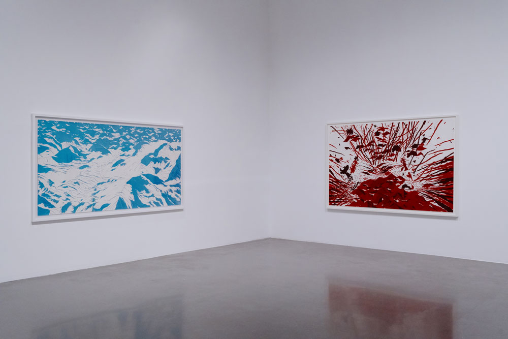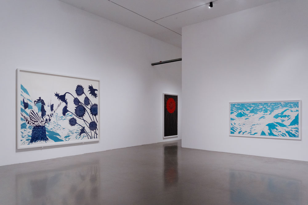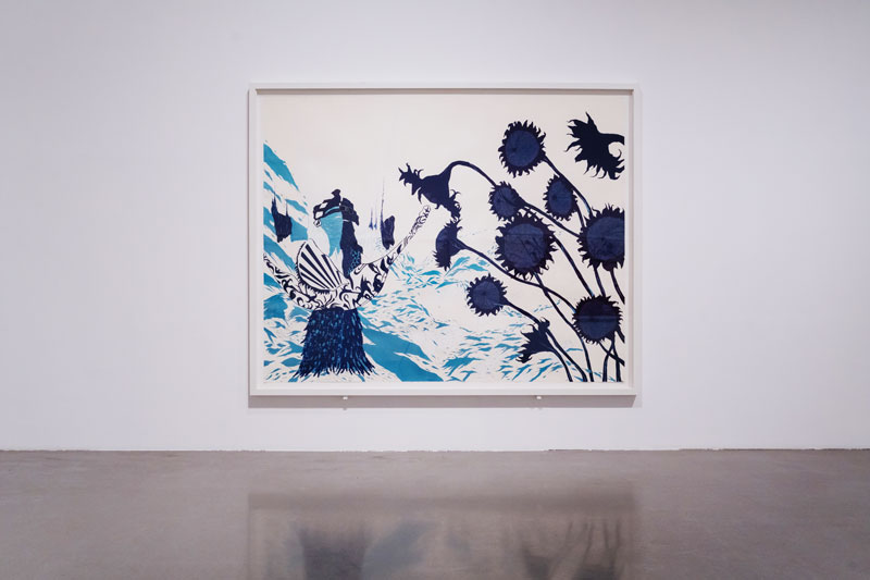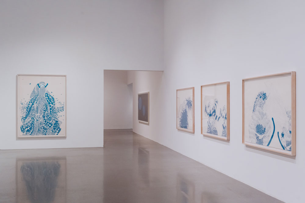 2. Porquê a bidimensionalidade? Moreira pinta o branco como uma essência, um anti-vazio, onde não poderia colocar o negro, ao negar-lhe uma cosmogonia. O branco é conduzido, no seu desenho, até à sua estrutura-base: a junção do espectro da luz visível, que tudo compreende, contraditório no seu aparente vazio. Nos melhores momentos da exposição, lembramo-nos, mais uma vez, da arte japonesa: Maruyama Okyo, e o seu Cracked Ice, no modo como o branco impõe uma atmosfera que tensiona a representação, mas, simultaneamente, lhe permite respirar; são especialmente belas as Seascapes, onde o branco é uma incógnita em que reside o essencial da composição: o horizonte da paisagem, as possíveis ondas que viriam contra uma possível costa, rendilhada a caneta (ou serão estas as ondas?). Deste branco tenso, dialético, que esconde e simultaneamente representa, passamos para o branco como ponto de partida, folha de papel, seriado. É nele que se inscrevem os símbolos – as cruzes, os círculos, ou os fundos da paisagem. Não deixa de compreender uma tensão, pela negação de uma dimensão perspética que permite a profundidade da imagem. Nas obras figurativas, a bidimensionalidade que convoca é frustrante, como uma auto-sabotagem, a consciencialização de um impedimento de aceder à paisagem que se representa. É aí que se estabelece a linguagem de Moreira. Mas ao invés de uma intimidade, a que a obsessão da sua prática aponta, a reflexão que sugere parece-nos ir mais ao encontro da banalidade da imagem comodificada, para sempre repetida, sem traços desviantes. Em Sou um gigante perdido numa floresta a arder, o que é que nos impele? A intensidade dos girassóis azuis, patologicamente minuciosos. O interesse inicial de uma planura quase fauvista, a lembrar os últimos trabalhos de Matisse. Mas o frustrante branco, já distenso, conduz a composição a uma neutralidade impressa, controladíssima, nunca permitindo um rasgo além do necessário. As suas paisagens são perfeitas, demasiado perfeitas, mesmo que emaranhadas. Lembramo-nos do trabalho de Pedro Gomes, onde a apatia de um semelhante branco parece testemunho de uma comodificação seriada da imagem; em certos momentos mais abstratos, vem-nos à memória os traçados robóticos de Leonel Moura; paradoxais comparações numa obra feita de labor contínuo, e de um cansaço que se transcende.